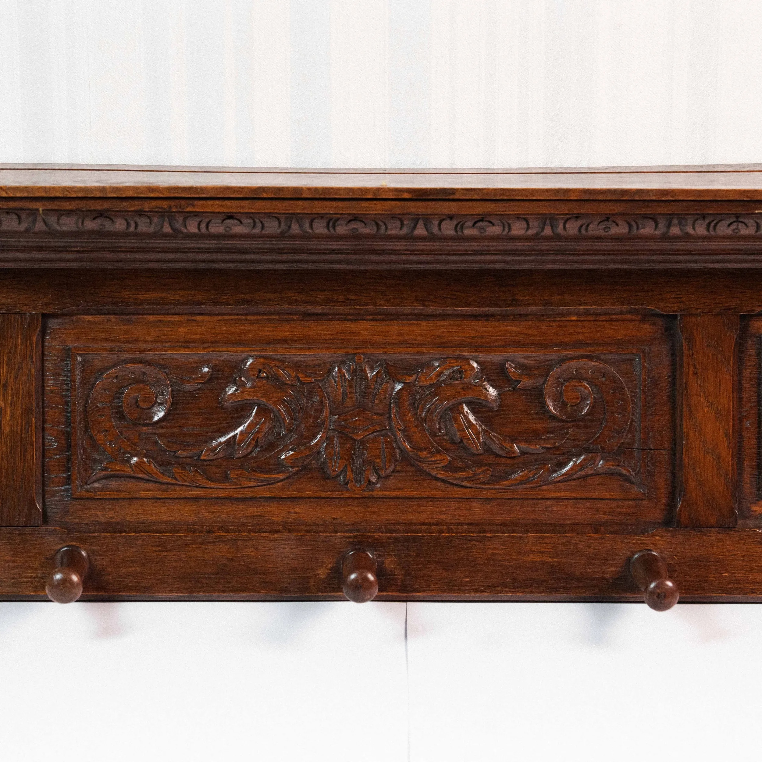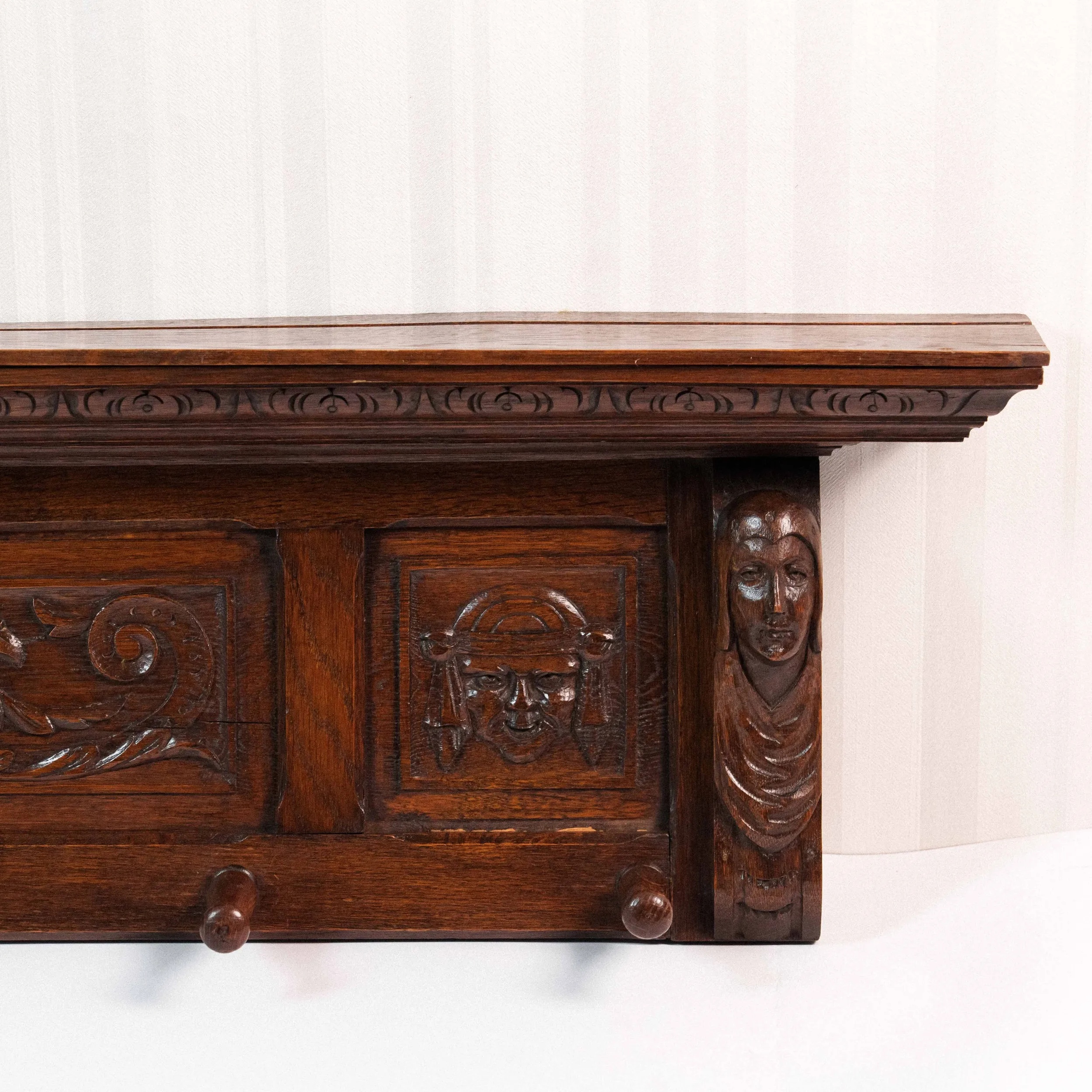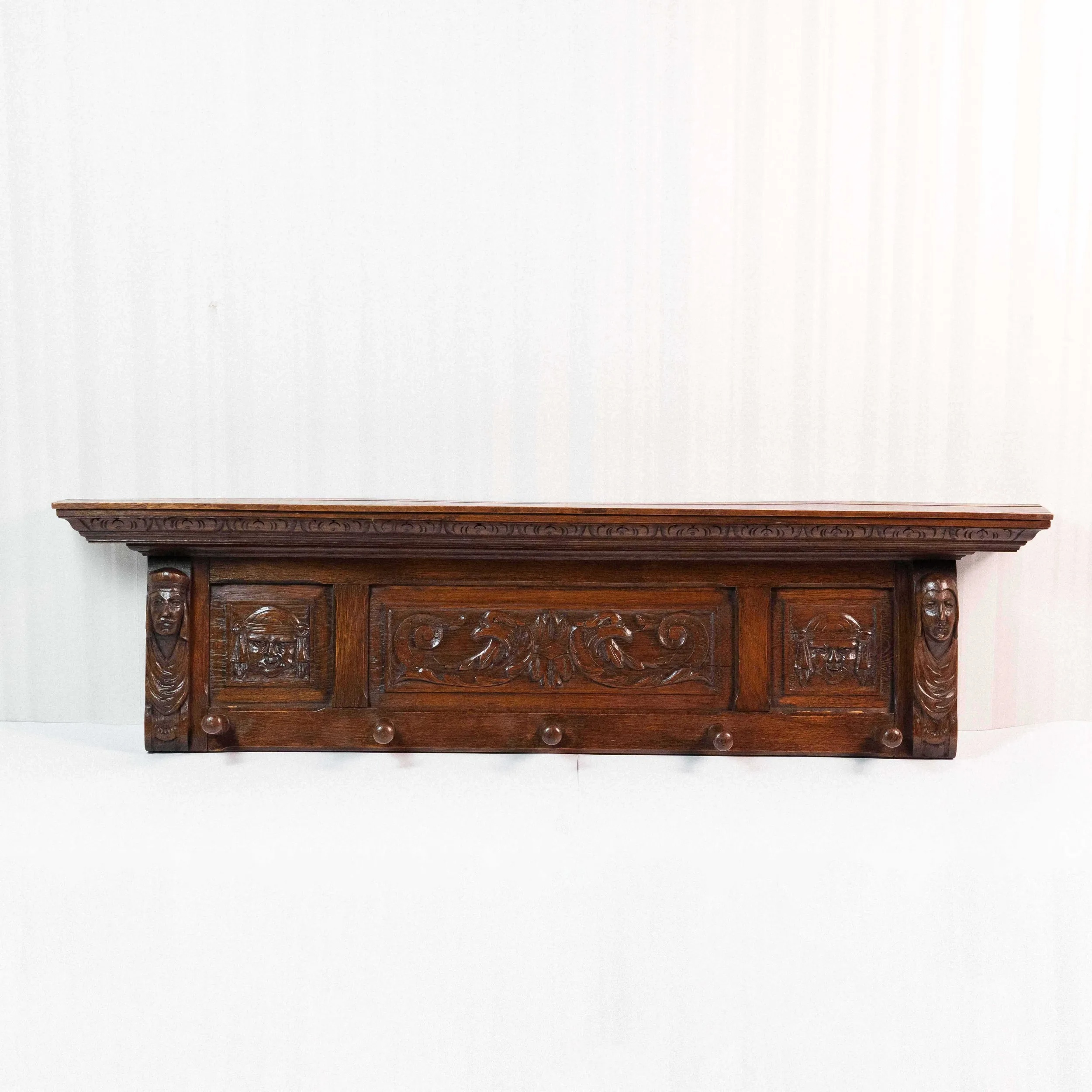 Элегантная настенная вешалка в классическом стиле, выполненная из натурального дерева с богатой художественной резьбой. Фасад украшен изысканными декоративными панелями и выразительными резными элементами, придающими предмету благородный и статусный вид.