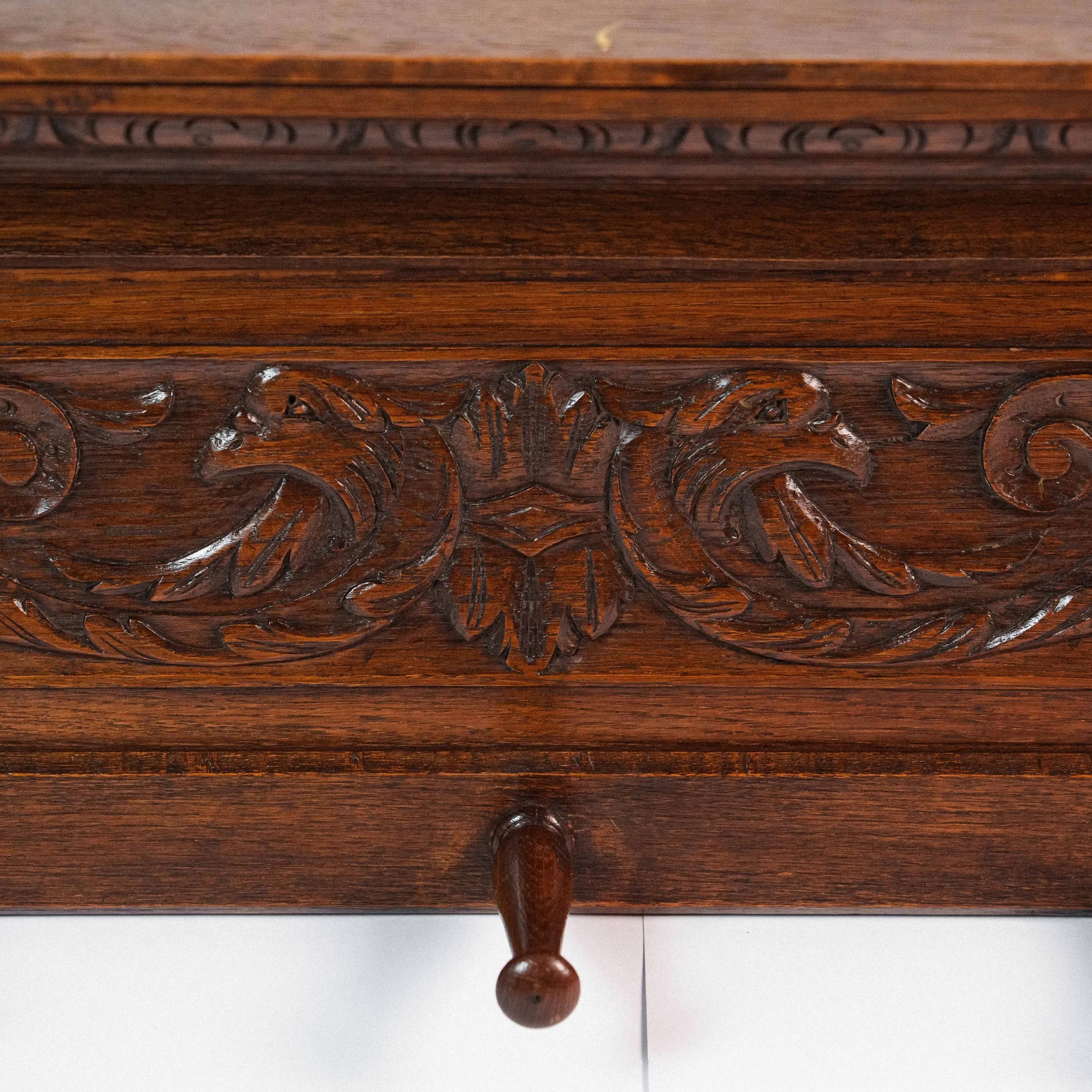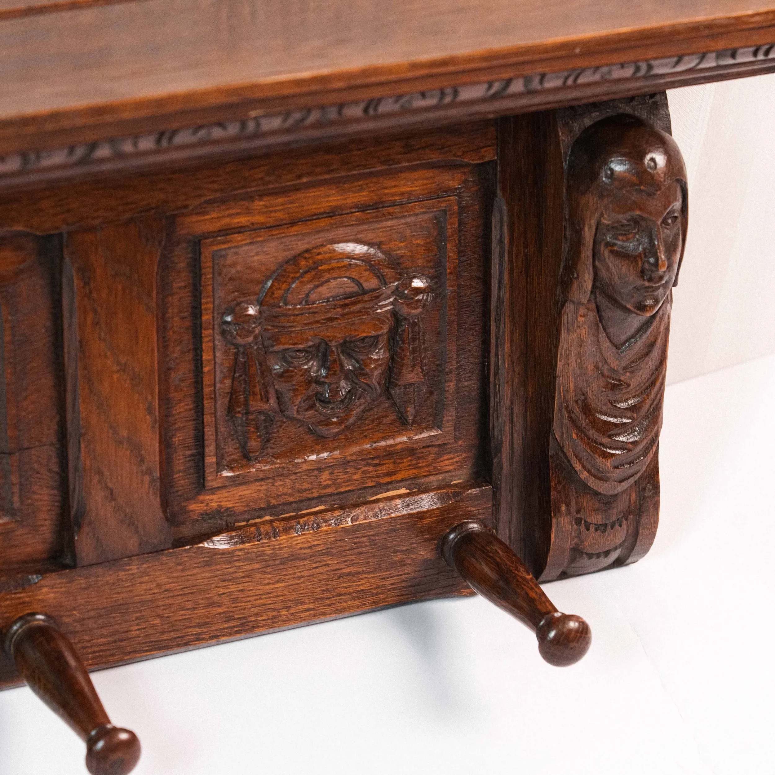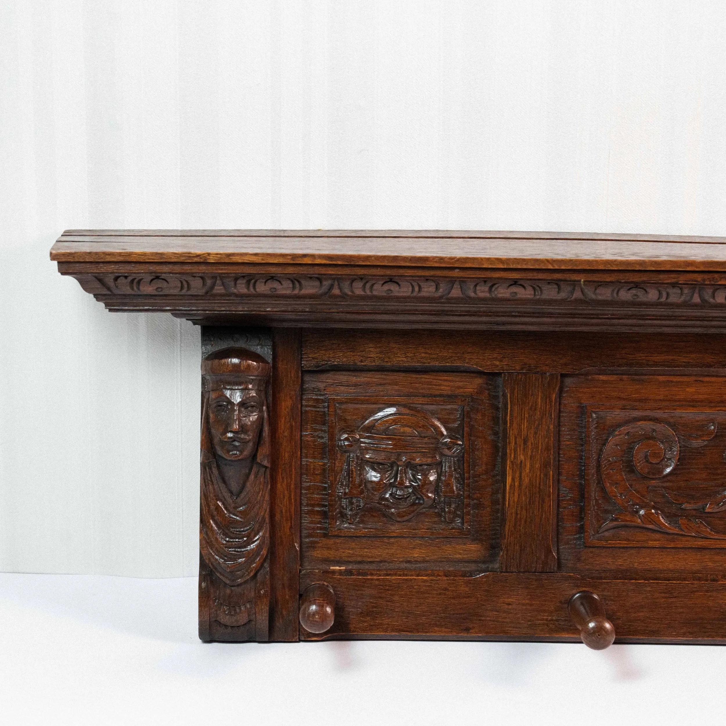Элегантная настенная вешалка в классическом стиле, выполненная из натурального дерева с богатой художественной резьбой. Фасад украшен изысканными декоративными панелями и выразительными резными элементами, придающими предмету благородный и статусный вид.