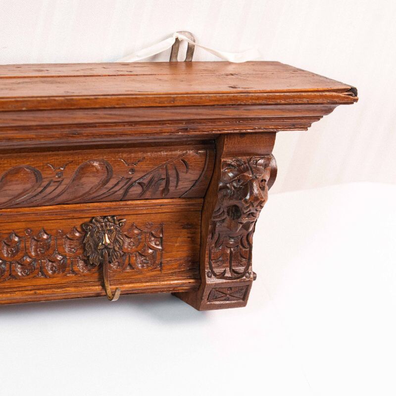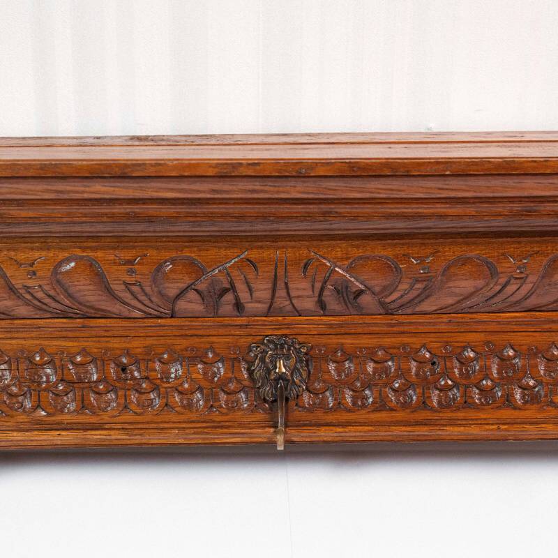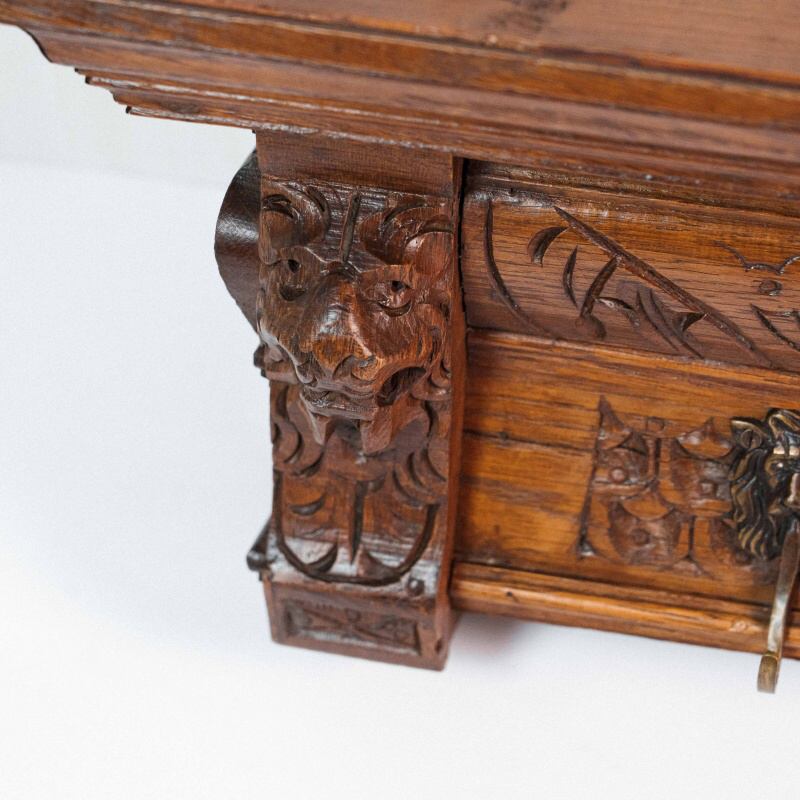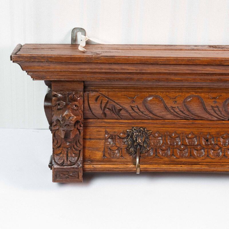 Статусная настенная вешалка из натурального дерева, выполненная в классическом европейском стиле с богатой художественной резьбой. Изделие выделяется выразительными резными фигурами львов по бокам, символизирующими силу, защиту и благородство.