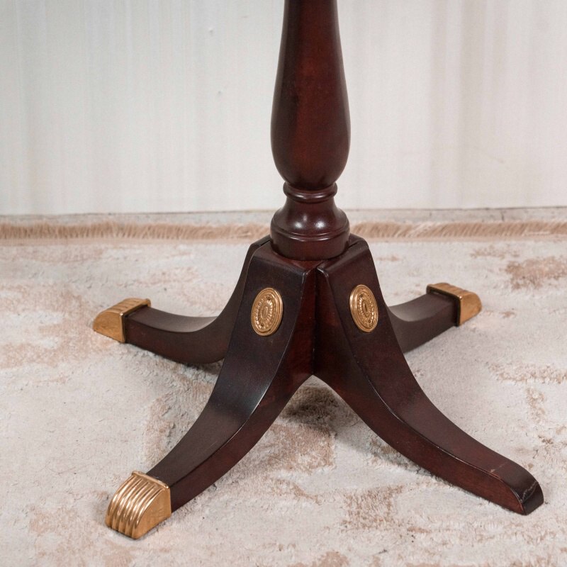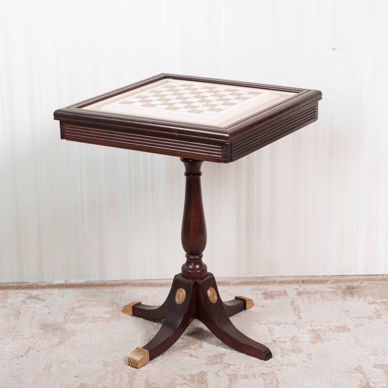 Прекрасный шахматный стол. Съемная верхняя часть с двумя ящиками и ножка из темного дерева. Доска выполнена из полимера, резные части украшены жидким золотом. Ножка украшена декоративными элементами из бронзы.