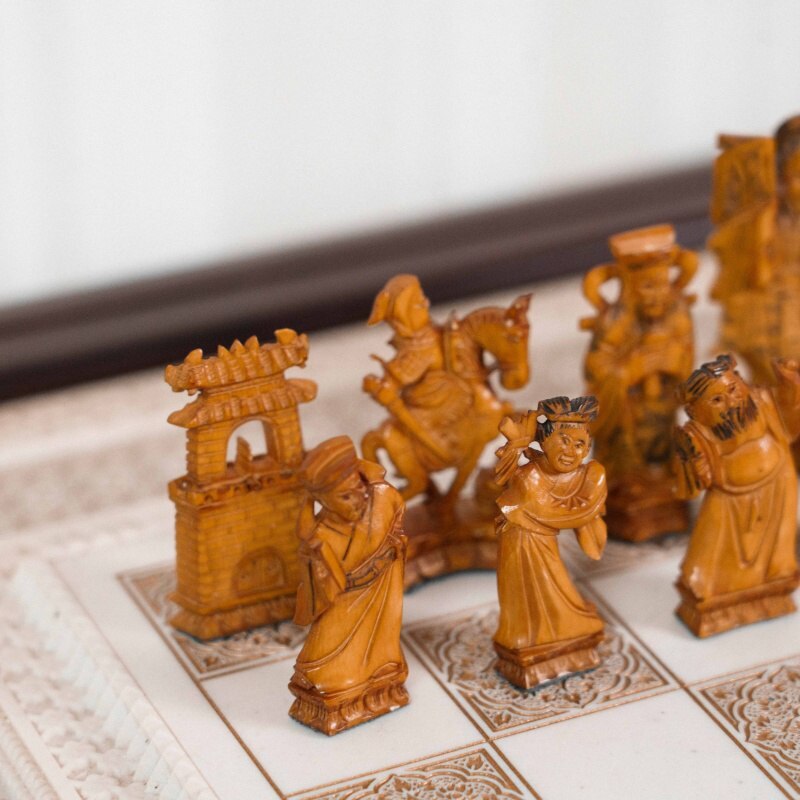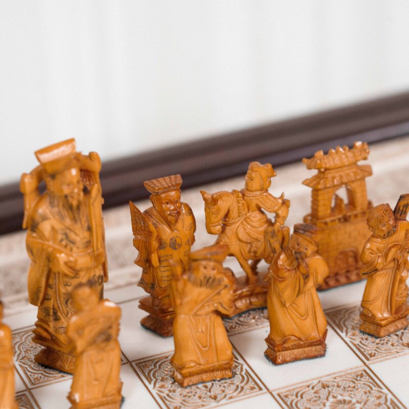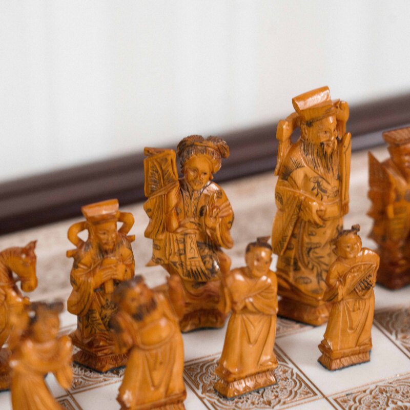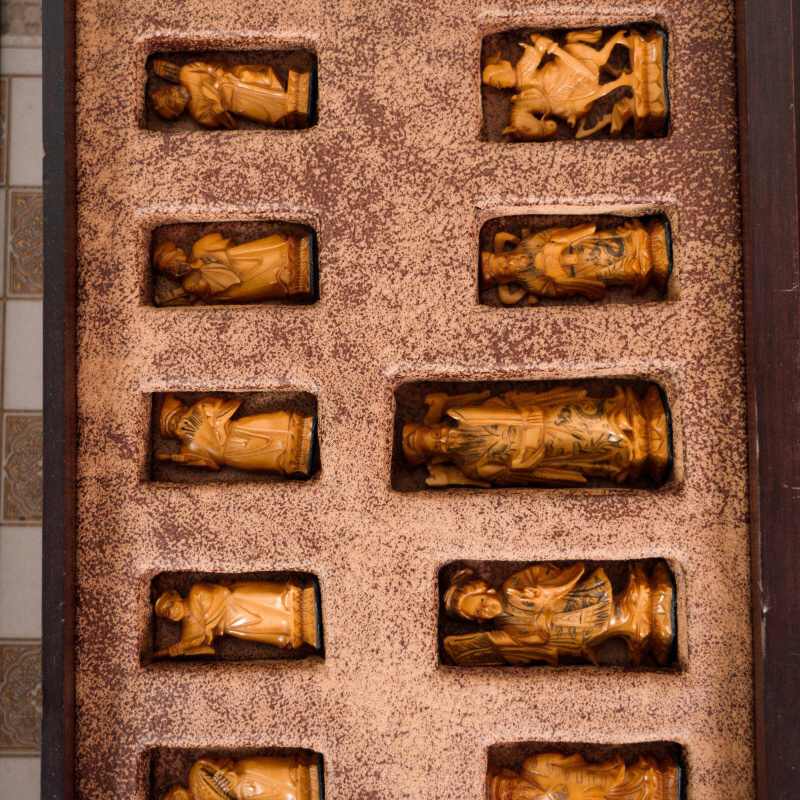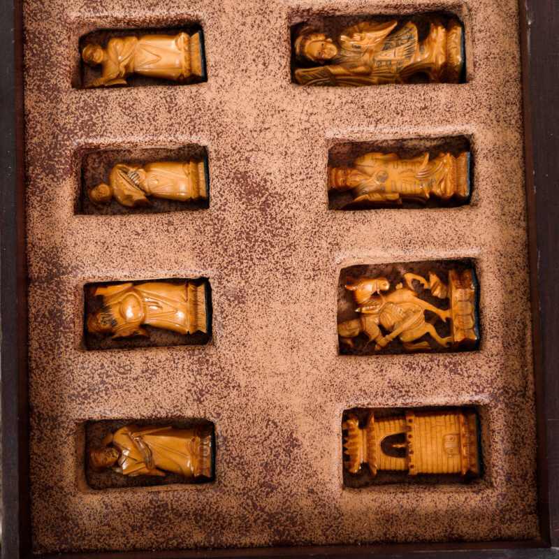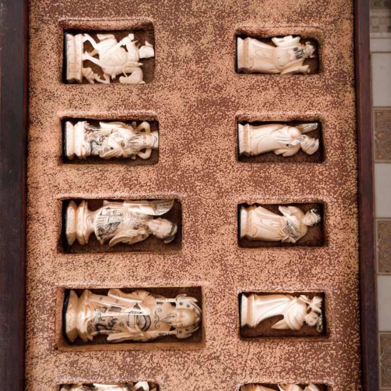 Антикварные шахматы, выполненные из слоновой кости в технике художественно-скульптурной ручной резьбы. Шахматные фигуры представляют собой соответствующих «персонажей» игры. Набор состоит из мини-скульптур: пешки выполненные как 8 даосских бессмертных, короля и ферзя мастер изобразил как императора и императрицу в богатых одеждах и символизируют семейную гармонию и священную семью. Офицеры изображены в качестве императорских советников, ладьи — в виде башен, кони выполнены в виде всадников. Резьба по слоновой кости является самым древним видом декоративно-прикладного искусства и насчитывает уже несколько тысяч лет. Техника резьбы отличается тонкостью, роскошным декором и сложностью изготовления предмета. Наибольшим почетом пользовалась исключительно резьба по слоновой кости.
