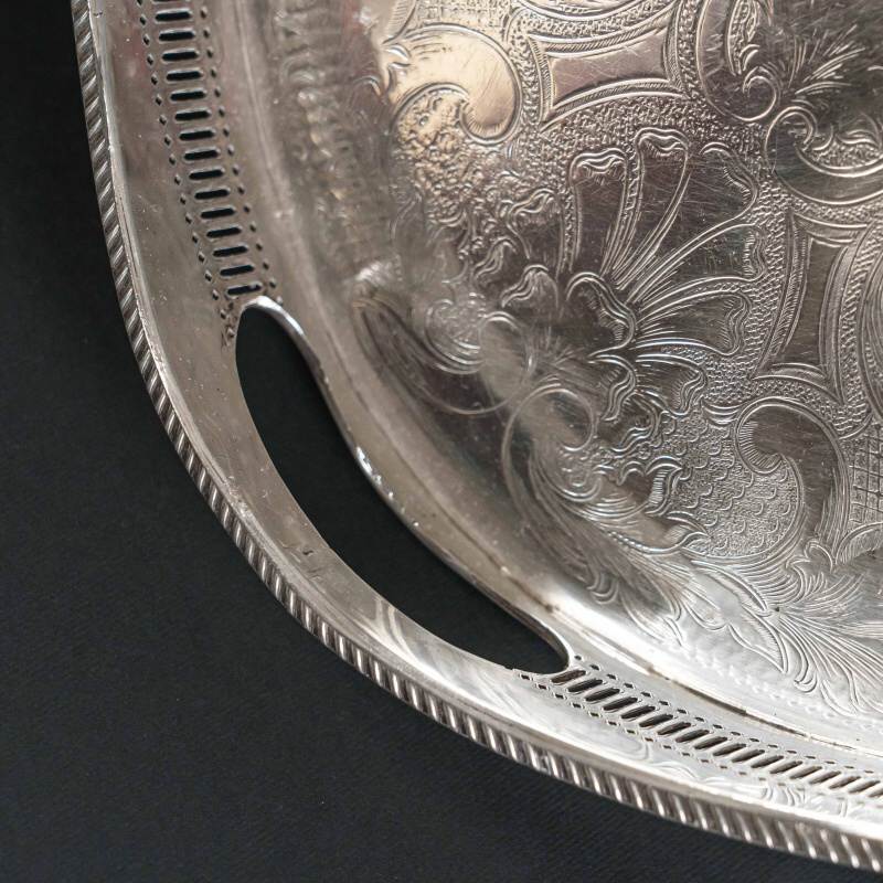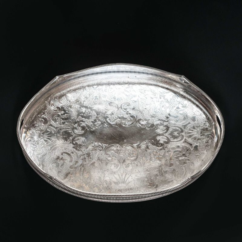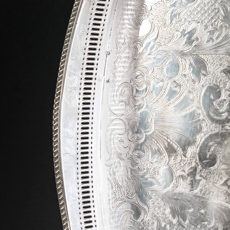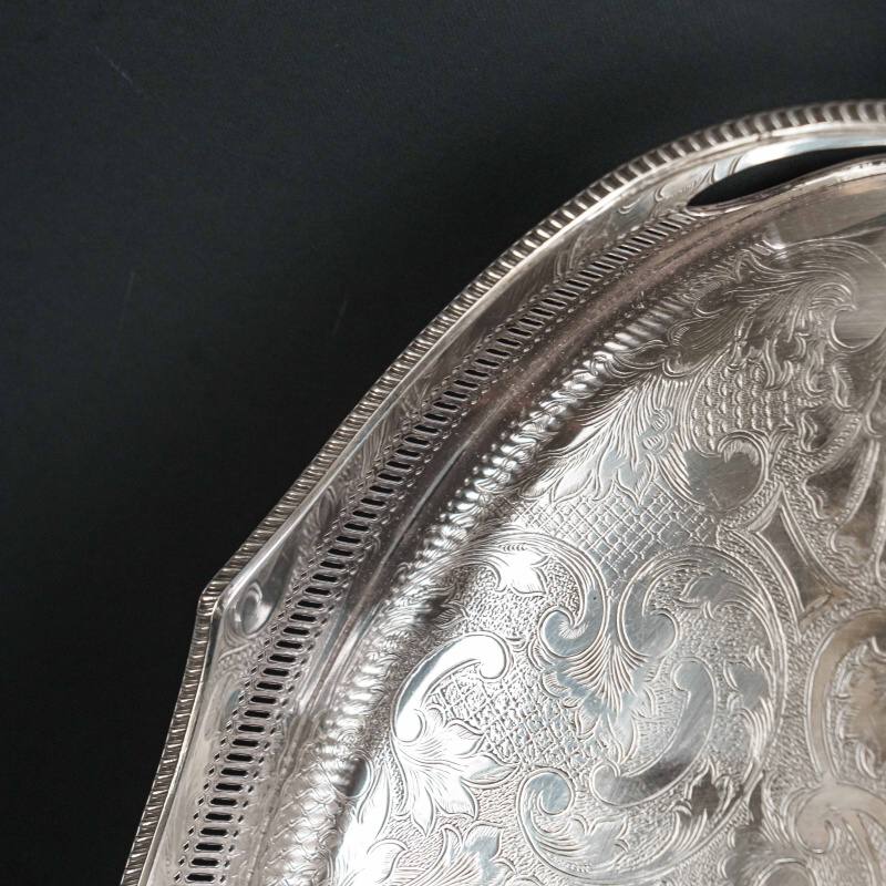 Поднос овальной формы, изготовлен в Шеффилде (Великобритания), выполнен в лучших традициях шеффилдского серебрения XIX-XX веков. Поднос выполнен из посеребренного металла с применением техники серебрения. Эта технология позволяет сочетать прочность основного металла с блеском и долговечностью серебряного покрытия. Центральная часть подноса декорирована гравированным орнаментом, выполненном в классическом стиле. Края оформлены рельефным кантом с перфорацией, что придает изделию воздушность и утонченность. Ручки выполнены как часть краев, обеспечивая удобство при использовании.