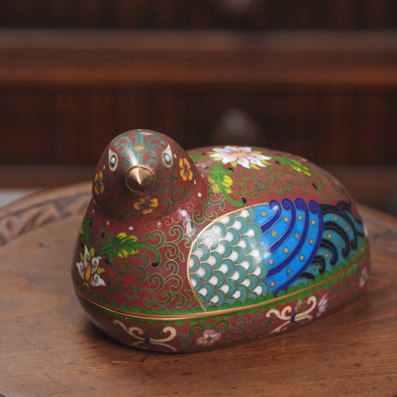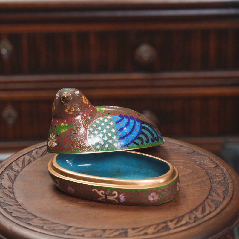 Изысканная шкатулка в форме перепёлки выполнена в технике перегородчатой эмали (клуазоне). Корпус изделия создан в виде стилизованной птицы с округлыми формами. Верхняя часть представляет собой крышку, внутри шкатулка покрыта бирюзовой эмалью. Внешние поверхности декорированы богатым орнаментом: фон насыщенного красно-коричневого цвета украшен витиеватыми золотыми завитками, на крыльях изображены чешуйчатые и перьевидные узоры в синих и бирюзовых тонах, дополненные золотыми точками. Спину перепёлки украшают цветочные мотивы, исполненные яркими эмалевыми красками — розовыми, белыми и зелёными. Клюв и обрамление корпуса выделены полированным металлом с золотистым блеском.