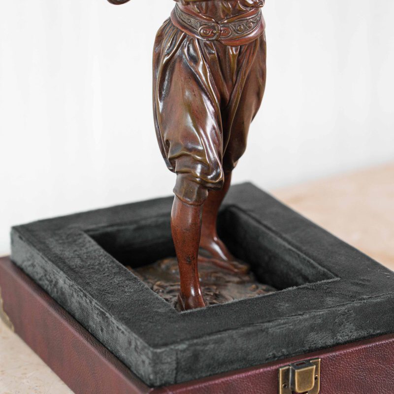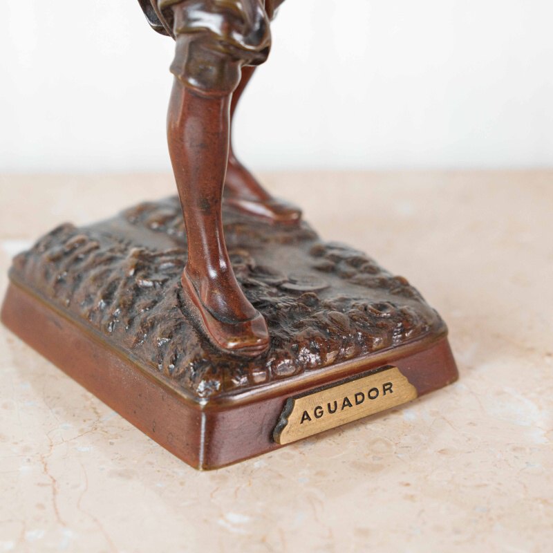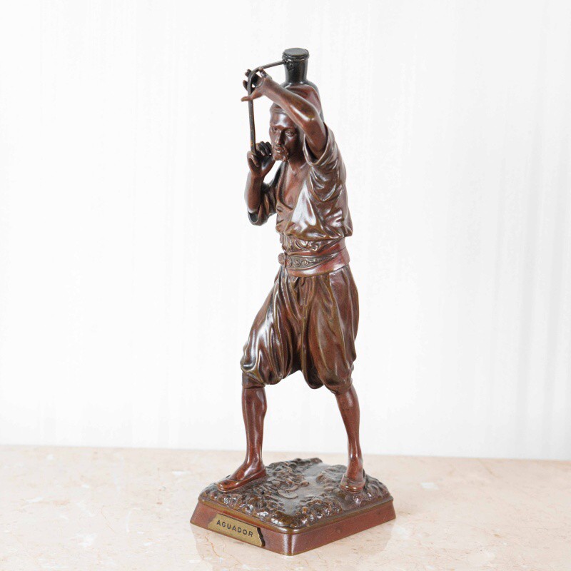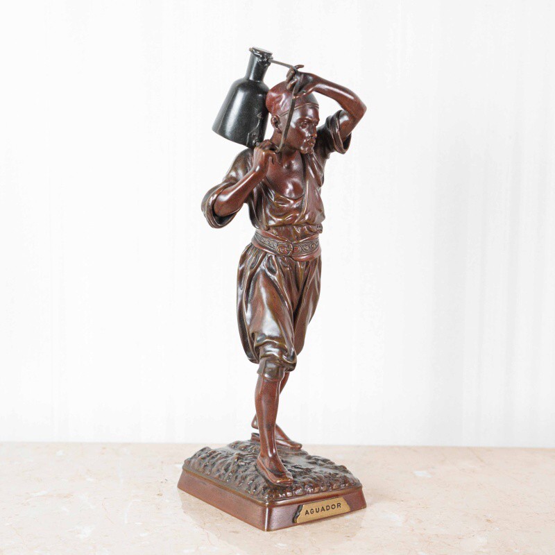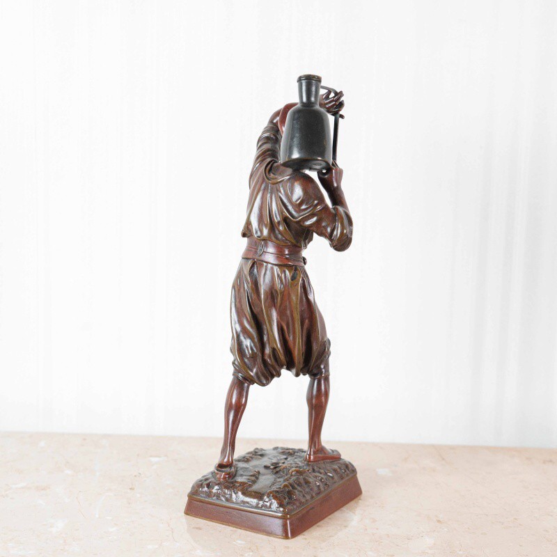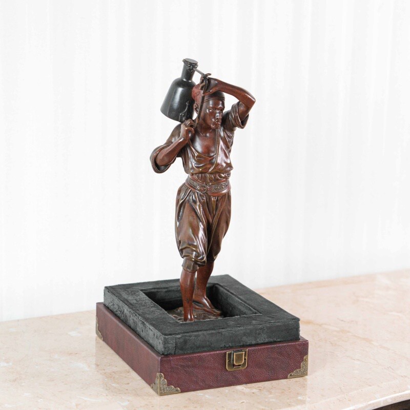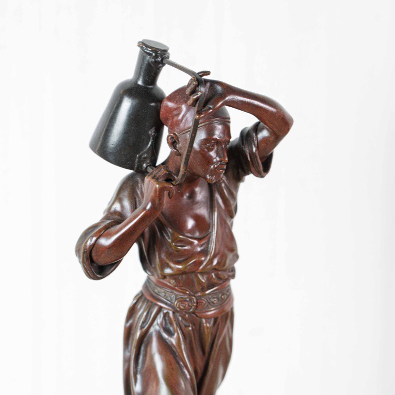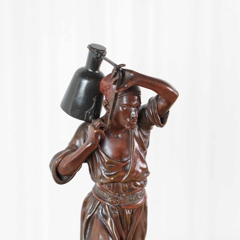 Скульптура изображает водоноса — человека, чья профессия была важной частью повседневной жизни восточных городов XIX века. Мастер точно передал момент движения: фигура словно застигнута в шаге, корпус слегка наклонен вперед, а руки удерживают тяжелый сосуд, создавая ощущение реального веса и физического напряжения. Особое внимание уделено деталям: проработке лица, жестам рук, линии пояса и фактуре ткани, что делает образ убедительным и цельным.