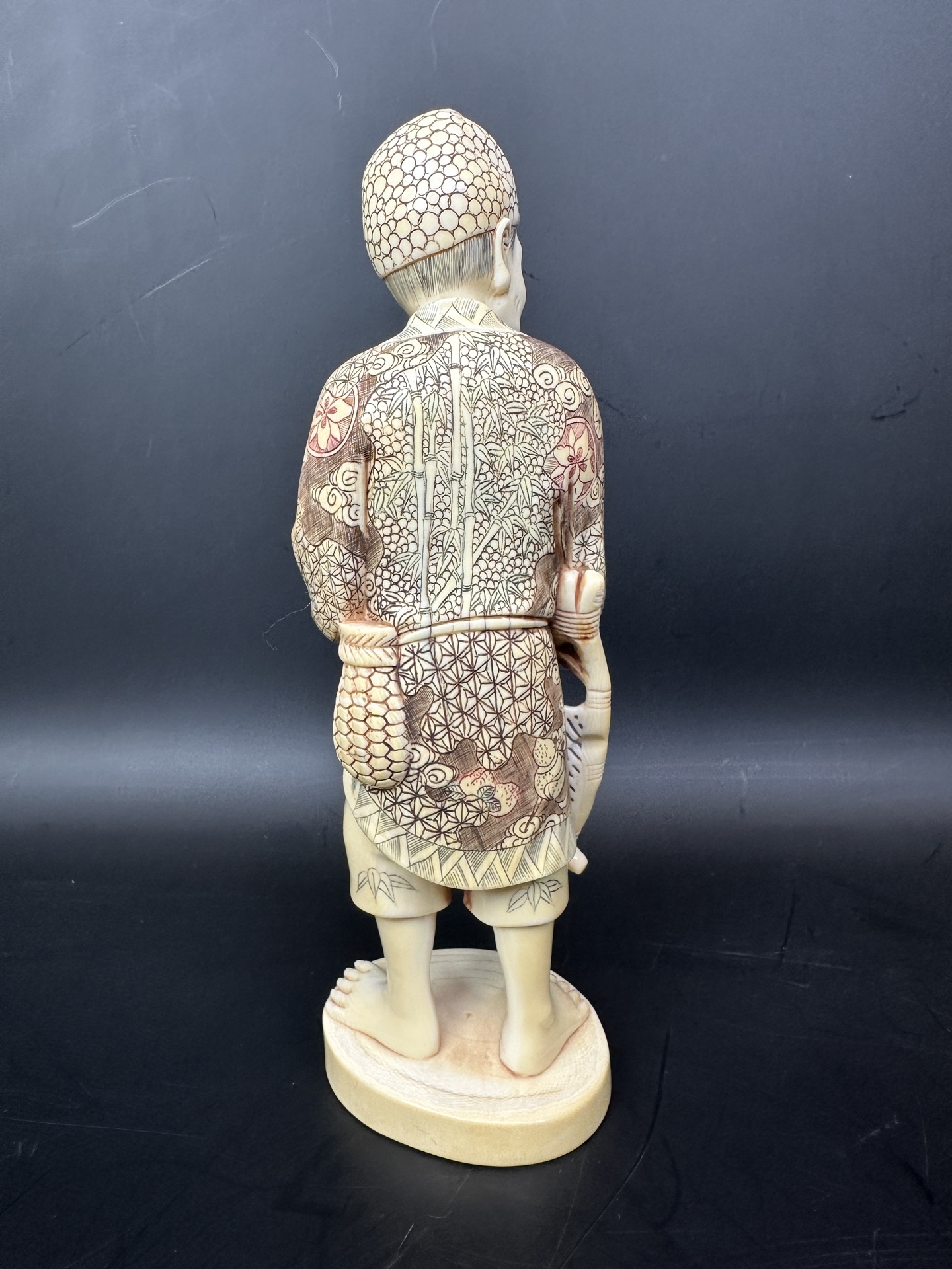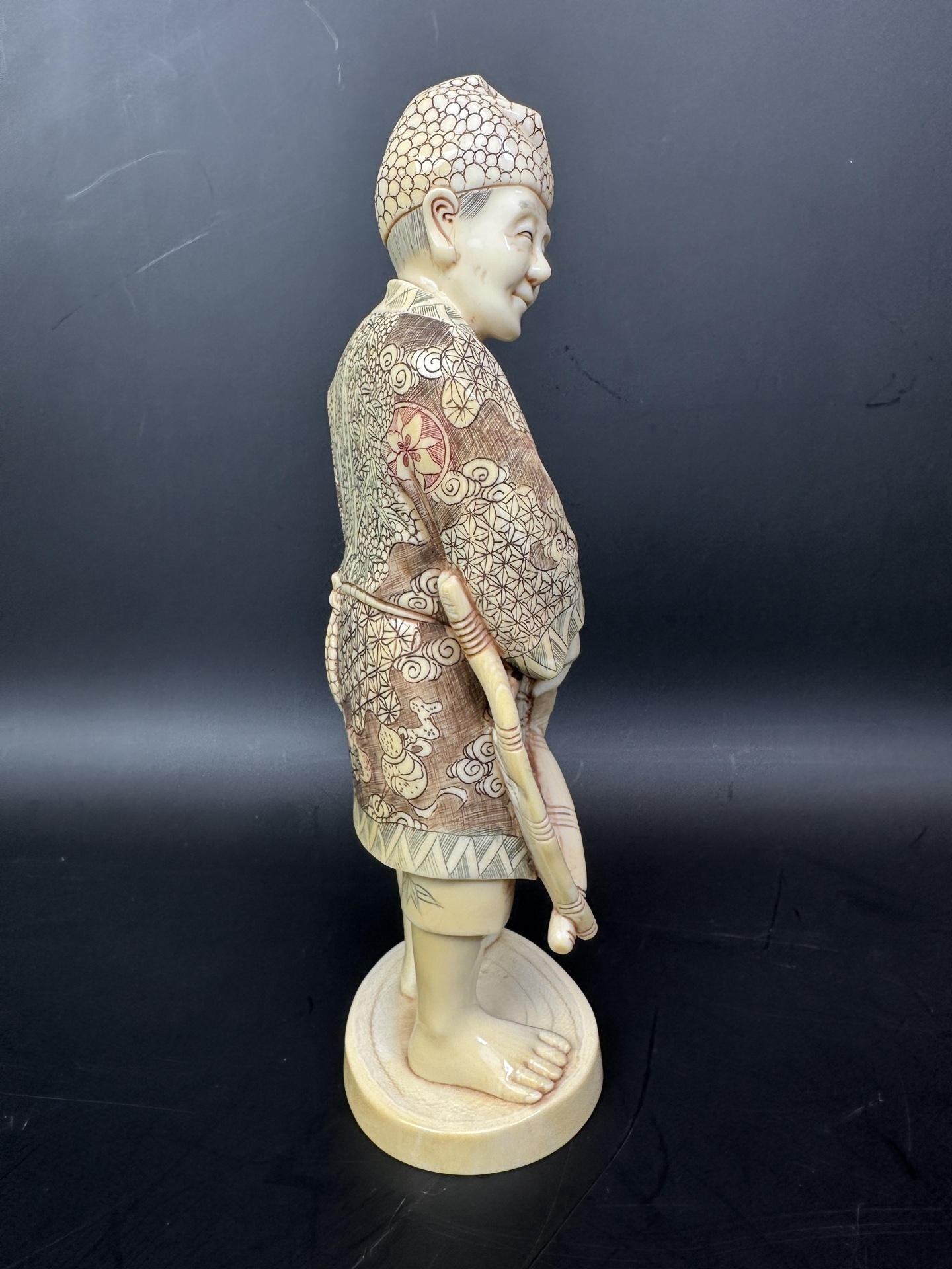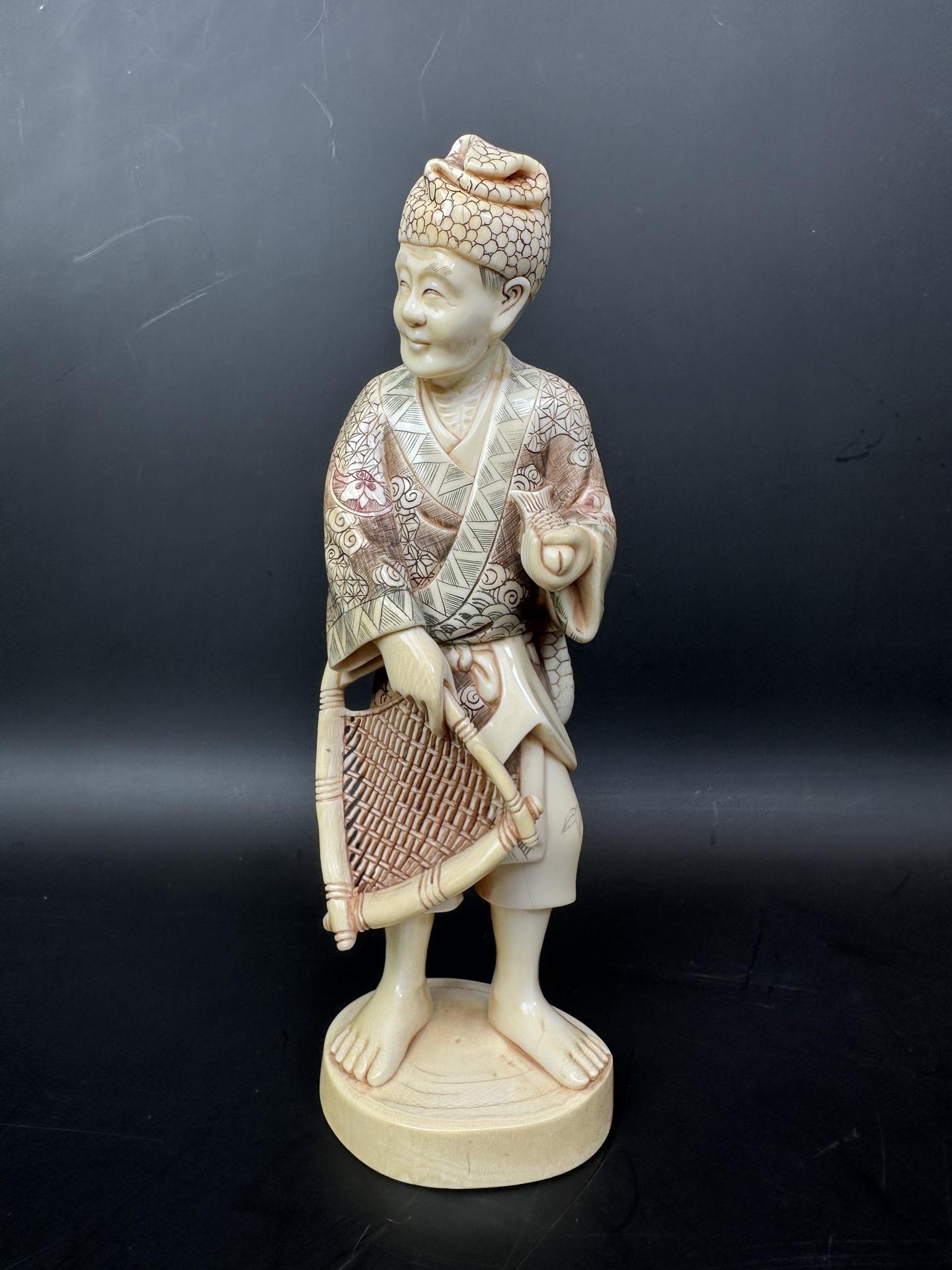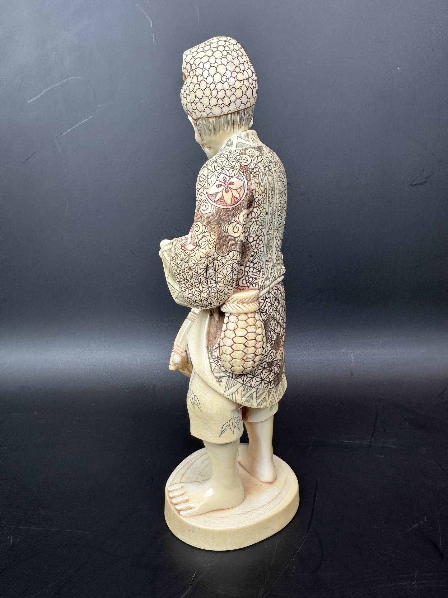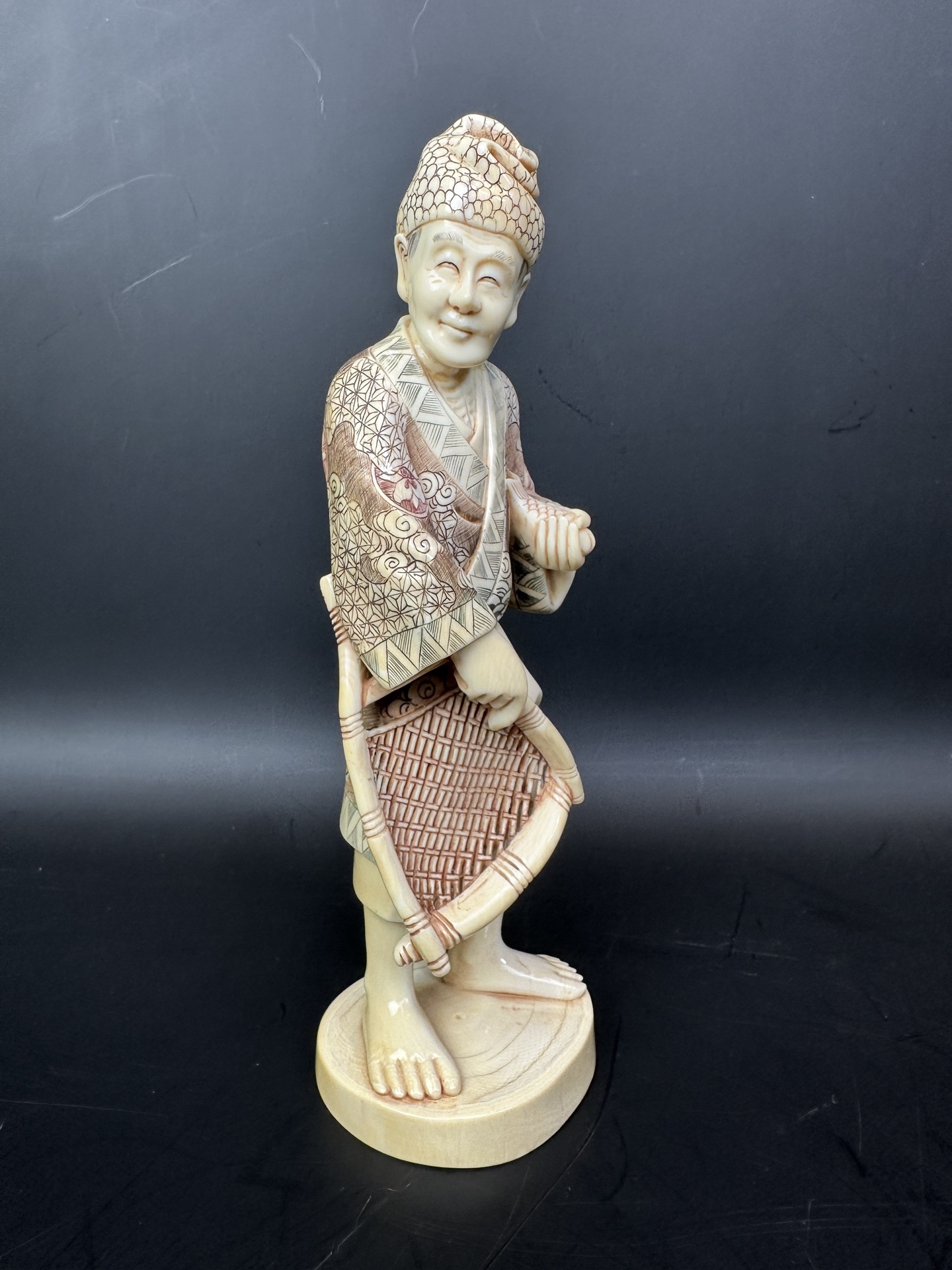 Статуэтка выполнена из слоновой кости, с детальной проработкой узоров на одежде и головном уборе.
