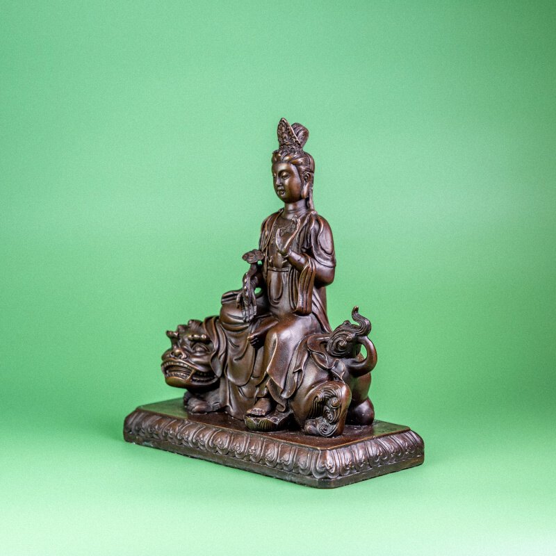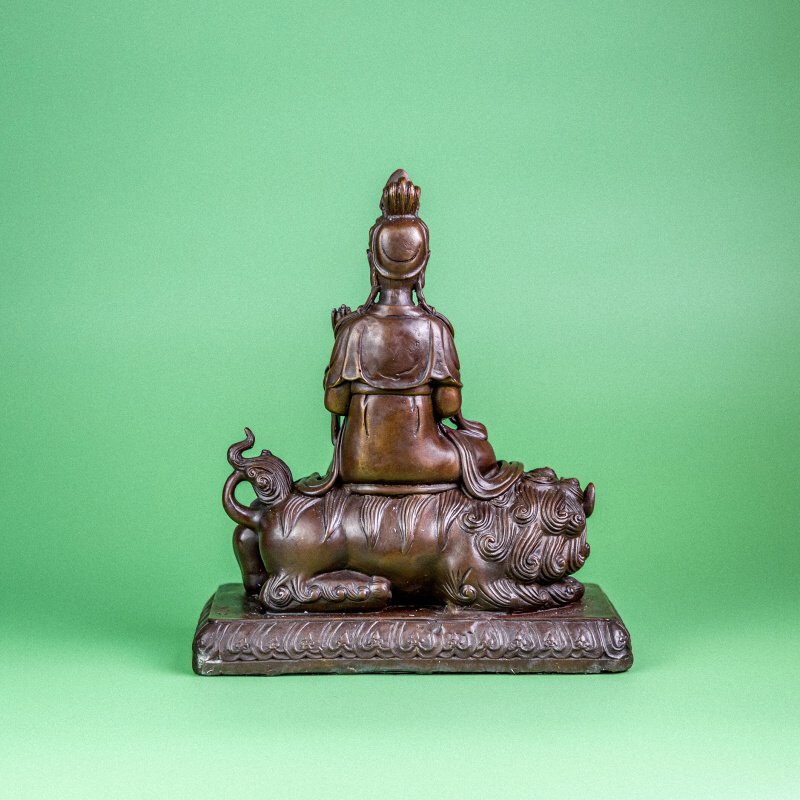 Скульптурное изображение Бодхисаттвы Манджушри, выполненное из патинированной бронзы. Манджушри — очень важный персонаж в пантеоне буддизма, является ключевым персонажем во многих древних текстах. Он представляет собой воплощение высшей мудрости, разума, воли, всеведения и полного просветления. Чаще всего его изображают сидящим в позе лотоса, держащим меч мудрости, символ отсечения неведения (невежества).