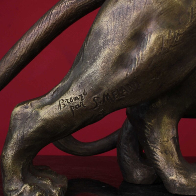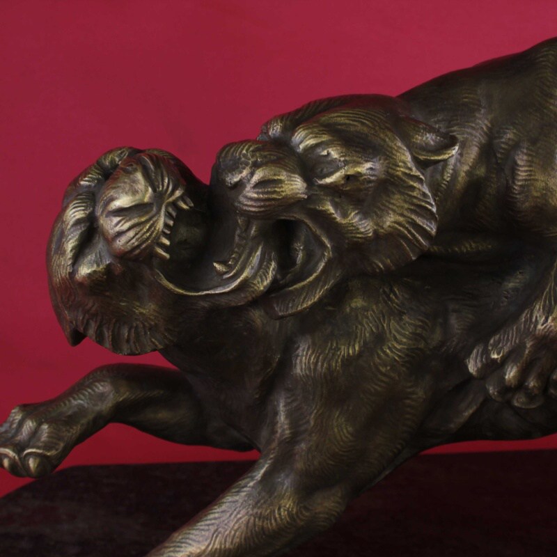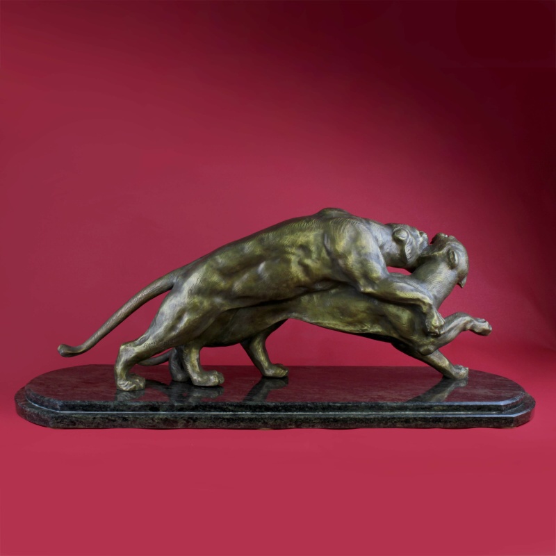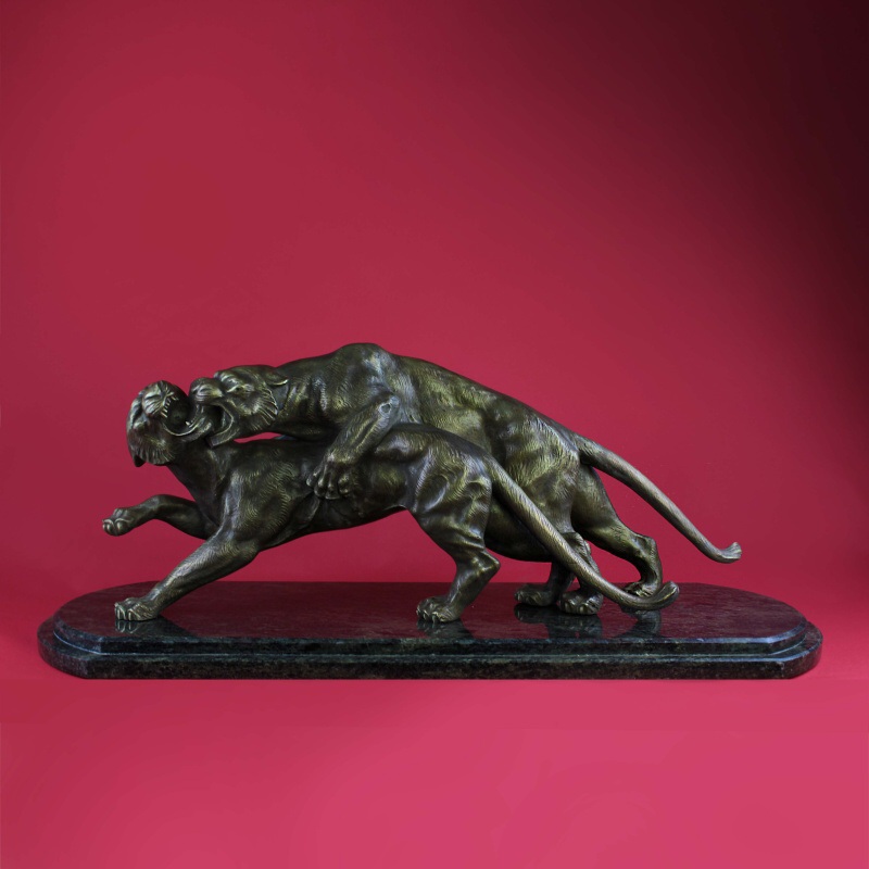 Бронзовая скульптура в стиле Ар-Деко, изображающая двух играющих тигров (барсов) на мраморном постаменте. Тигр — символ энергии силы и успеха. На Дальнем Востоке тигр считается символом благородства и счастья. На Западе олицетворяет власть и мужество. Автором данной композиции является итальянский скульптор — Salvatore Melani, работавший в I половине XX века.