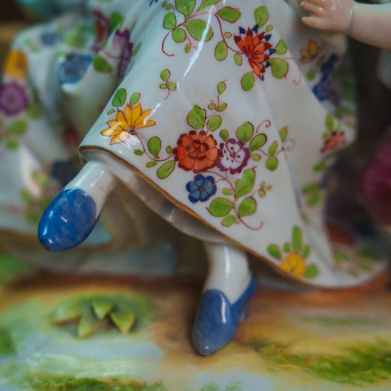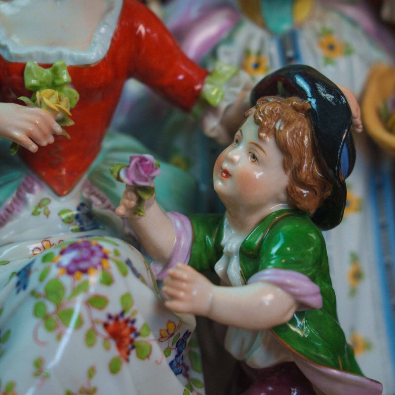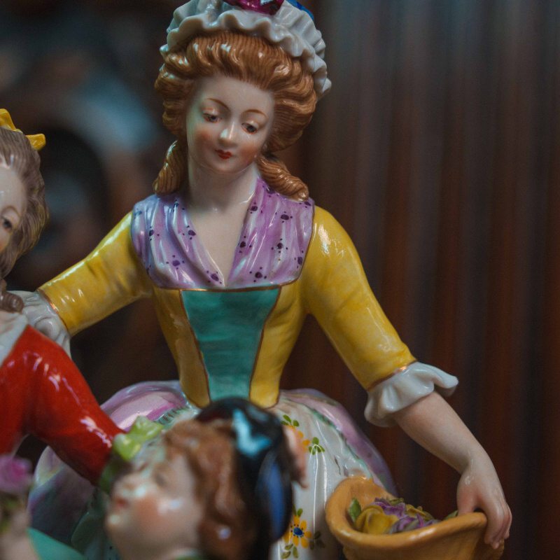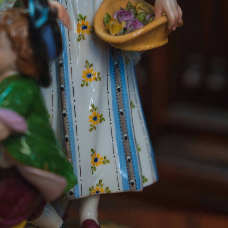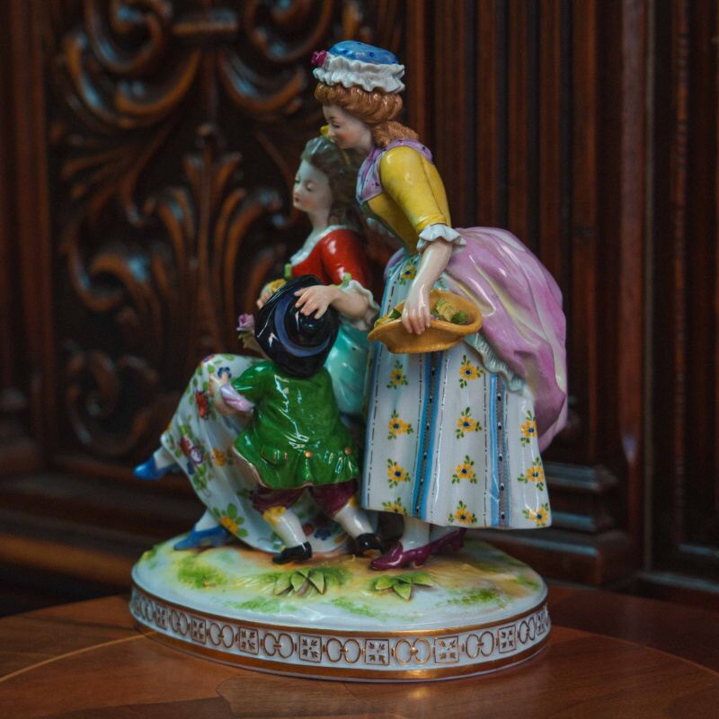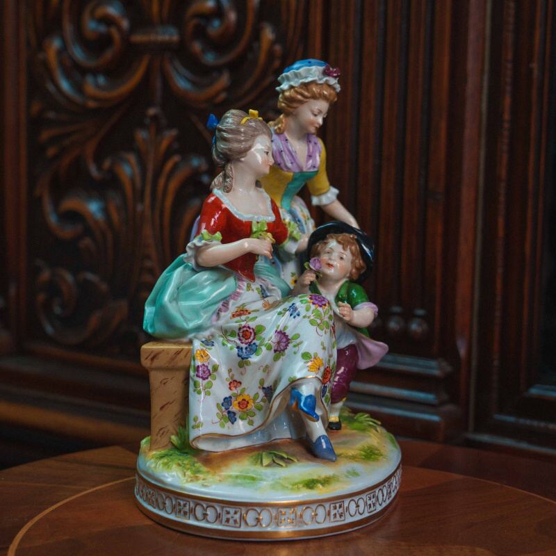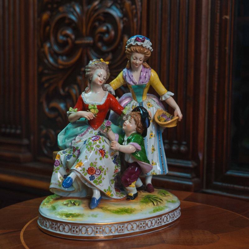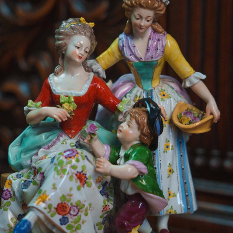 Рядом находятся две дамы: одна сидит на скамье, другая стоит с корзиной цветов, наблюдая за происходящим. Фигуры выполнены аккуратно, с мягкими чертами лиц и естественными позами.