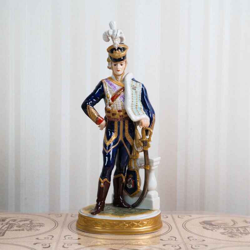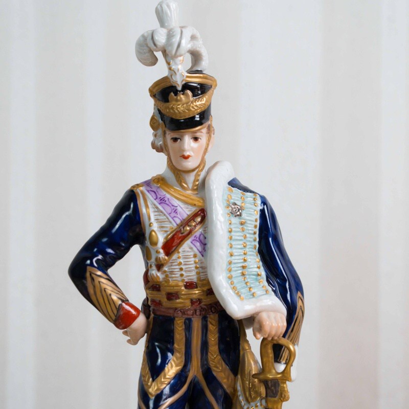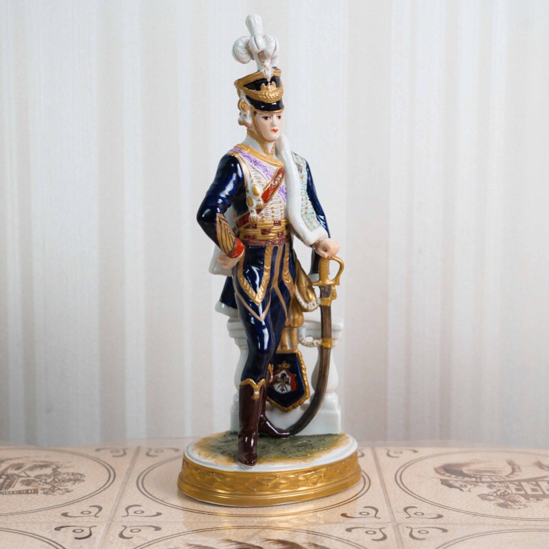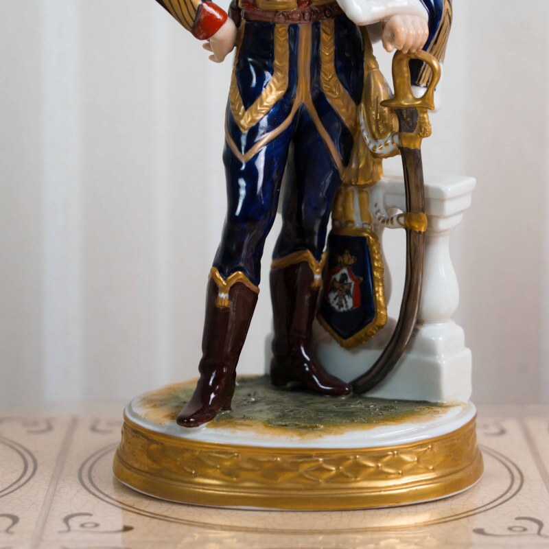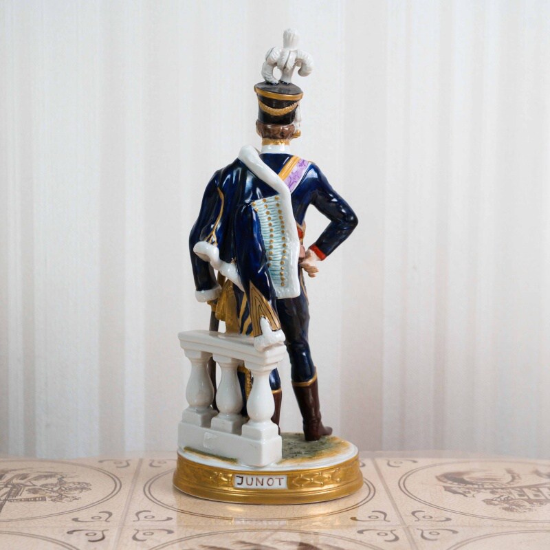 Фарфоровая статуэтка изображает одного из самых ярких военачальников наполеоновской эпохи — Жана Андоша Жюно (1771–1813), ближайшего сподвижника Наполеона Бонапарта. Генерал представлен в парадном мундире французской армии начала XIX века, с саблей и характерными знаками отличия, что подчёркивает его высокий статус и воинское достоинство. Композиция дополнена архитектурным элементом постамента, усиливающим торжественный и мемориальный характер образа.