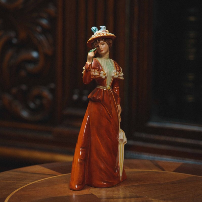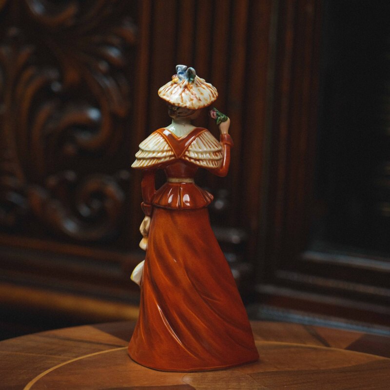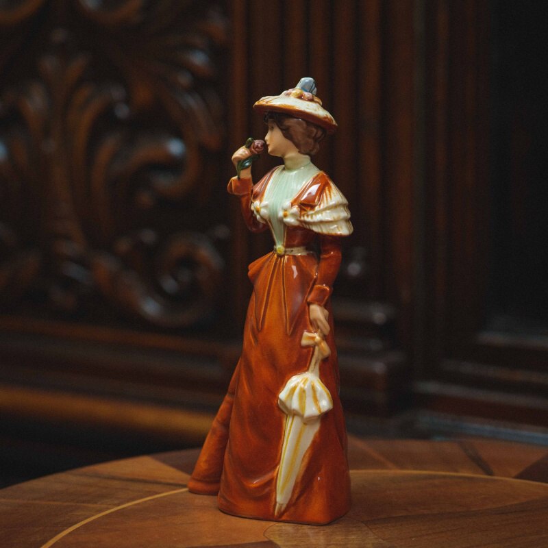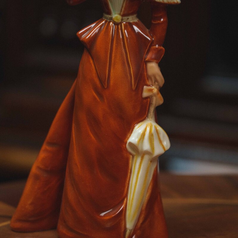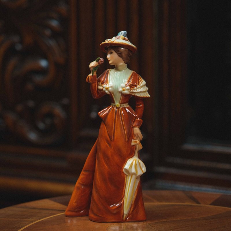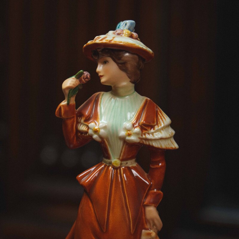 Утонченная фарфоровая статуэтка, изображающая элегантную даму в прогулочном наряде конца XIX века. Образ построен на утонченной светской сцене: молодая женщина, слегка повернувшись в сторону, держит у лица цветок, наслаждаясь его ароматом, а в другой руке — изящный зонт, подчеркивающий характер неспешной прогулки. Лёгкий поворот корпуса и наклон головы придают композиции живость, а аккуратно проработанные черты лица создают спокойное, мечтательное выражение. Наряд выполнен с вниманием к деталям: приталенный лиф, декоративные элементы на плечах и широкополая шляпа с рельефным декором формируют цельный и выразительный силуэт.
