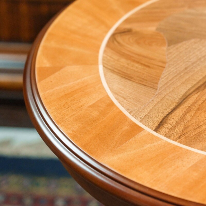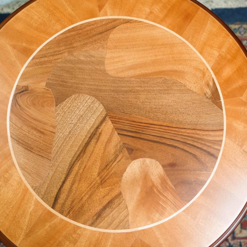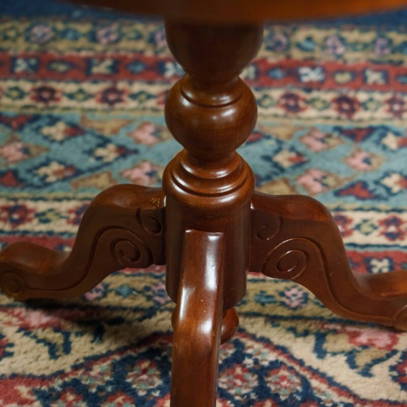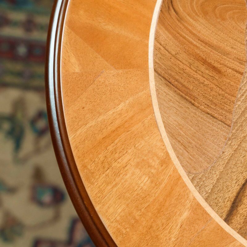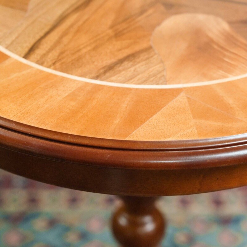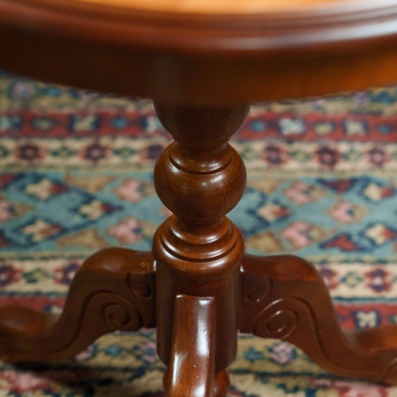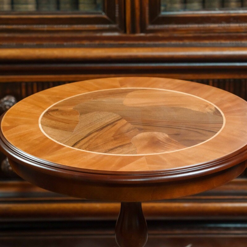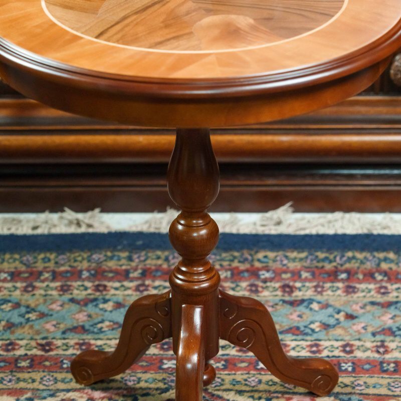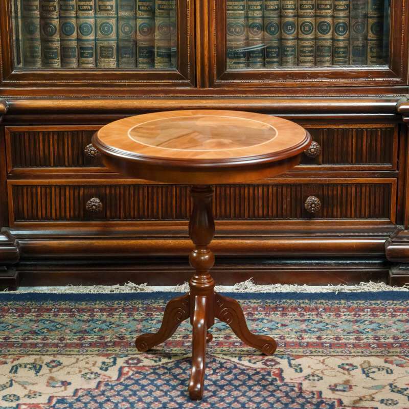 Элегантный антикварный столик — это настоящий шедевр мебельного искусства. Его круглая столешница, украшенная инкрустацией из разных пород дерева, придаёт ему утончённость и благородство. Резная фигурная ножка, переходящая в три изогнутые опоры, обеспечивает устойчивость и подчёркивает классический стиль. Такой столик станет прекрасным акцентом в любом интерьере, добавив в него нотку истории и изысканности.