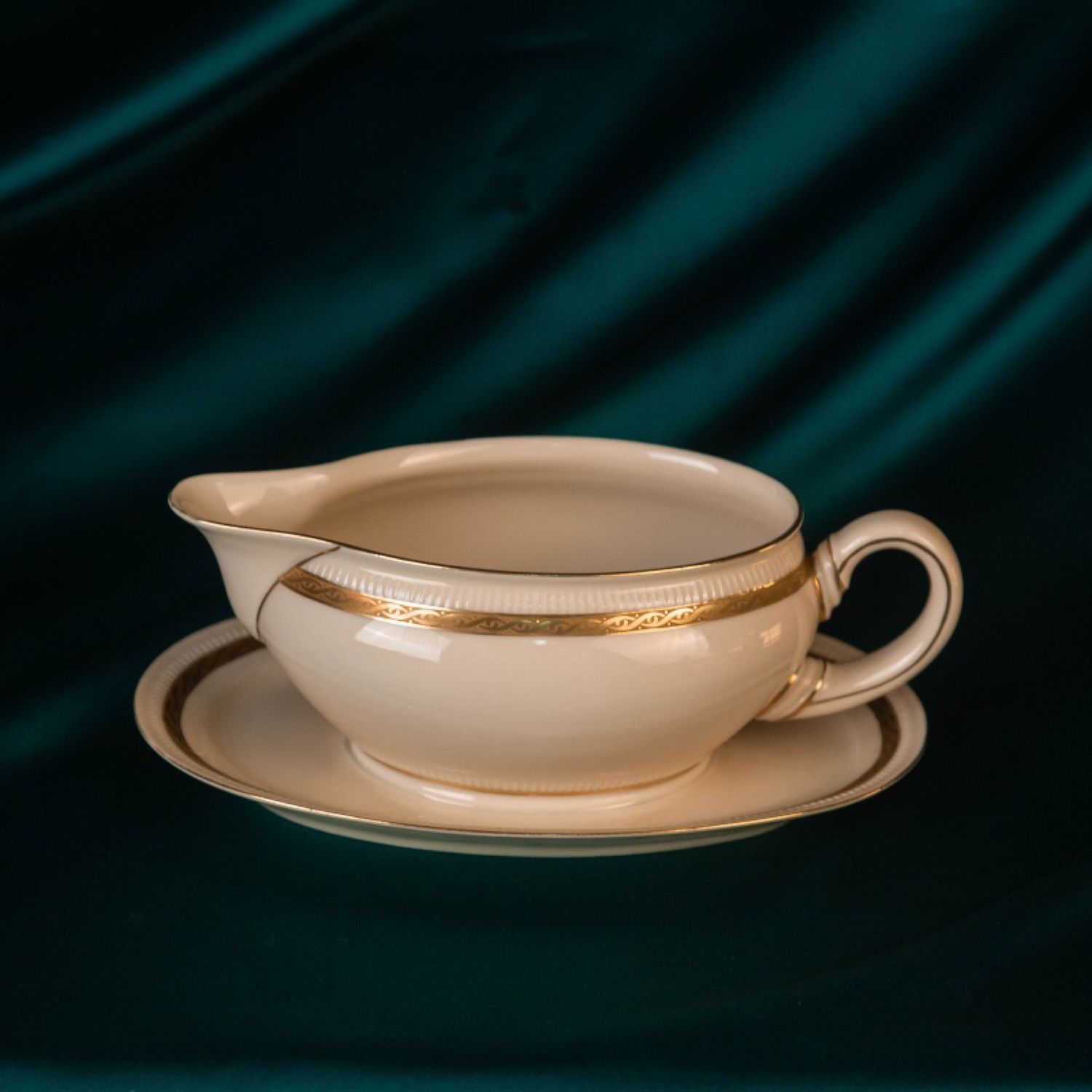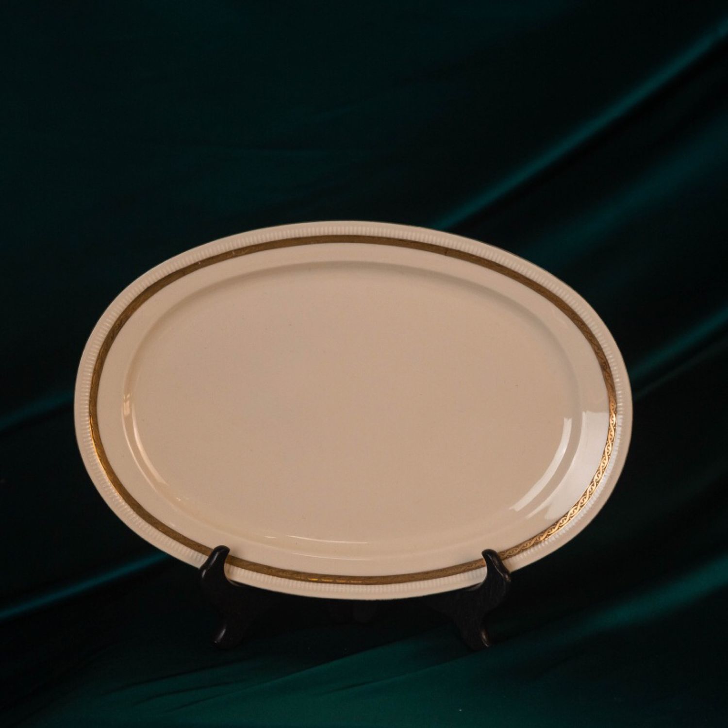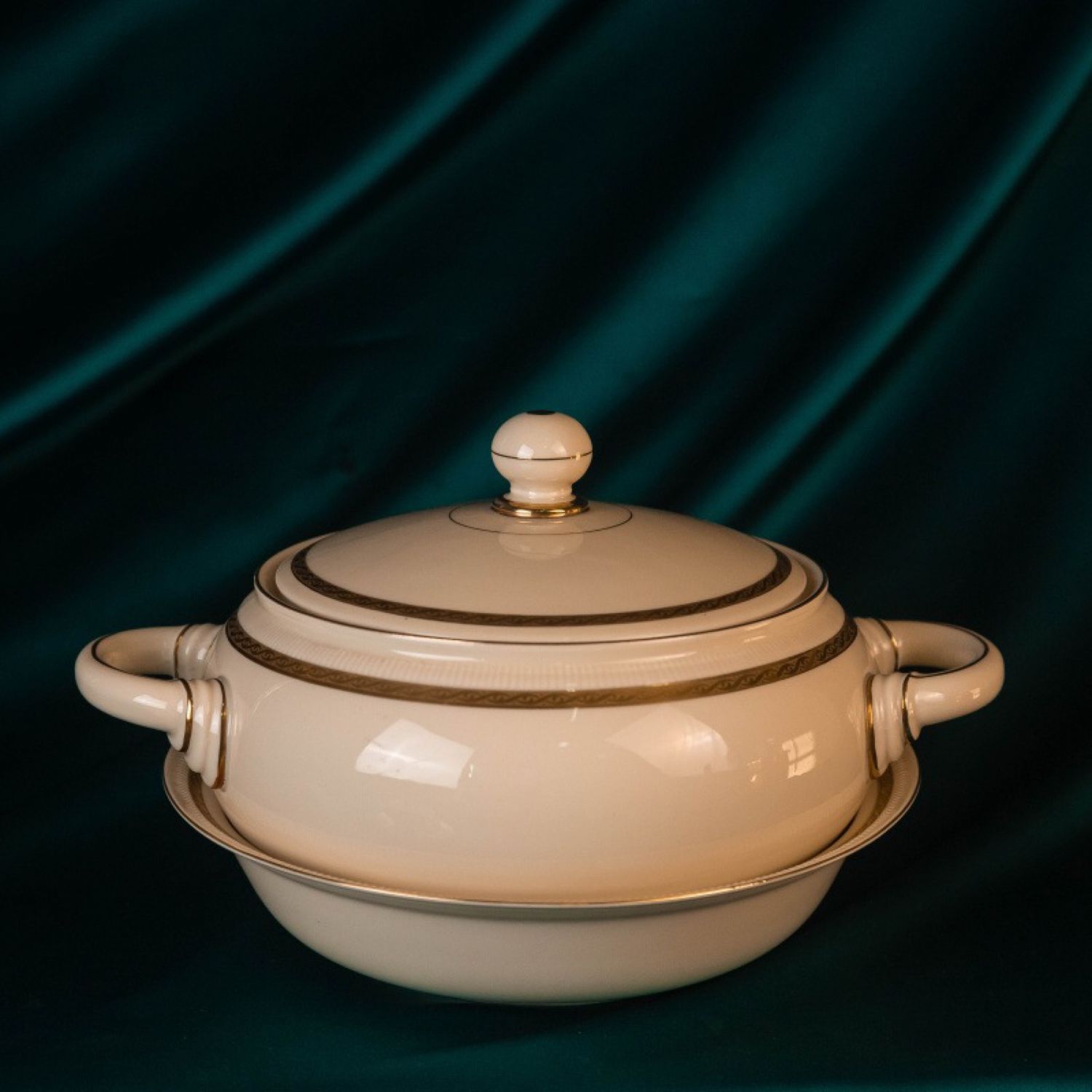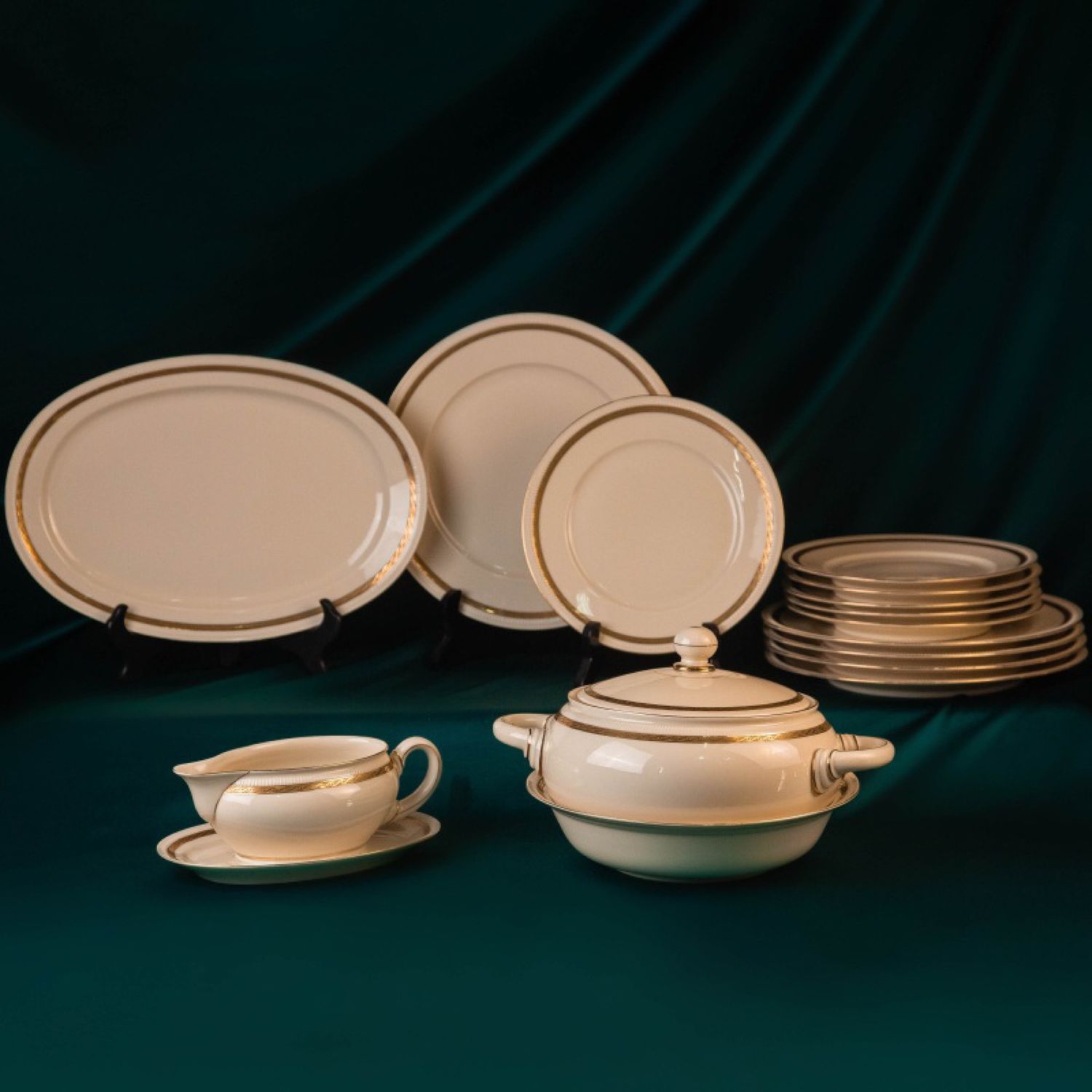 Столовый сервиз на 6 персон, состоящий из 22 предметов: супница — 1шт, соусник — 1шт, салатник — 1шт, овальное блюдо — 1шт, суповые тарелки — 6шт, обеденные тарелки — 6шт, пирожковые тарелки — 6шт.