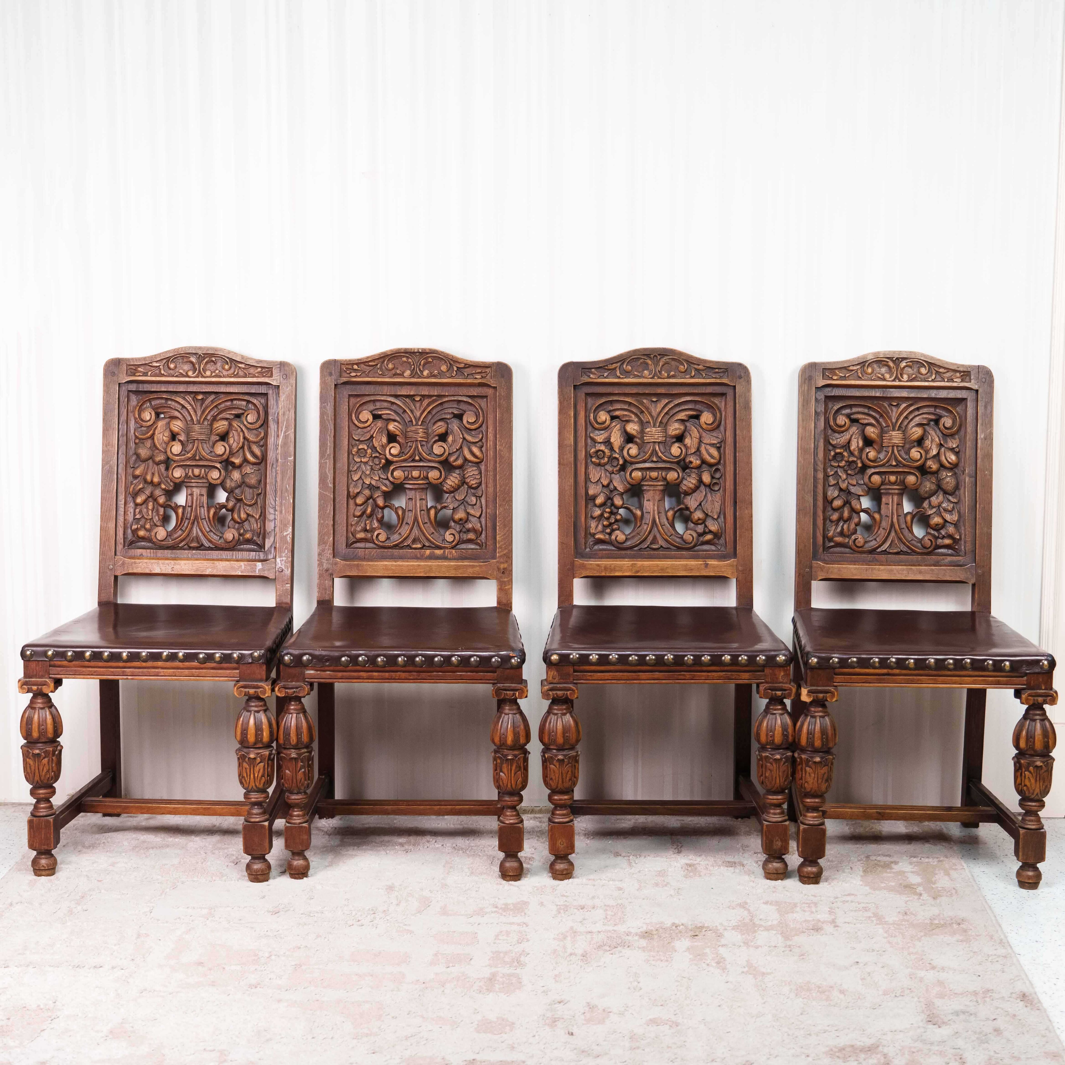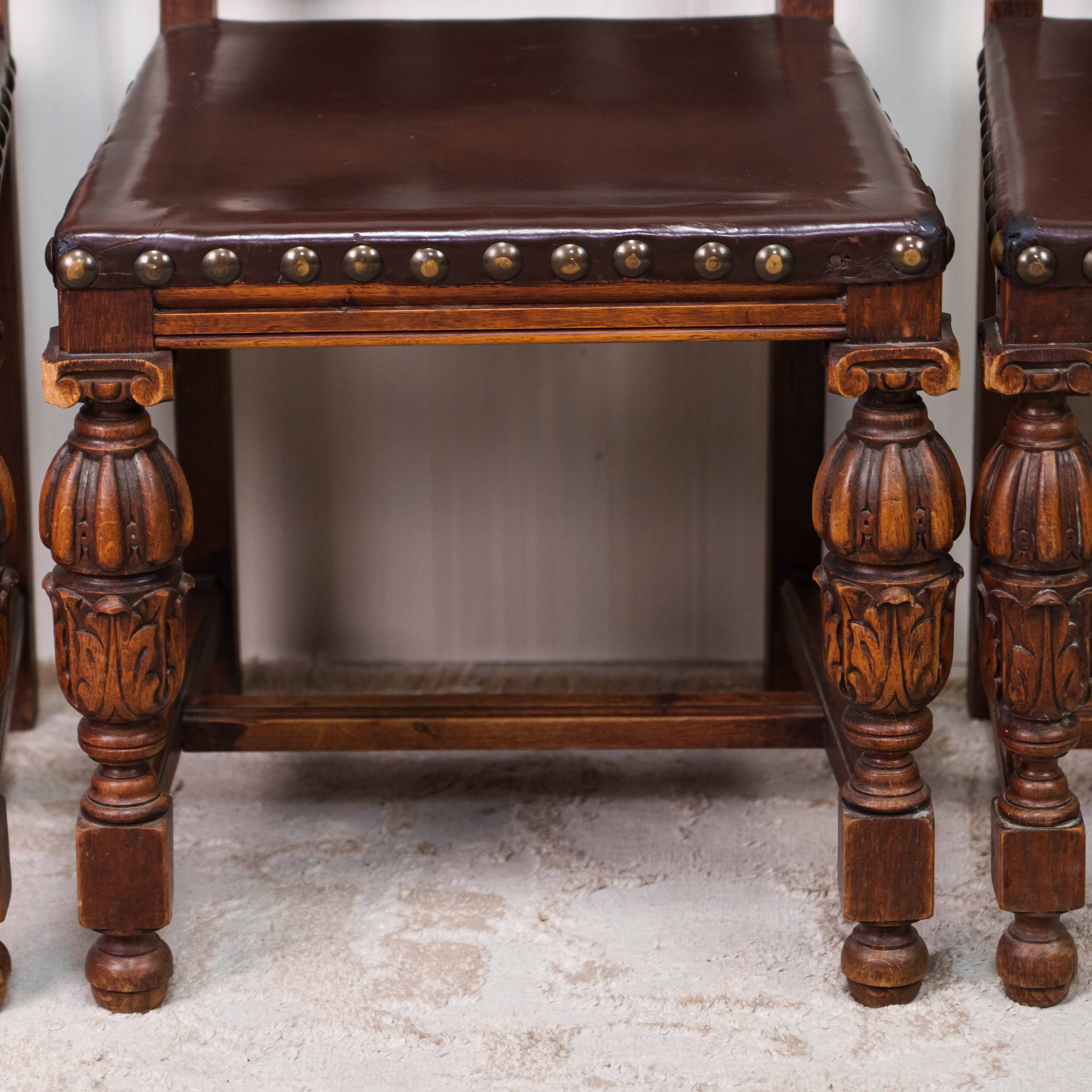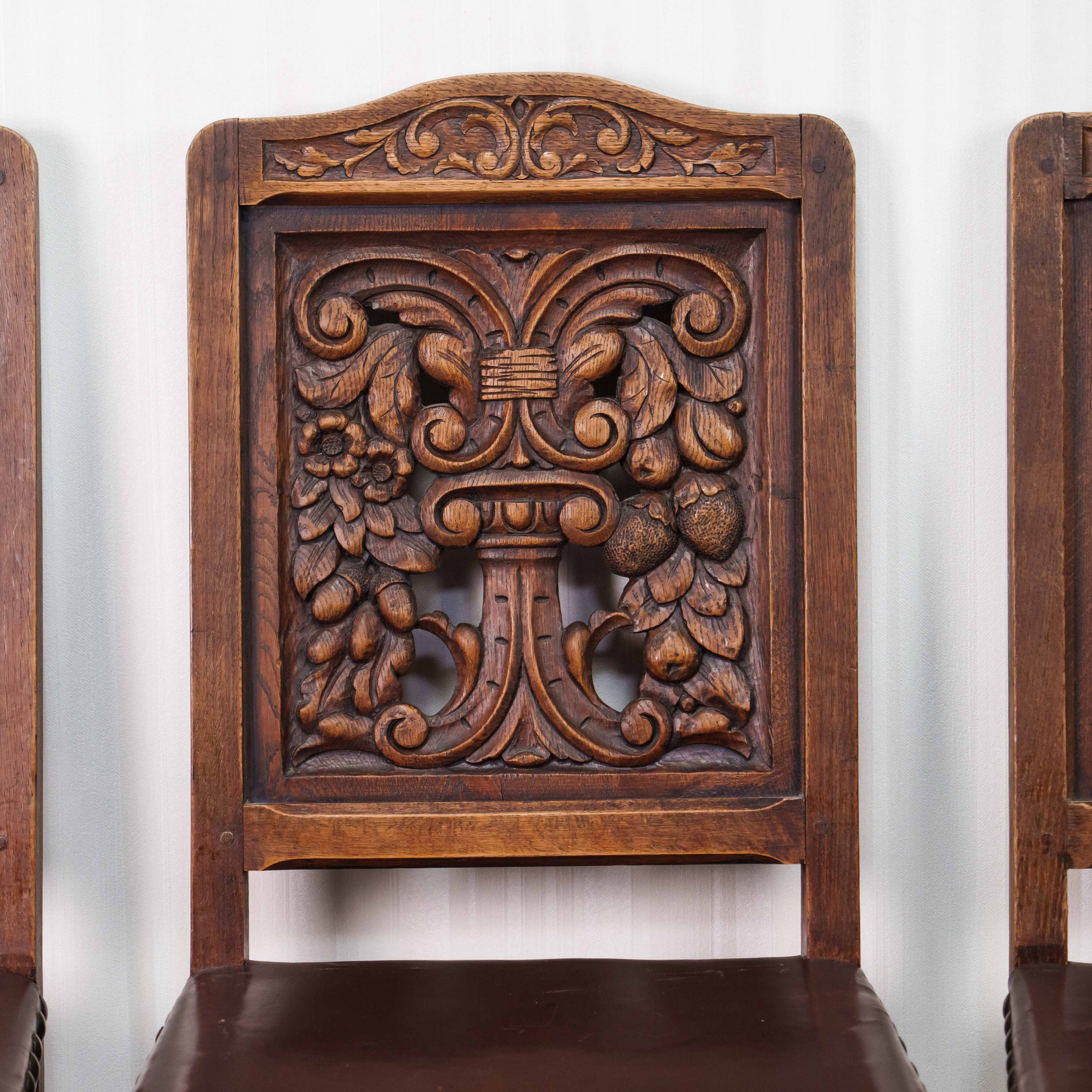 Представленный комплект антикварных стульев выполнен в бретонском стиле и представляет собой выразительный образец региональной французской мебели, восходящей к традициям Бретани конца XIX — начала XX века. В набор входит три массивных стула из цельного массива тёмного дуба, отличающиеся строгими пропорциями и подчеркнутой архитектурностью форм. Высокие прямоугольные спинки украшены глубокой рельефной резьбой с характерными для бретонского стиля симметричными растительными и геральдическими мотивами, отсылающими к народной символике и средневековым орнаментам региона.
