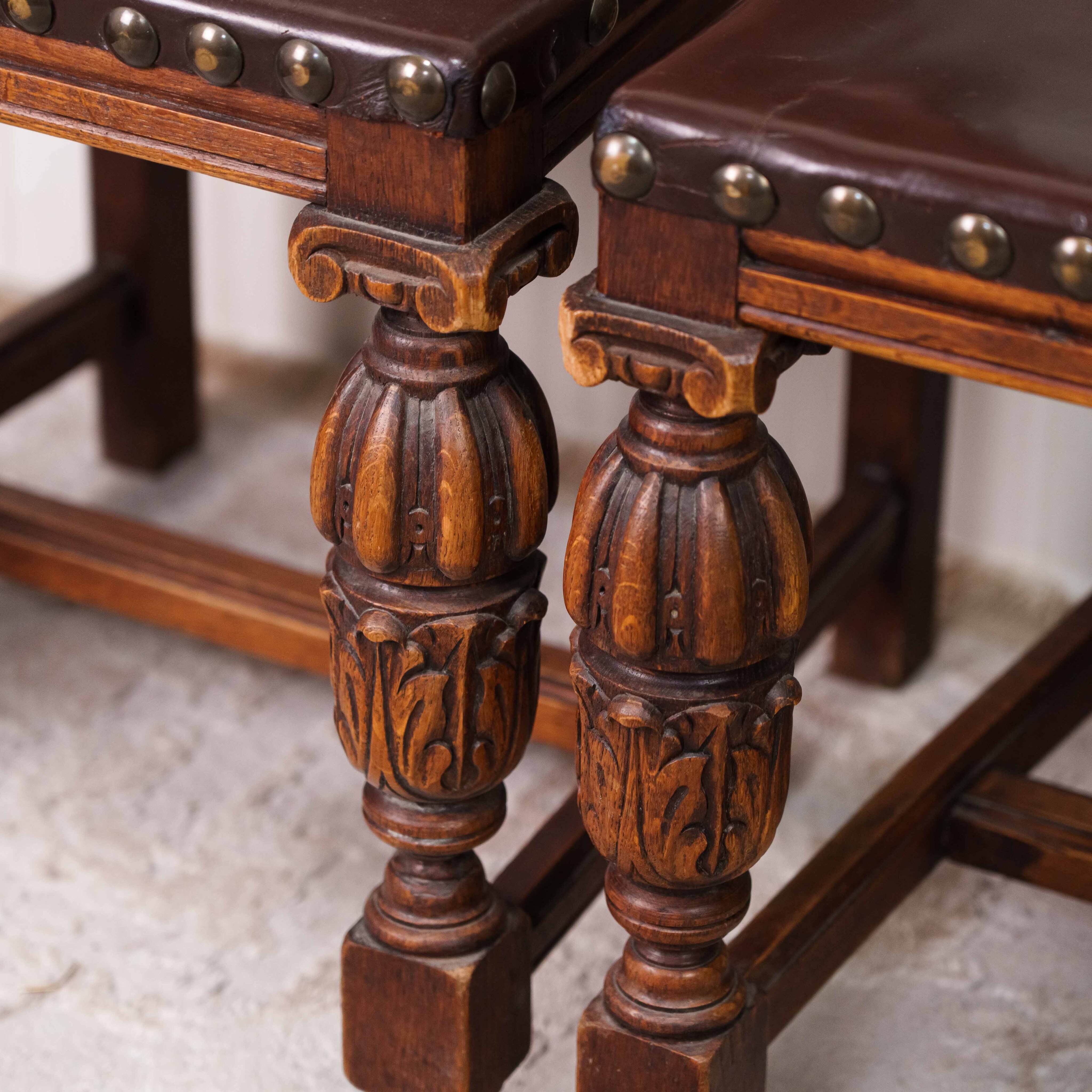 Сиденья деревянные, обрамлены рядом декоративных кованых или деревянных гвоздиков, усиливающих аутентичный, слегка суровый характер мебели. Ножки точёные, мощные, соединённые проножками, что придаёт конструкции устойчивость и подчёркивает её утилитарное происхождение.
