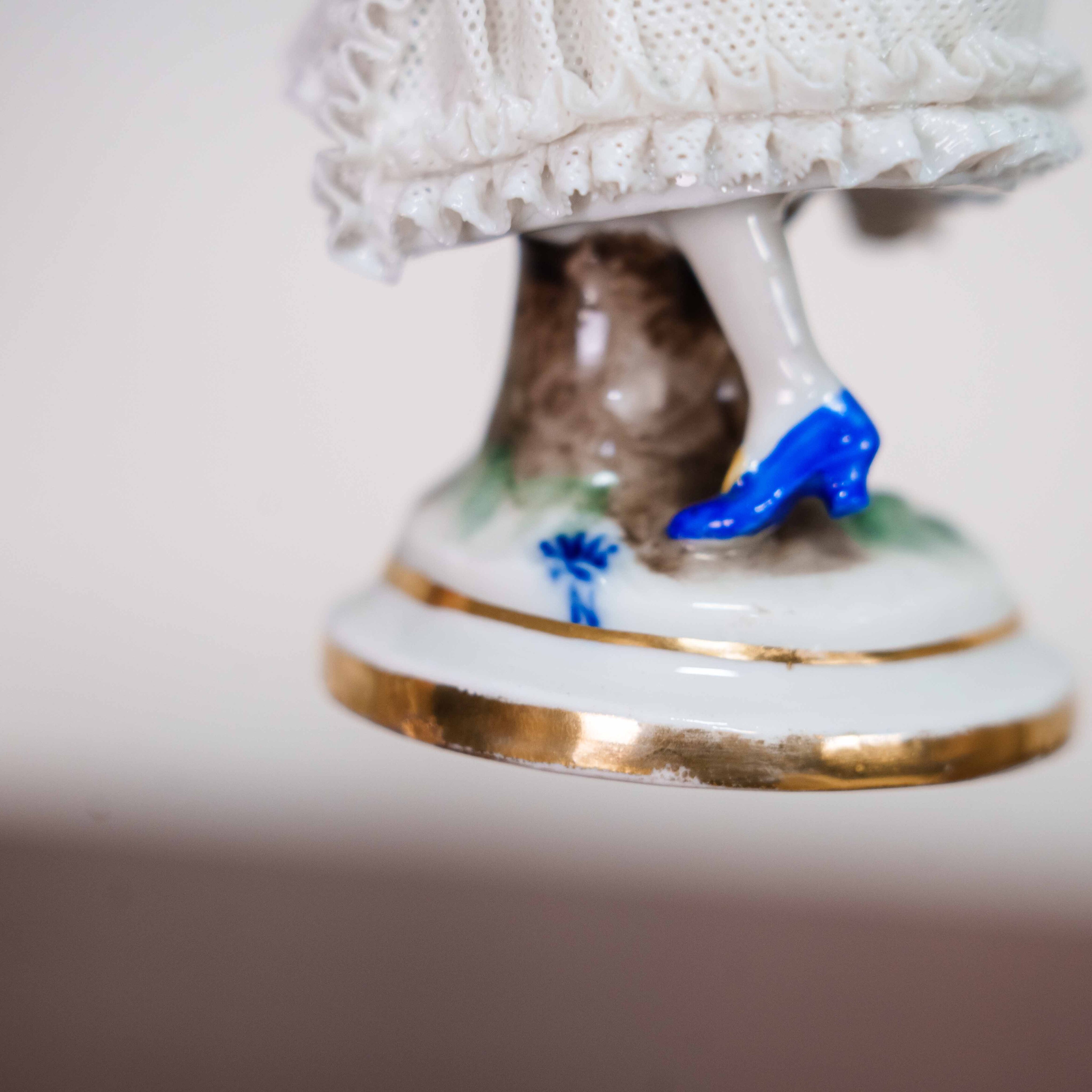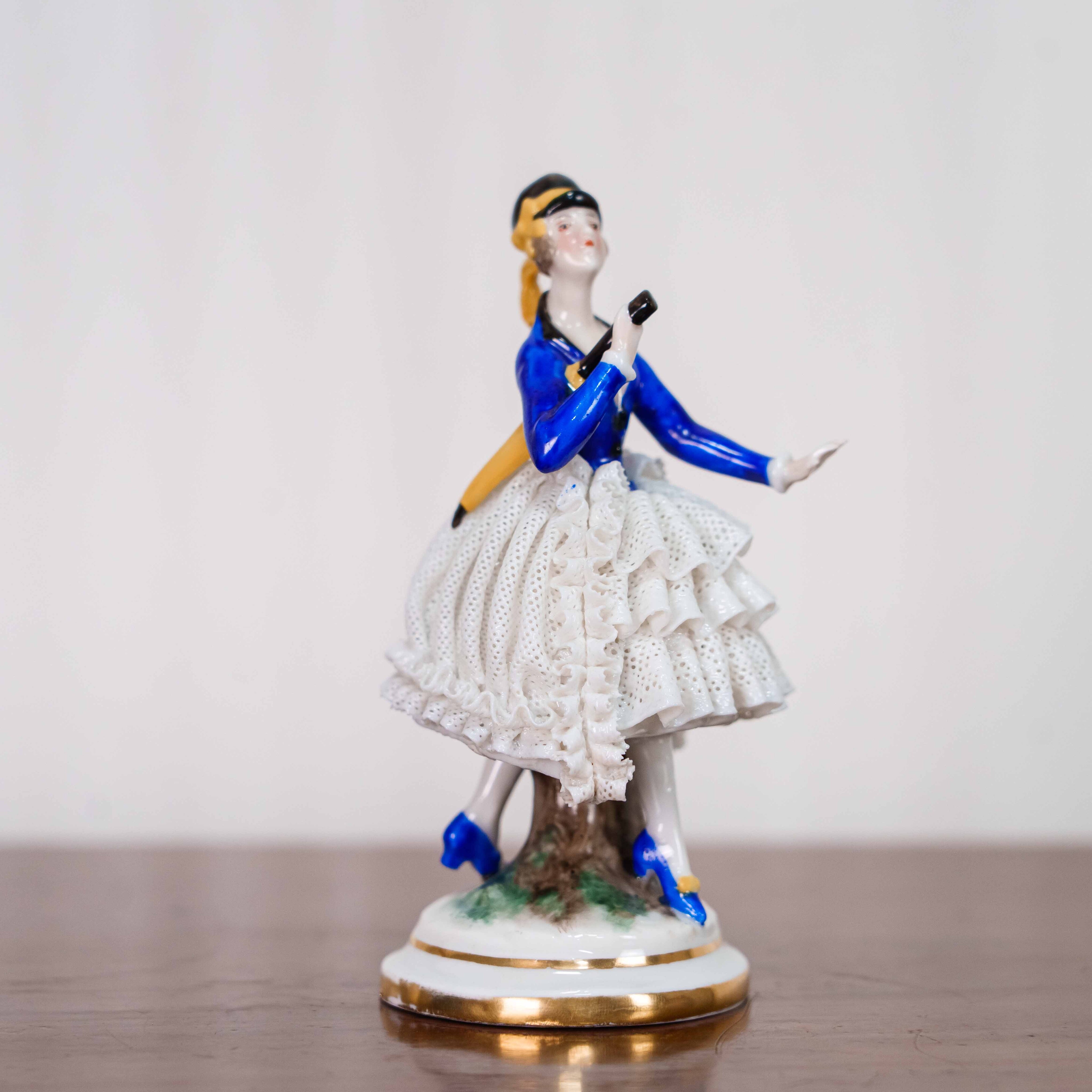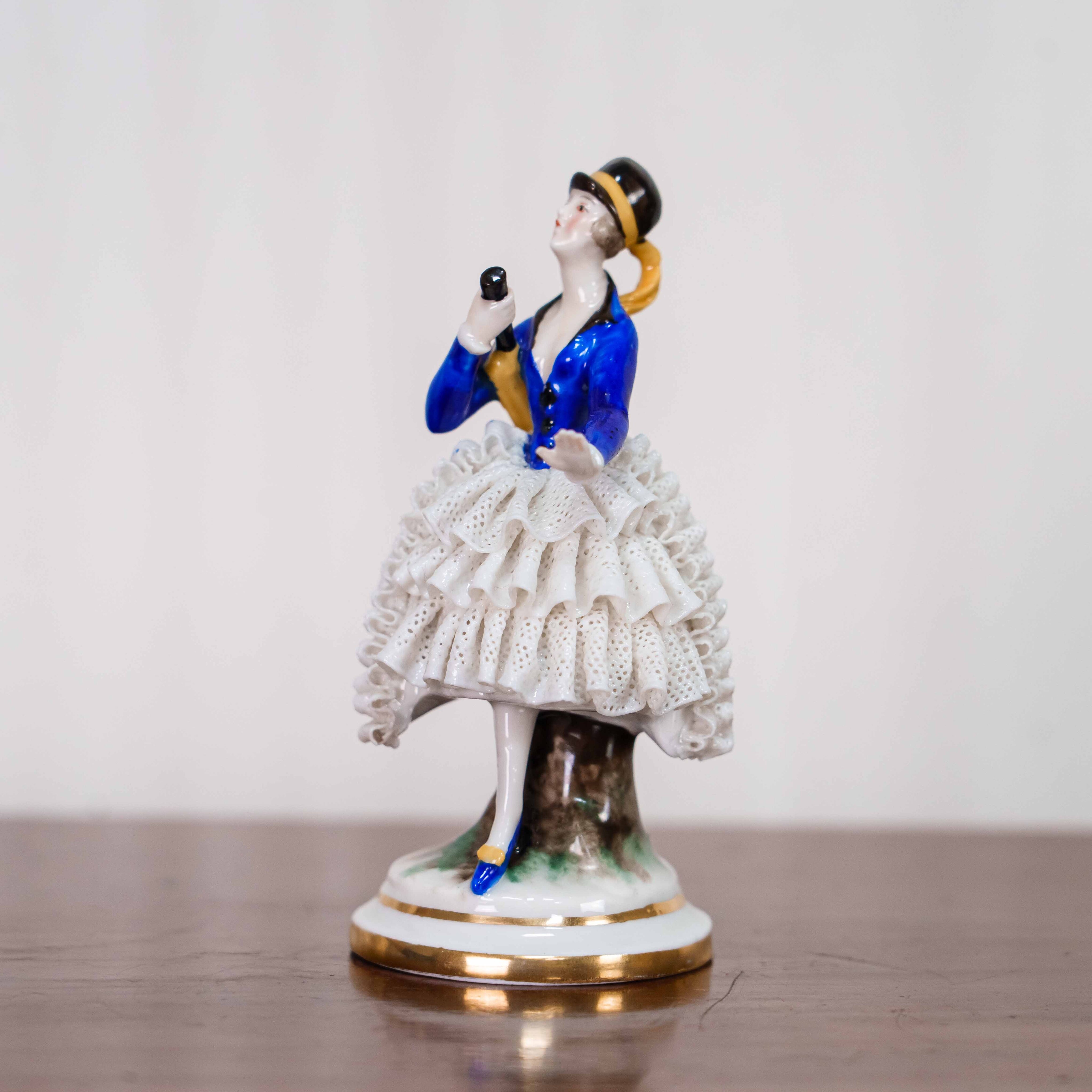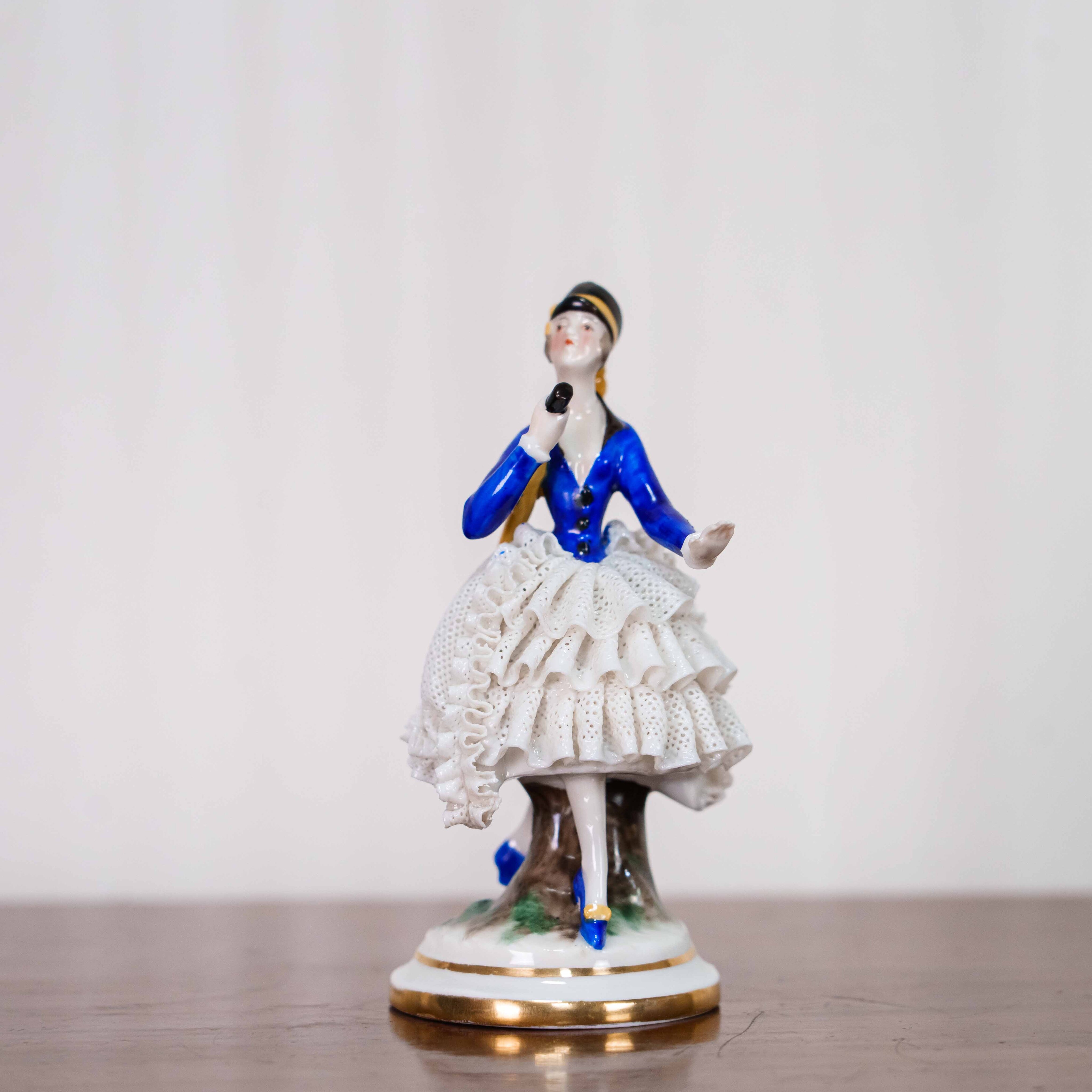 Фарфоровая статуэтка изображает изящную женскую фигуру в элегантном костюме конца XIX – начала XX века, выполненную в традициях немецкого художественного фарфора. Дама представлена в лёгкой, динамичной позе, словно запечатлённой во время прогулки или светского выхода. В её руках — сложенный зонтик, изящный аксессуар, подчёркивающий утончённость образа и принадлежность к городской культуре эпохи. Особое внимание привлекает тщательно проработанная многослойная юбка с ажурной фактурой, покрытая белоснежной глазурью, а также насыщенный кобальтово-синий жакет с аккуратными золотыми акцентами. Детали костюма, обуви и прически выполнены с высокой степенью мастерства, что характерно для продукции мануфактуры Ernst Bohne & Sohne, известной своими жанровыми и интерьерными фарфоровыми фигурами.