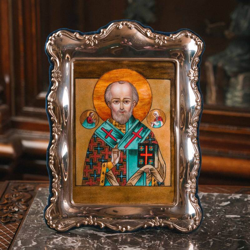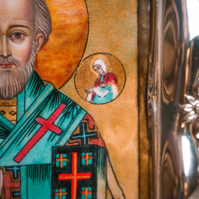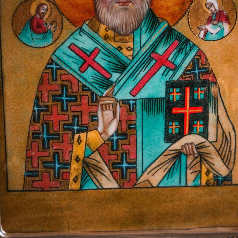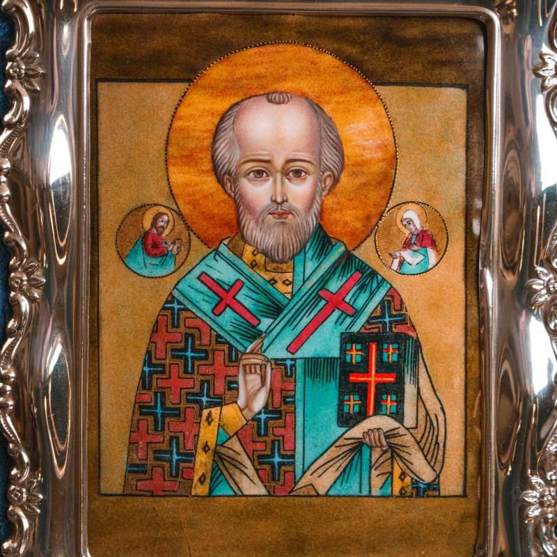Икона «Святитель Николай Чудотворец» выполнена в технике многоцветной росписи эмалями по медной пластине — сложной декоративной технологии, предполагающей послойное нанесение эмалевых красок с обжигом.