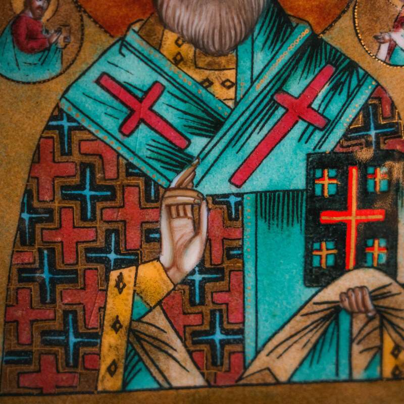 Лик святителя передан в классическом каноне: с благословляющей десницей и Евангелием, мягкой светотеневой моделировкой и ровным, умиротворённым выражением лица.