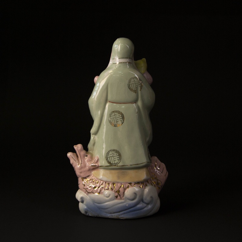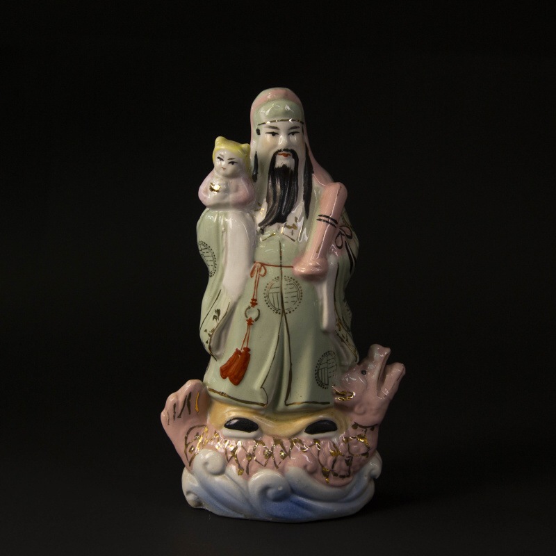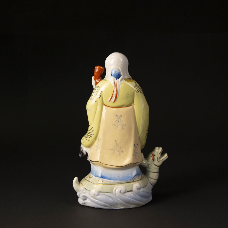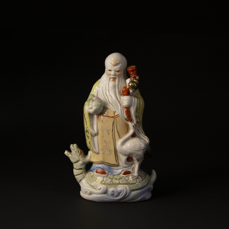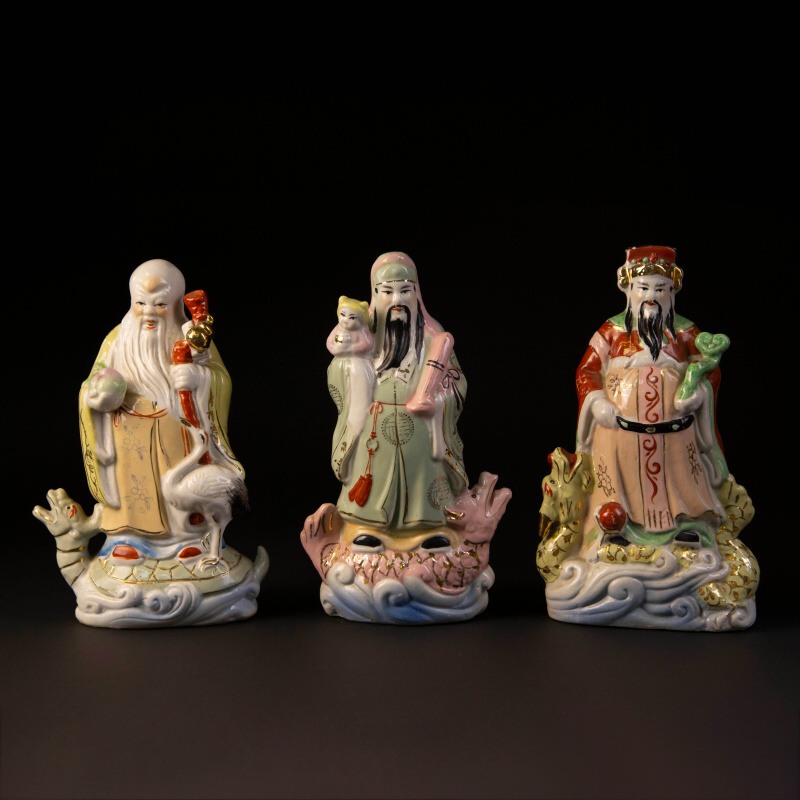 Комплект фигур, изображающих хранителей семейного очага — трех звездных старцев: Лу-син, Фу-син, Шоу-син. Предметы выполнены из фаянса в технике скульптурной лепки с применением ручной росписи и позолоты. Звездные старцы — это три седовласых мудреца, которые считаются хранителями и духовными наставниками, ассоциирующимися с тремя звездами, имеющими большое значение в астрологии.