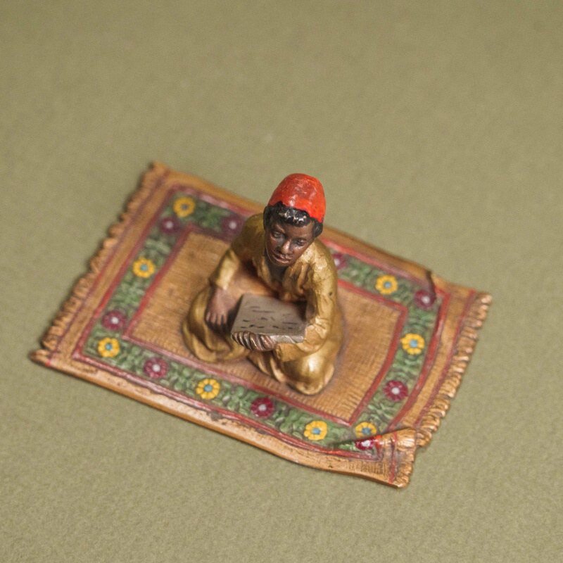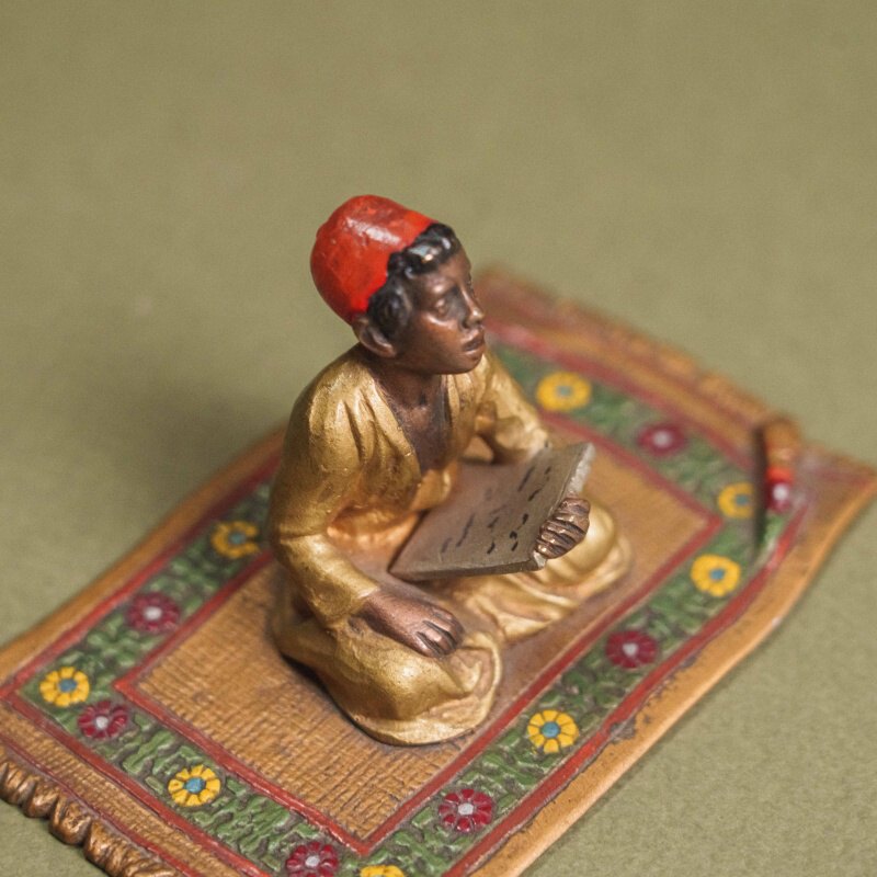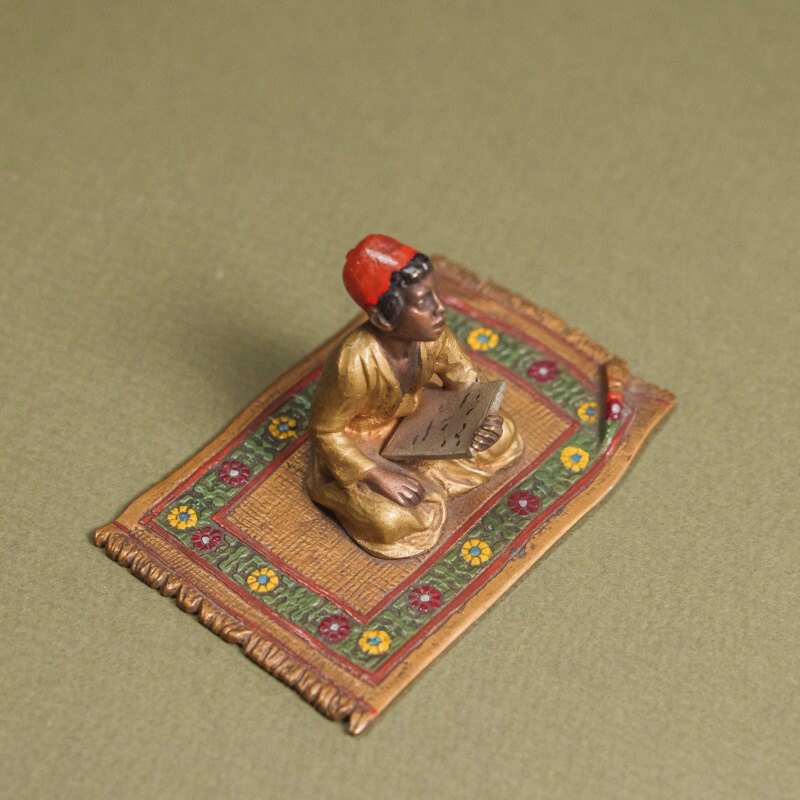Тонко выполненная фигурка изображает юного ученика, сидящего на богато декорированном восточном ковре и внимательно читающего доску с письменами. Мастер искусно передал характерное сочетание ярких красок и пластики: красный фес, золотистый халат и тщательно проработанные складки ткани создают выразительный образ, а орнамент ковра с цветочными мотивами усиливает ощущение восточного колорита. Благодаря ручной росписи и вниманию к мелким деталям композиция приобретает особую теплоту и атмосферность. Миниатюра выполнена из бронзы с окраской цветными эмалями, основание — литая металлическая пластина. Работу отличает декоративность и характерный ориентальный стиль, востребованный среди коллекционеров предметов Востока.