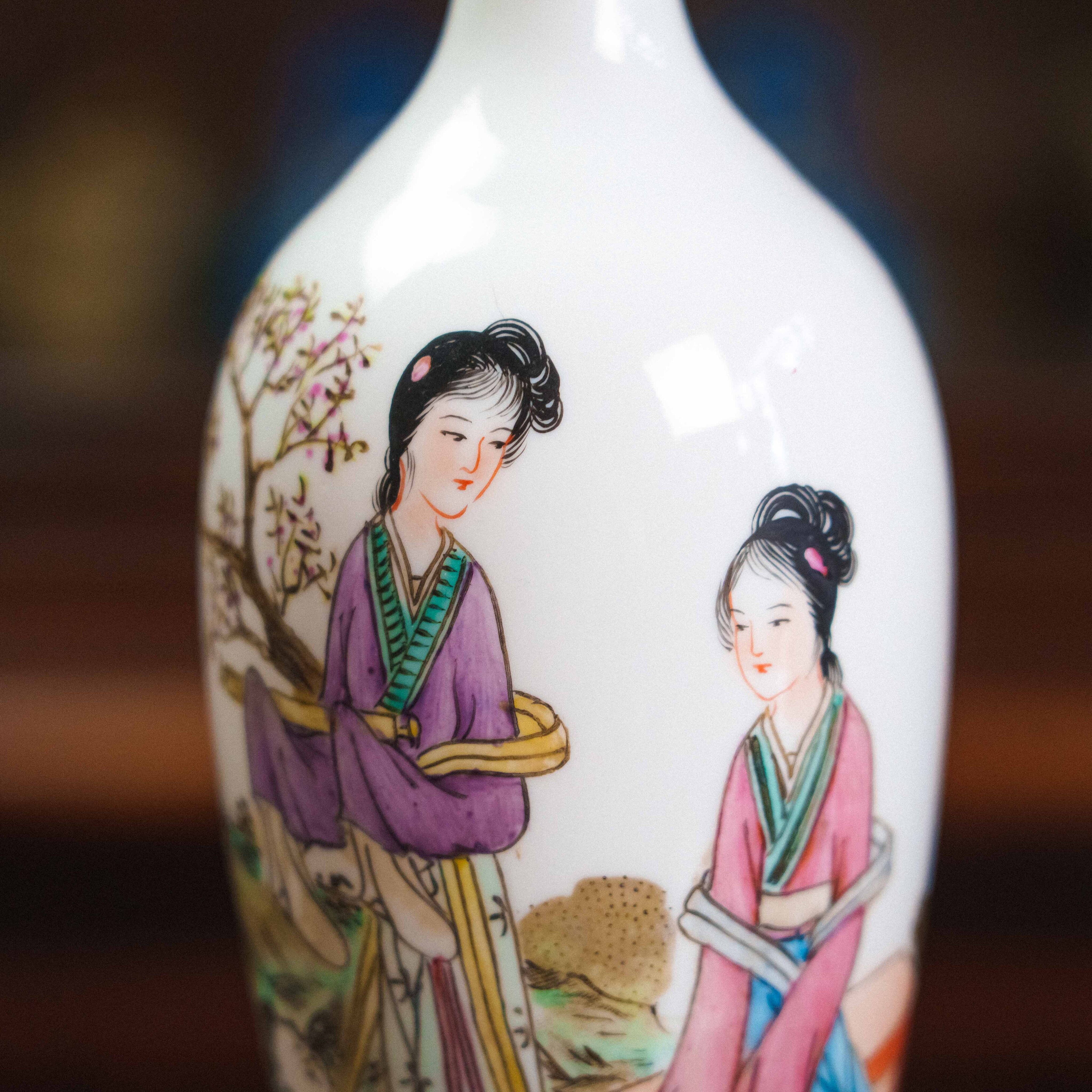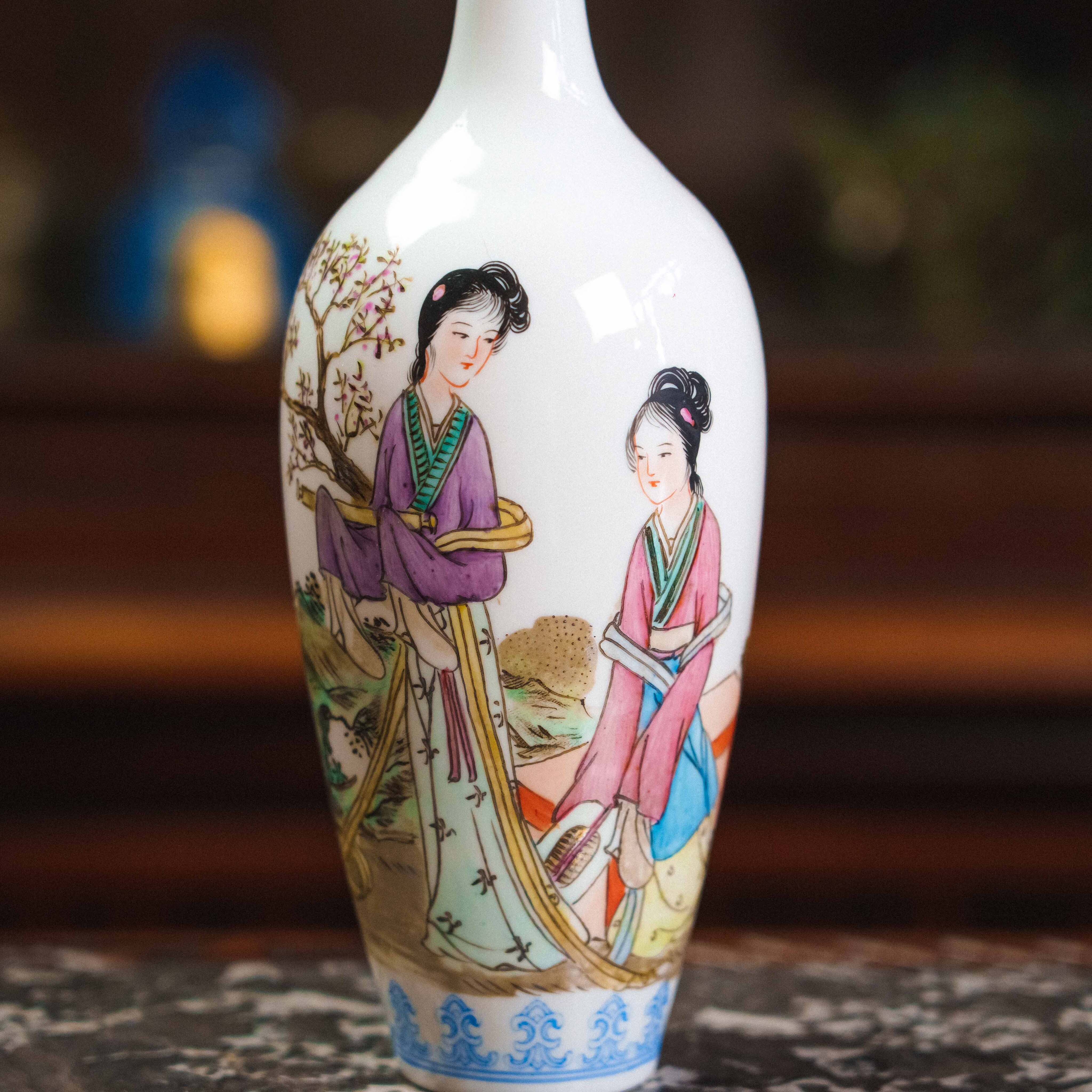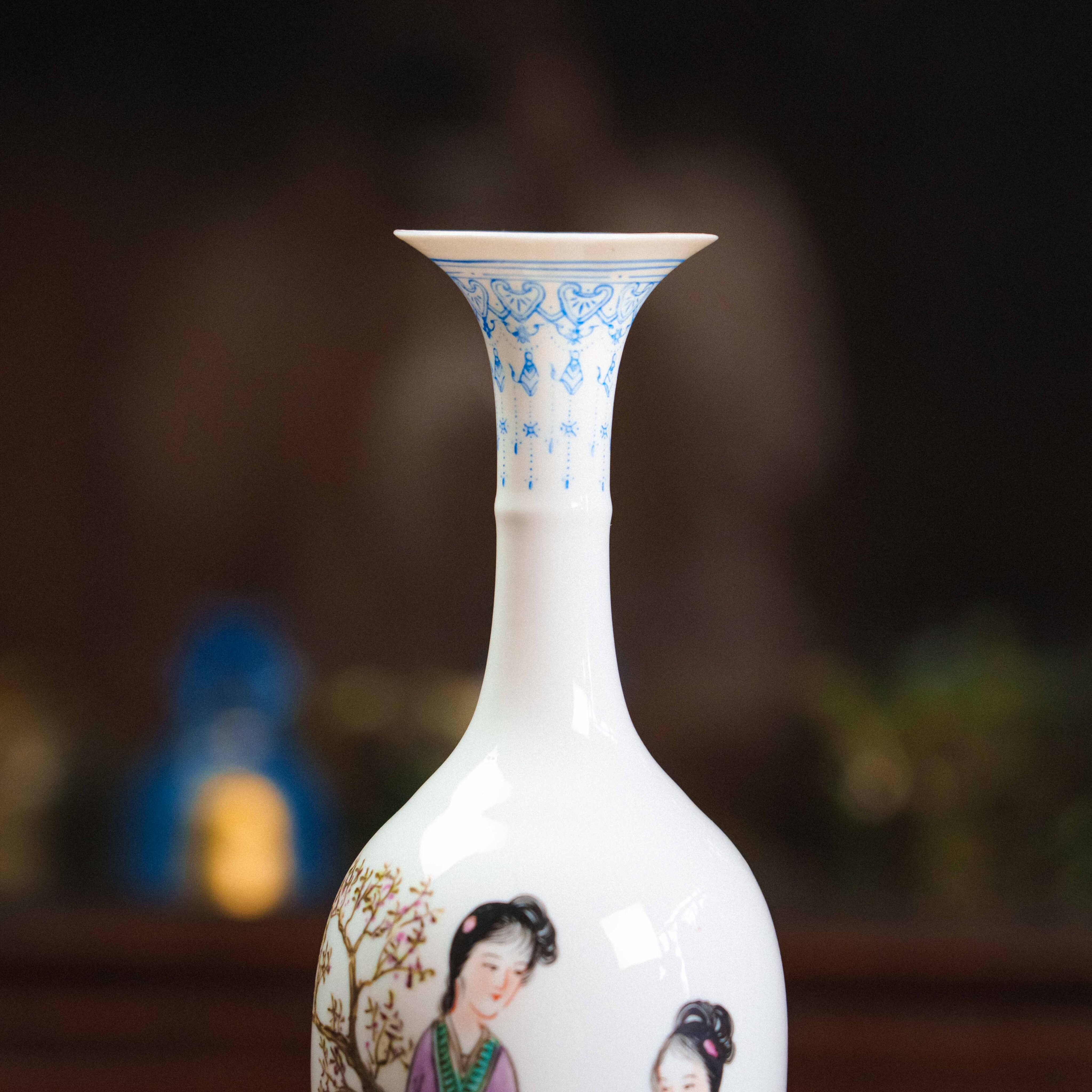 Изящная китайская фарфоровая ваза с тонкой росписью в традиционном стиле представляет собой гармоничное сочетание классической формы и поэтичного сюжета. На белоснежном фоне изображены две женские фигуры в изысканных одеждах, погружённые в спокойный, созерцательный диалог на фоне природы. Композиция наполнена мягкой лирикой, характерной для китайской живописи, где каждый жест и наклон головы передаёт атмосферу тишины и внутреннего равновесия.