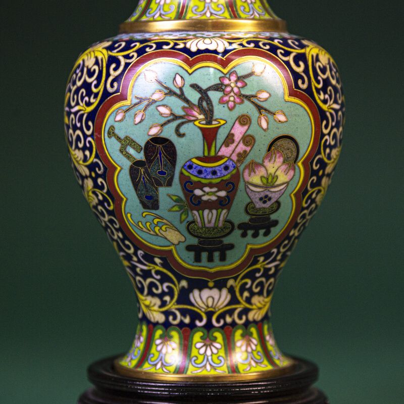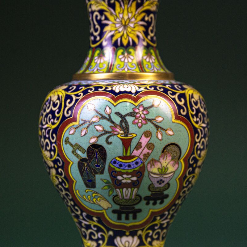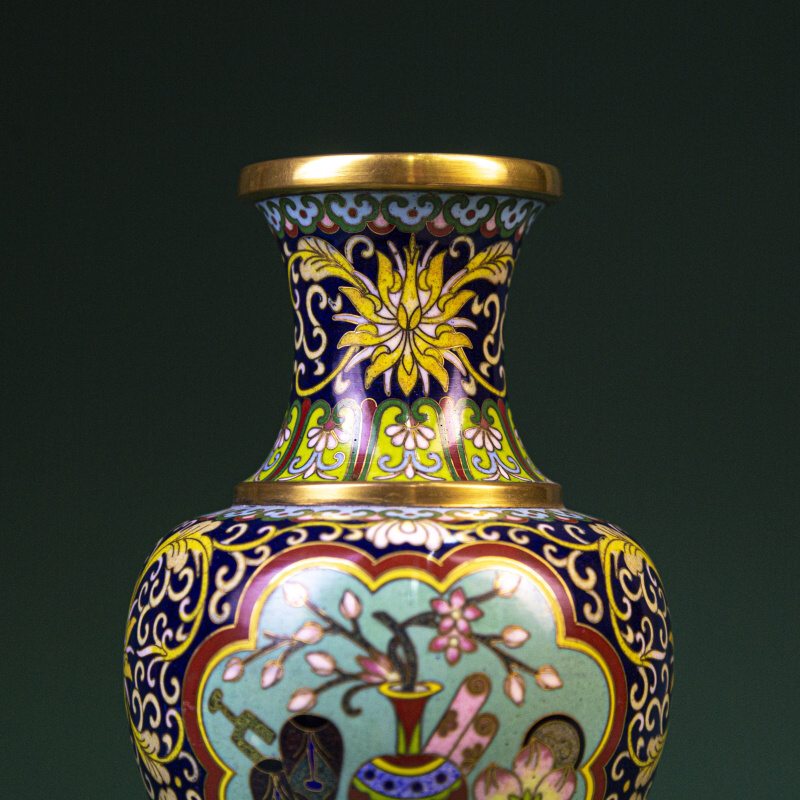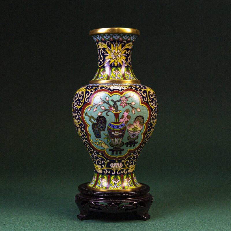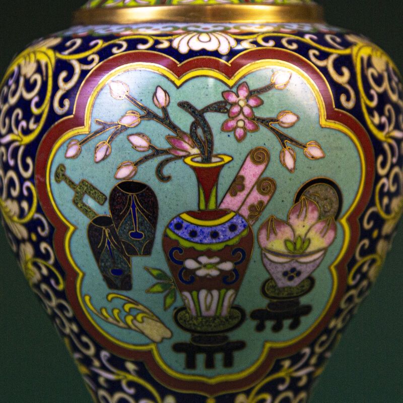 Клуазоне — это предметы из металла или керамики, украшенные сложными эмалевыми узорами, где участки разного цвета отделены друг от друга изогнутой медной проволокой, припаянной к поверхности.