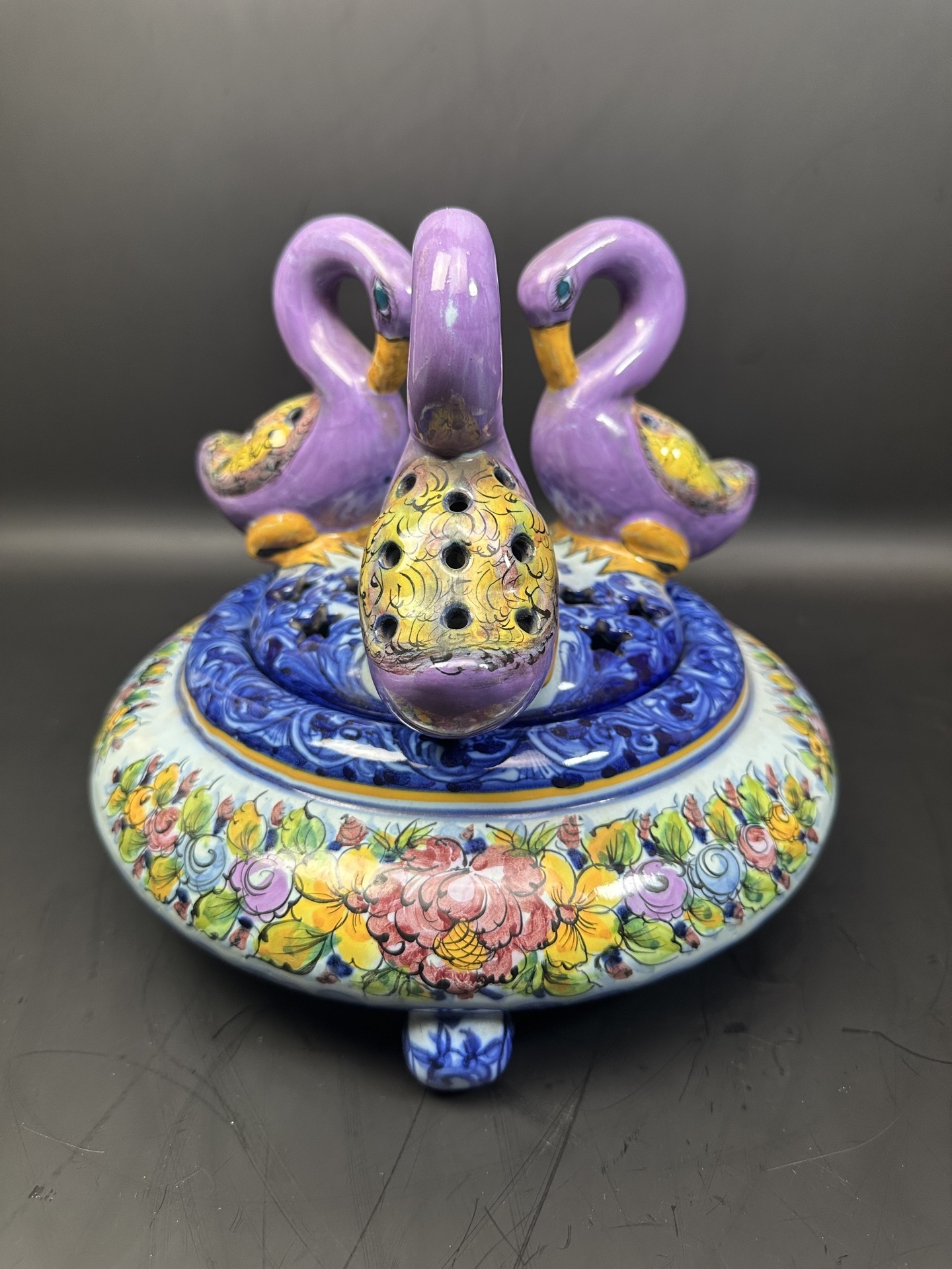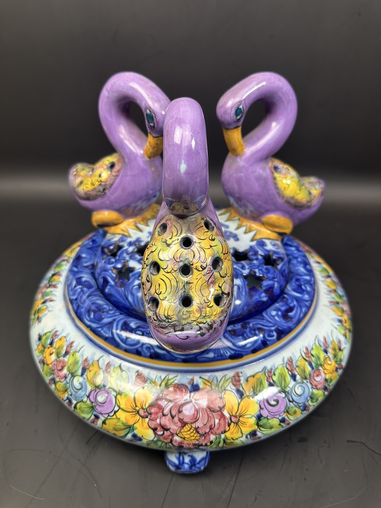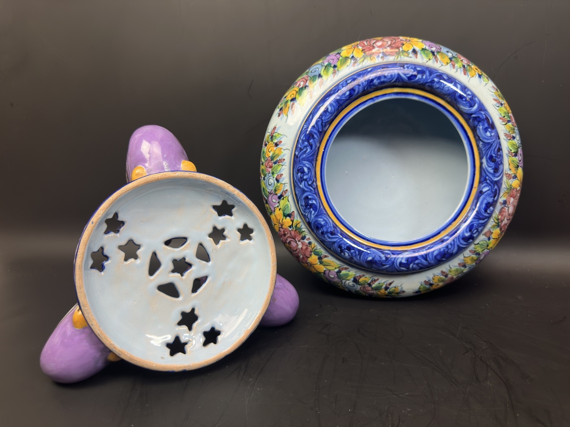 Ваза с крышкой, является изделием из фаянса португальской мануфактуры Alcobaça, известной своими декоративными элементами и ручной росписью.