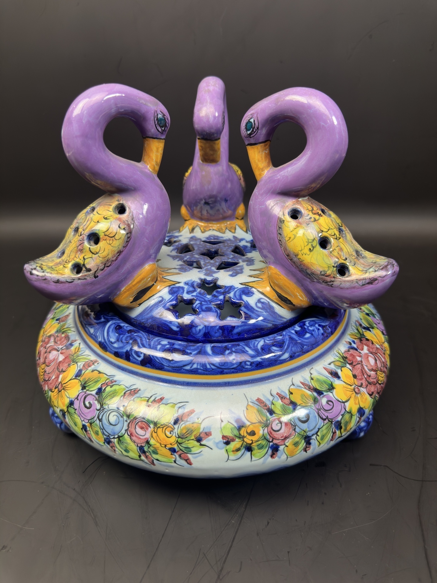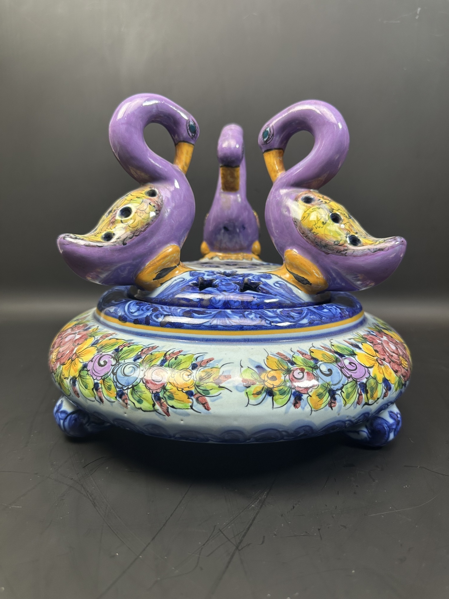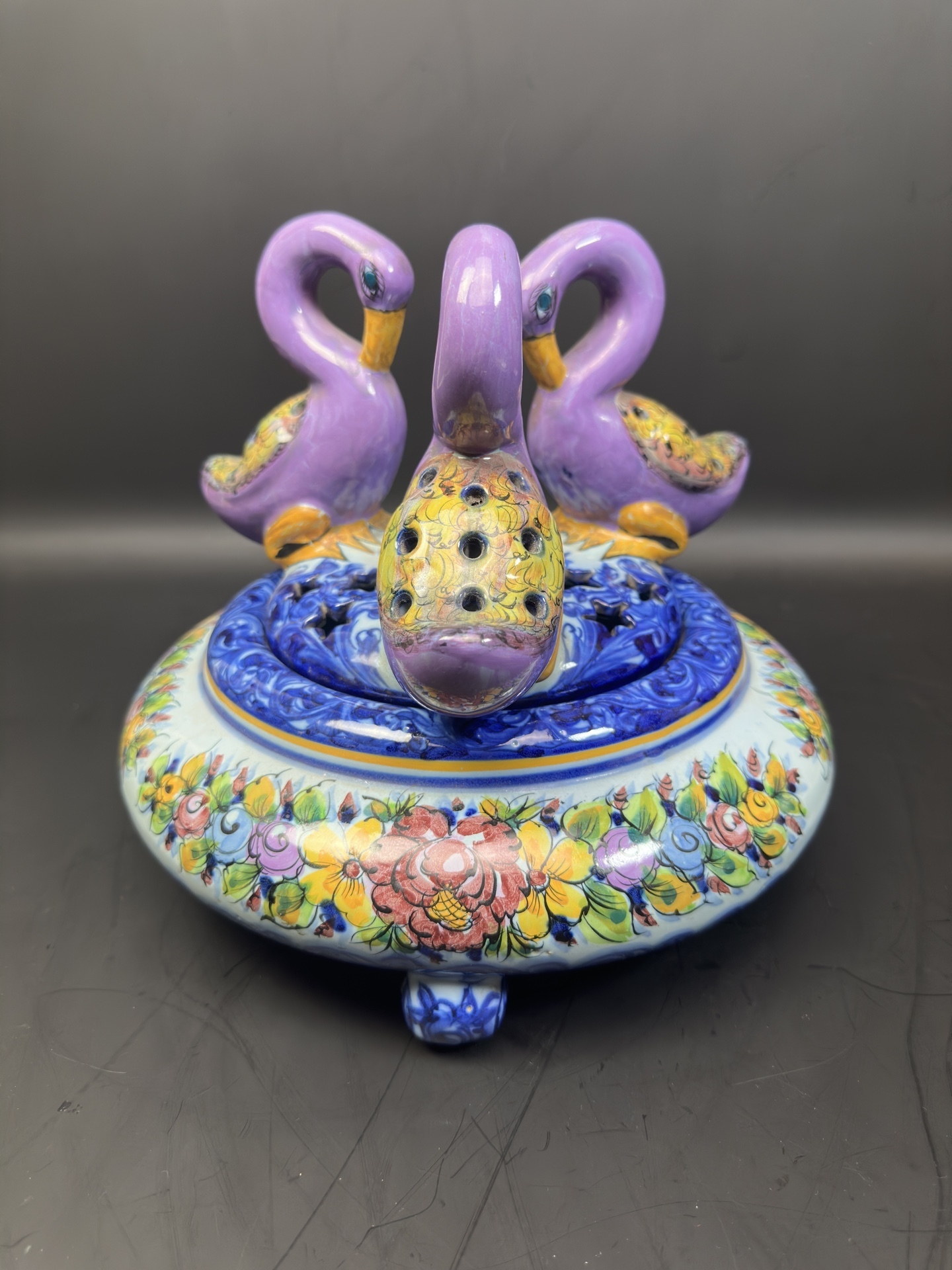 Ваза с крышкой, является изделием из фаянса португальской мануфактуры Alcobaça, известной своими декоративными элементами и ручной росписью.