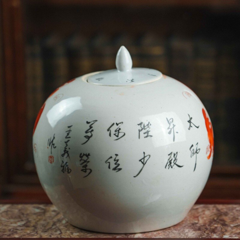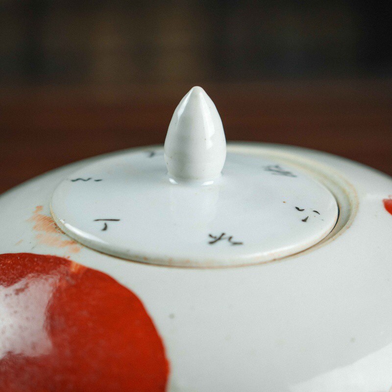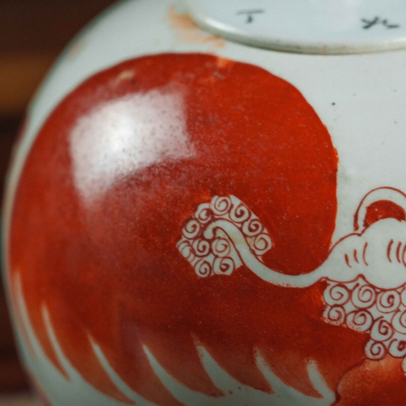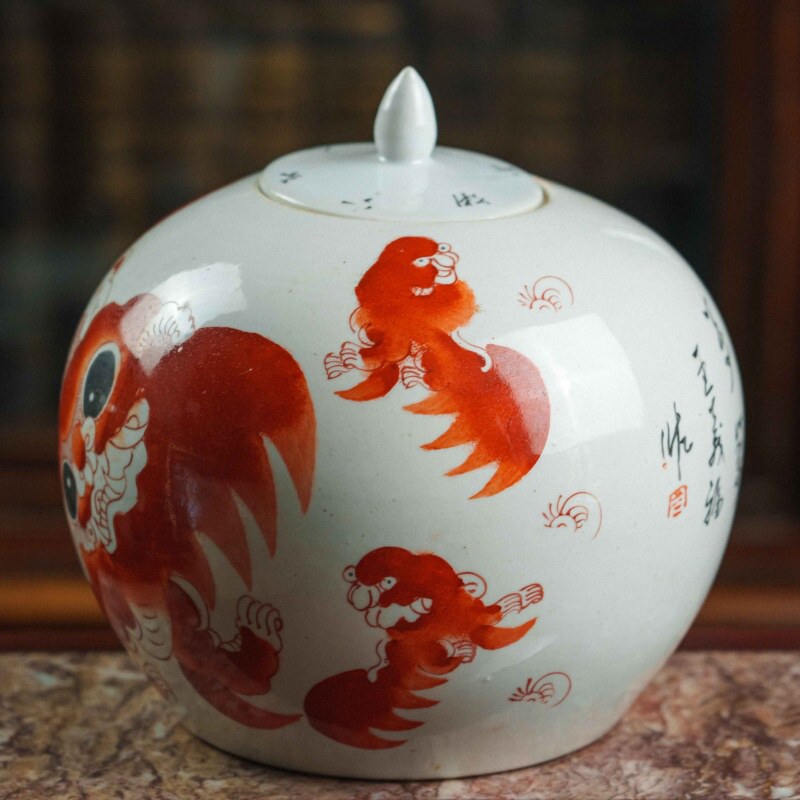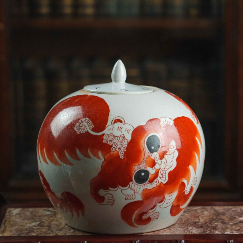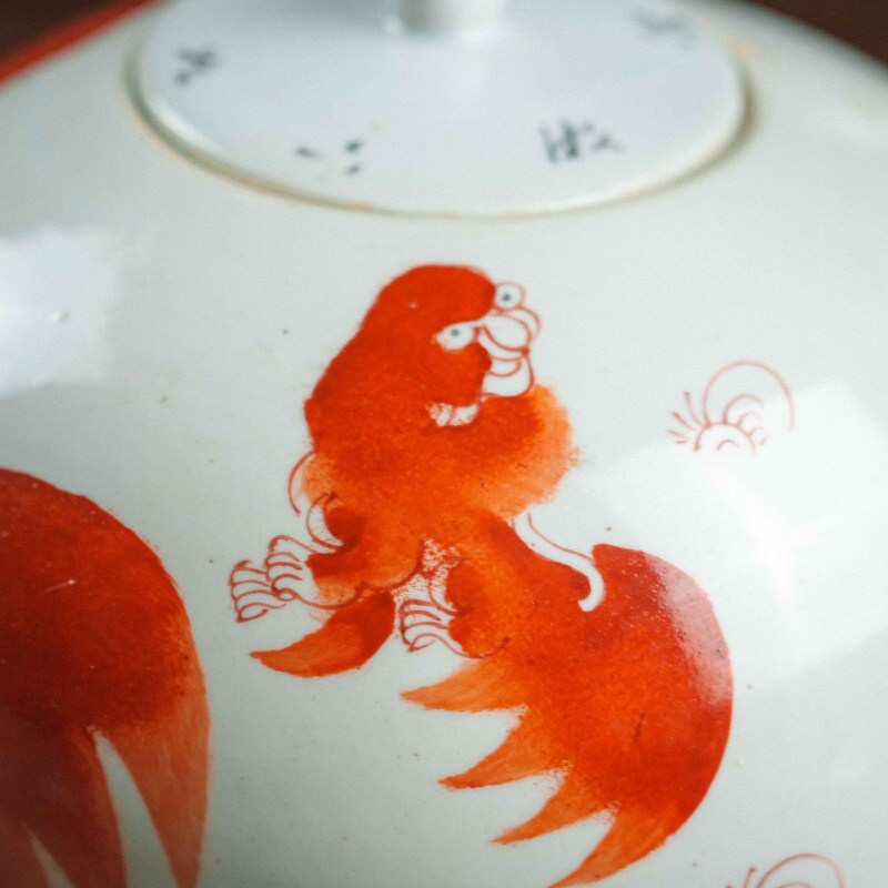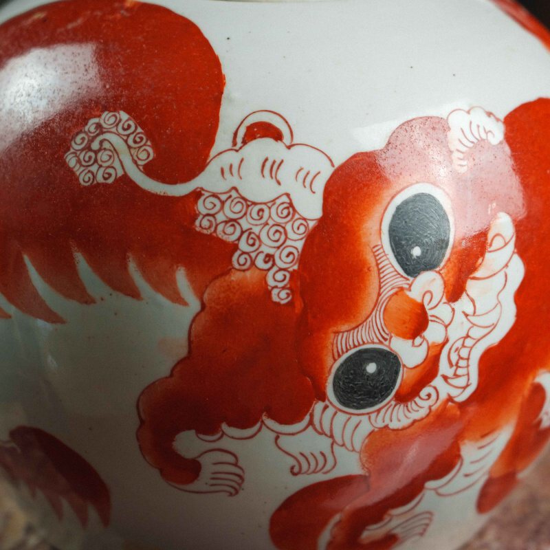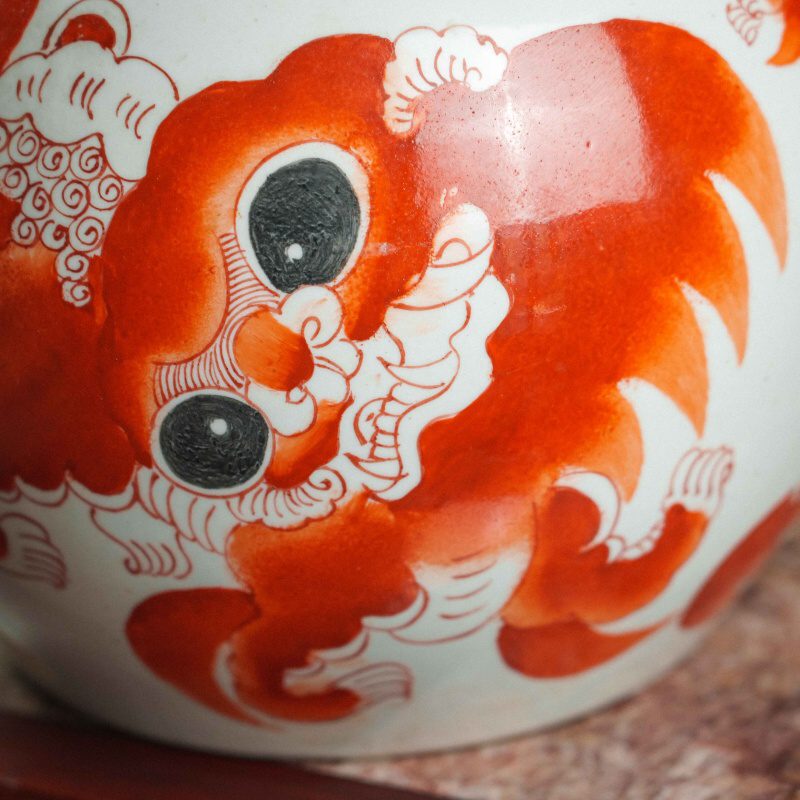 Фарфоровая ваза-шкатулка с крышкой выполнена в традиционной китайской манере и украшена выразительной росписью ярко-красного цвета в стиле «сяоцай». На гладкой поверхности фарфора изображены мифологические львы-фу (шиши, собаки Фо) с крупными округлыми глазами и пышными гривами, написанными свободными, энергичными мазками. Эти фантастические существа издревле считались хранителями, символами силы и защиты от злых духов, их образ часто украшал храмовые ворота и культовые предметы.