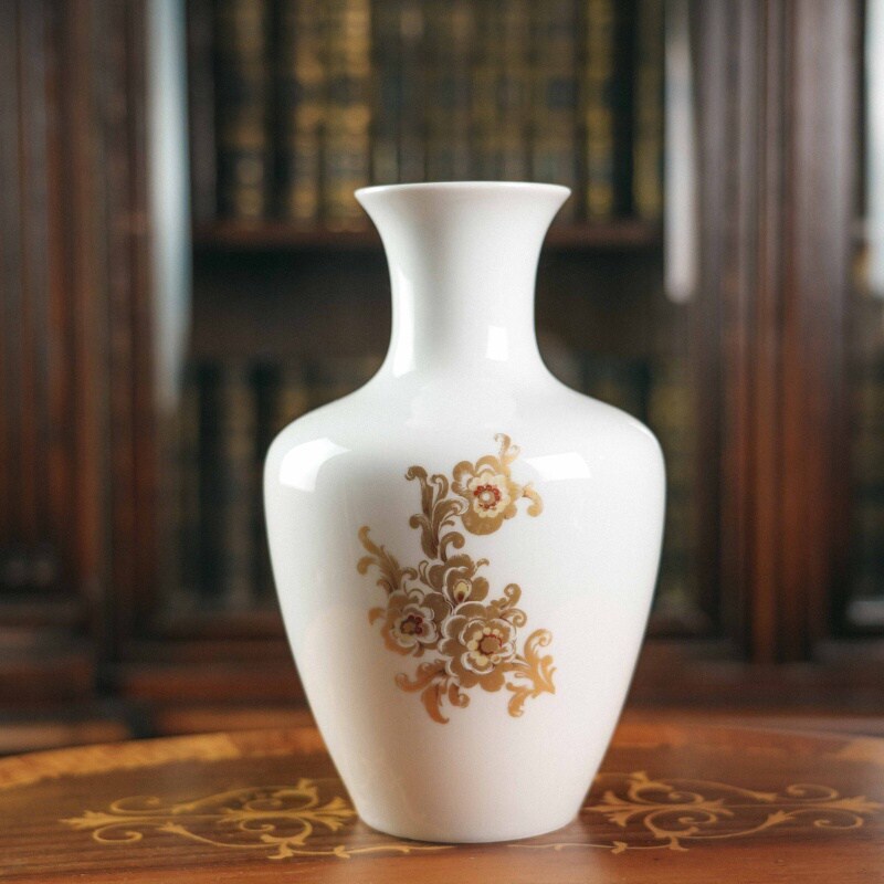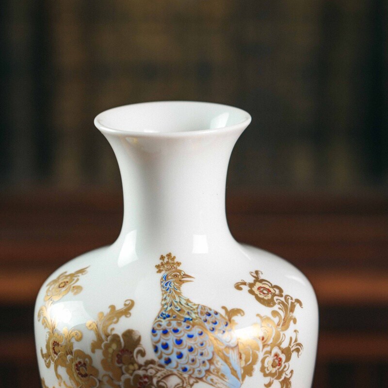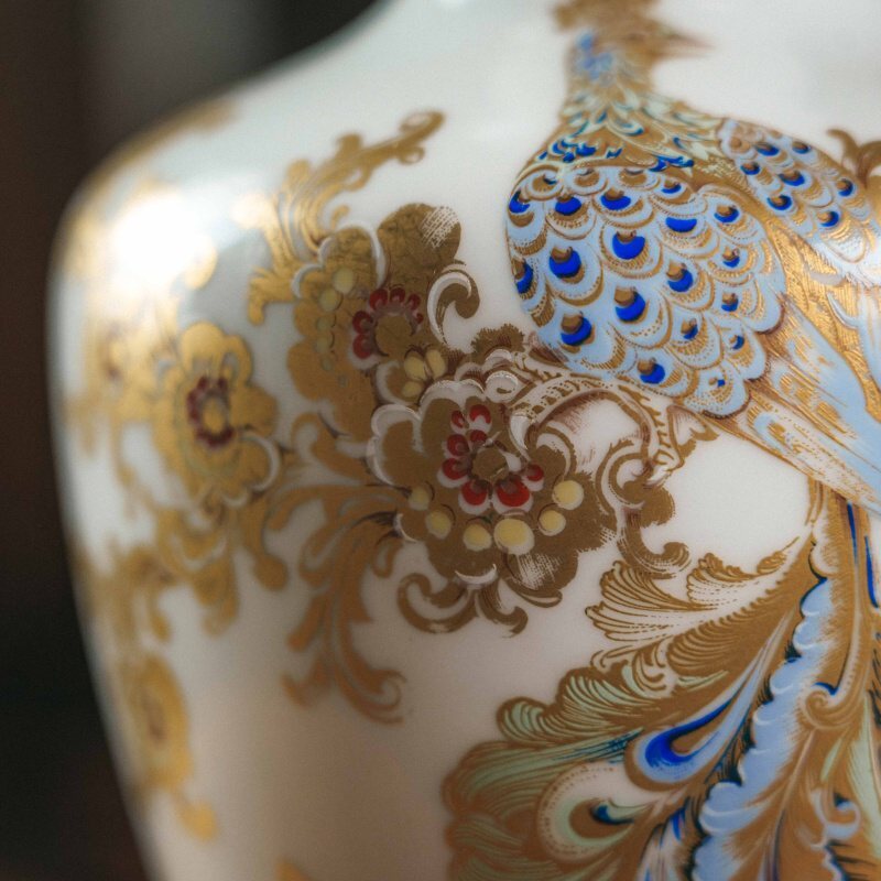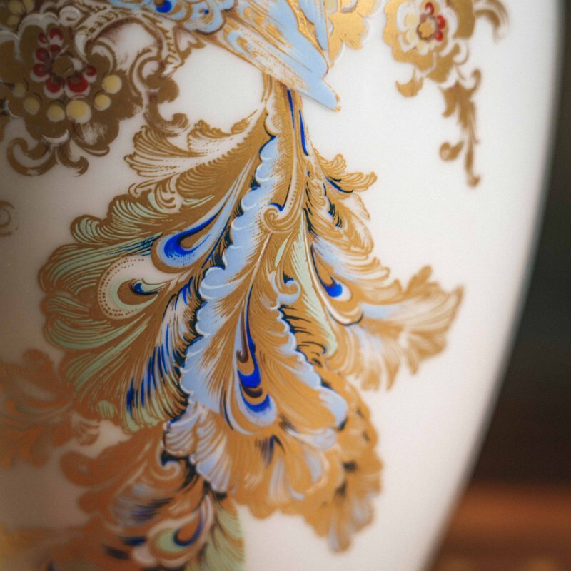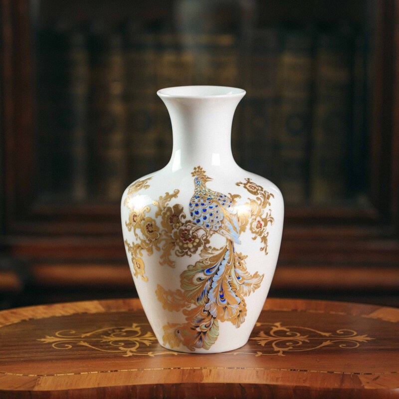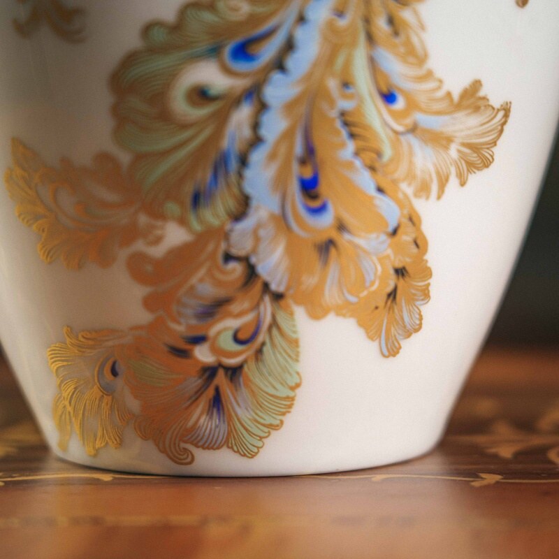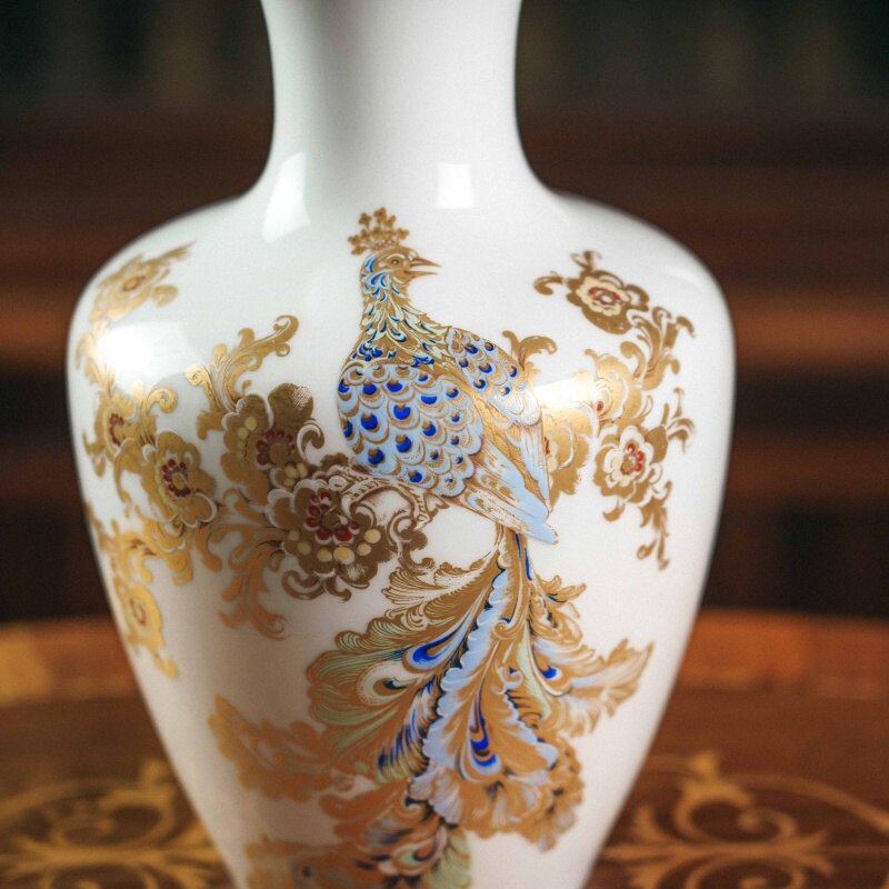 Изящная фарфоровая ваза из серии Rhapsodie, созданная знаменитой немецкой мануфактурой Al-Ka Kunst Kaiser, воплощает гармонию классической формы и утончённого декоративного орнамента. На белоснежной поверхности фарфора изображён павлин — древний символ красоты, величия и возрождения. Его роскошный хвост, выполненный в переливающихся оттенках синего и золота, дополнен изысканным флоральным орнаментом, который обрамляет фигуру птицы и создаёт ощущение торжественной декоративности. Позолота нанесена вручную и подчеркивает изящество линий, усиливая игру света на поверхности изделия. Обратная сторона вазы украшена лаконичным растительным мотивом, поддерживающим общую композицию.