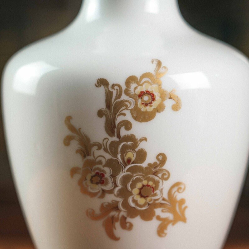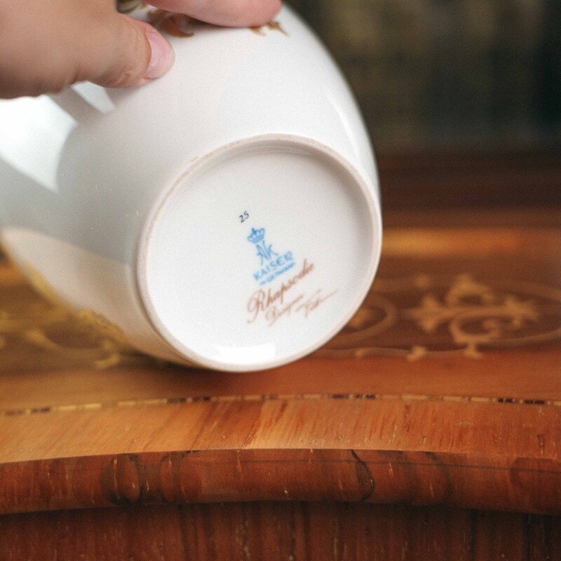 Клеймо Kaiser Germany с обозначением серии Rhapsodie подтверждает подлинность изделия и принадлежность к коллекции, известной своими тончайшими работами, сочетавшими современную эстетику и традиции немецкого фарфора. Такая ваза станет прекрасным украшением интерьера и достойным представителем коллекции европейского декоративного искусства XX века.
