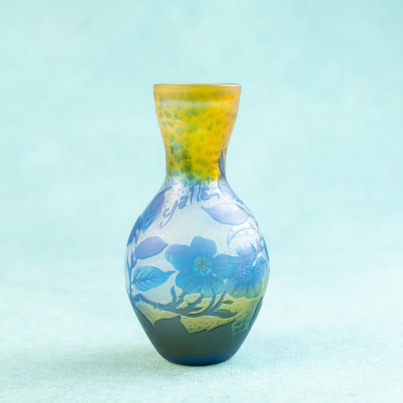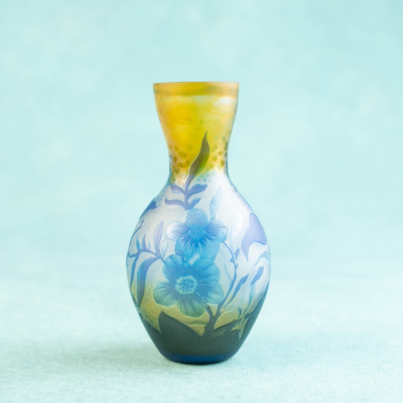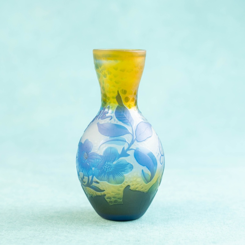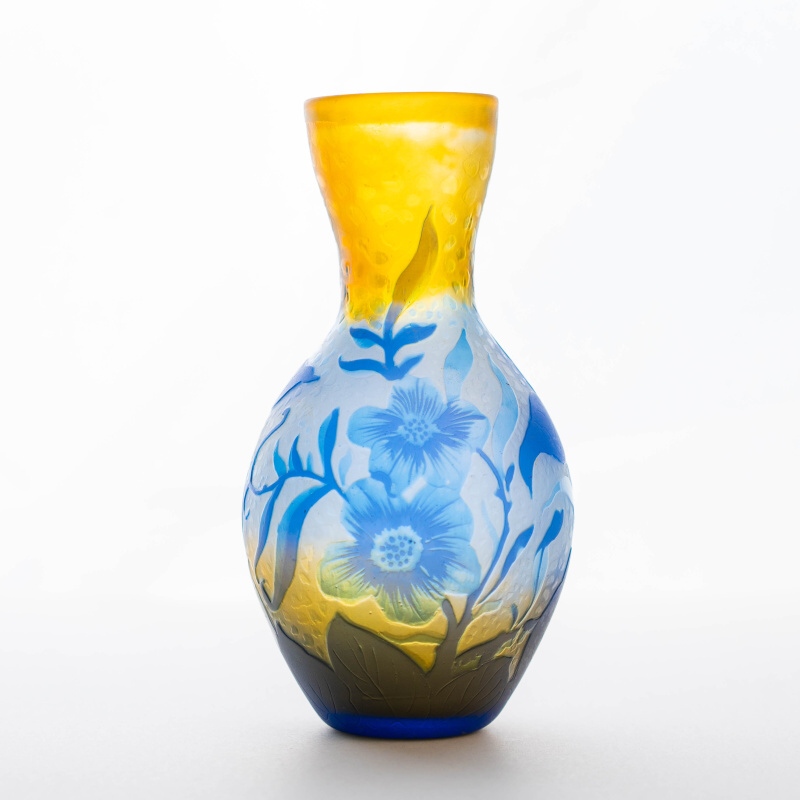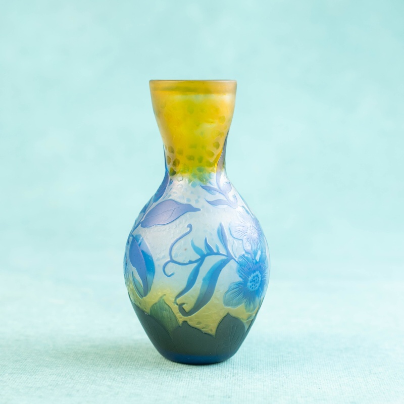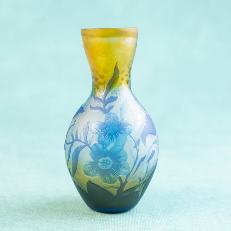 Утонченная вазочка выполнена в стиле французского художника и изобретателя Эмиля Галле, который соединил стекло и ботанику. На данной вазочке изображены синие цветы на желтом и голубом фоне. Благодаря технике многослойного стекла, мастер виртуозно изобразил как передний план, так и дальний, где четко изображена игра теней и полутонов.