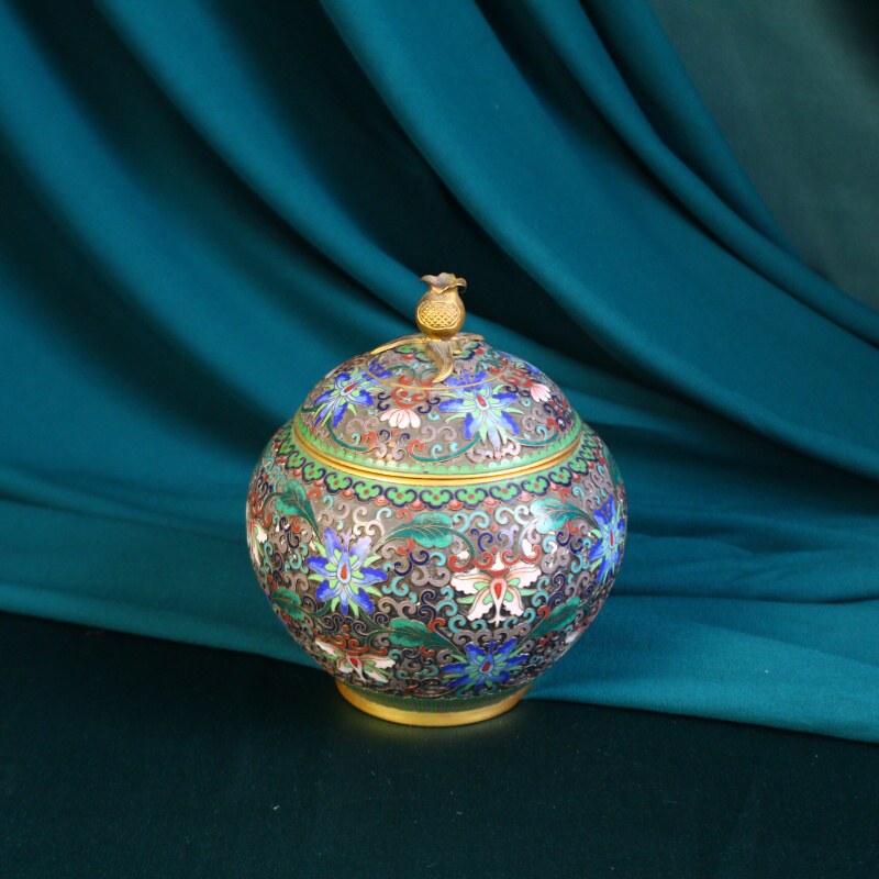 Милая ваза-чайница с крышкой. Поверхность вазы украшает изображение лотосов. Лотос — символ победы духа над чувствами, символ мудрости обладающего знанием. Этот цветок соотносится с Манжушри, бодхисатвой мудрости. Ручка на крышке выполнена в форме спелого граната. В Китае гранат символизирует изобилие, плодородие, многочисленное и добродетельное потомство, счастливое будущее. Гранатовое дерево — образец жизненной силы и выносливости, ведь оно способно произрастать даже на безводной почве пустыни, что позволило растению распространиться по землям Востока, Азия, Африки. Издревле удивительный плод всегда связывался с понятиями изобилия и вечной жизни.