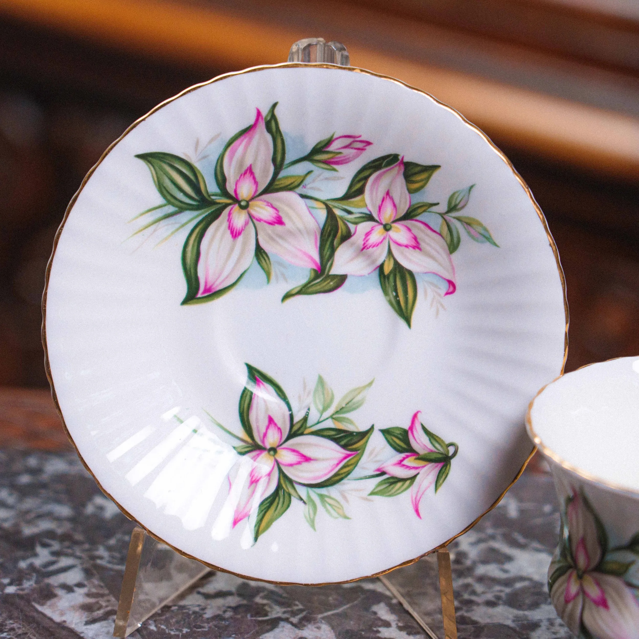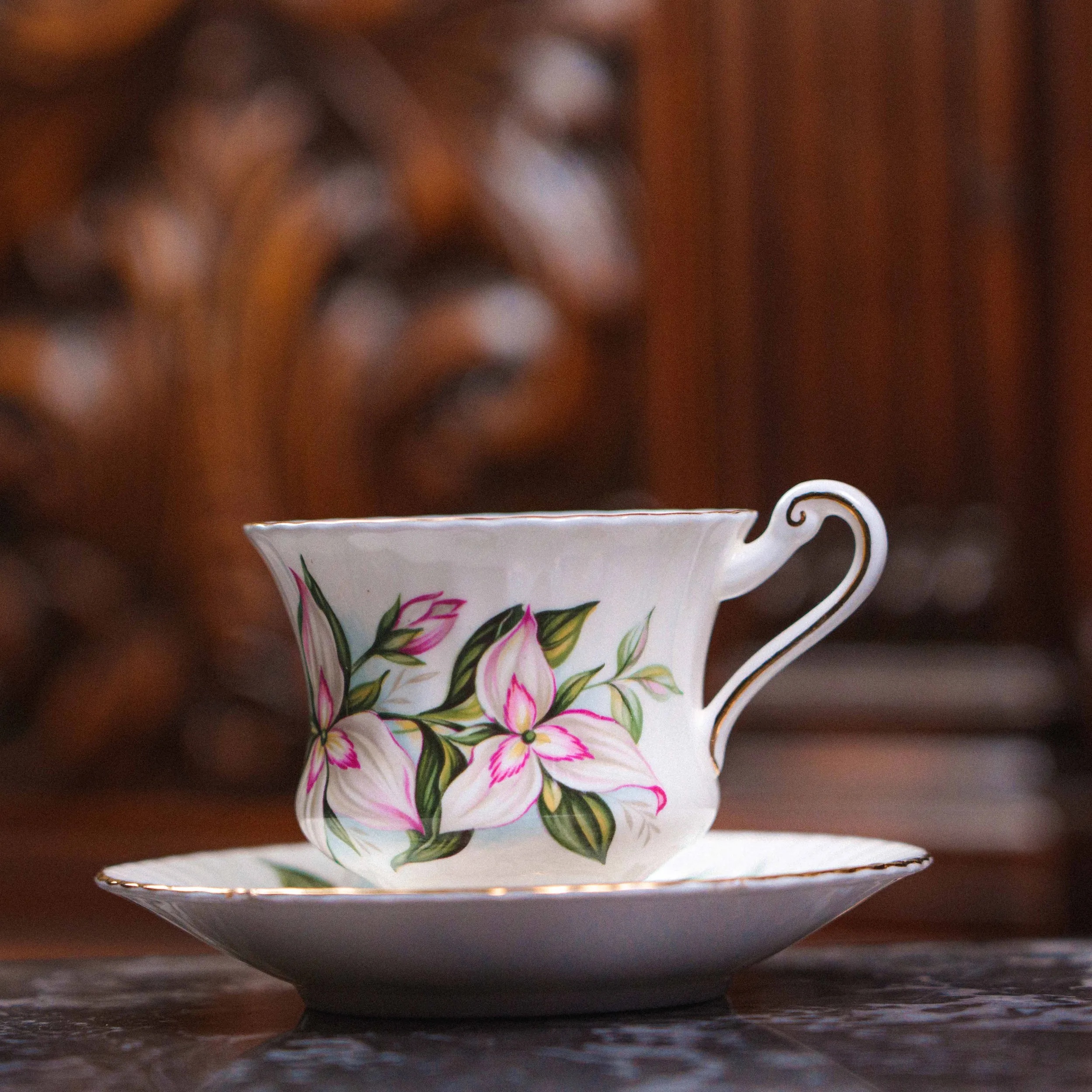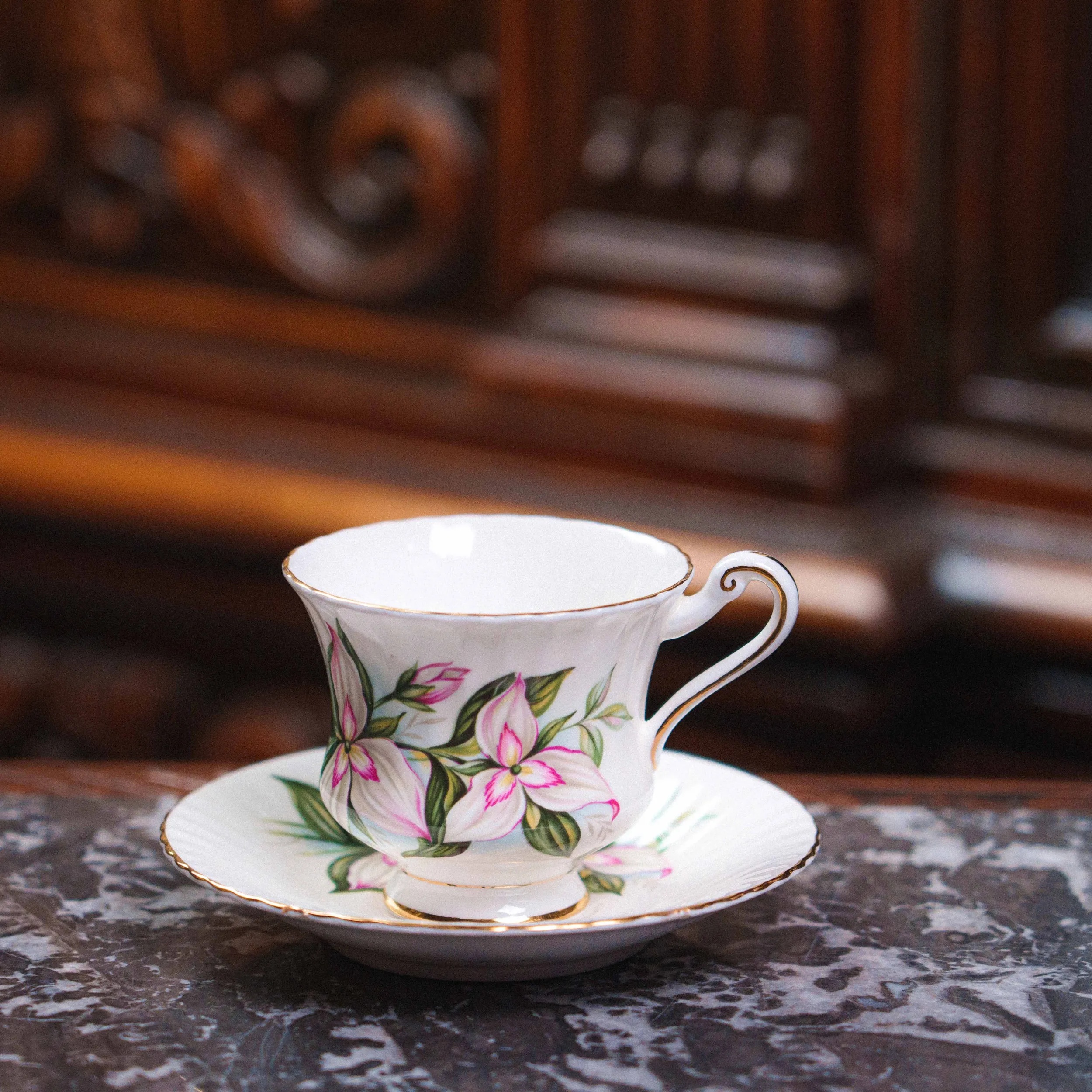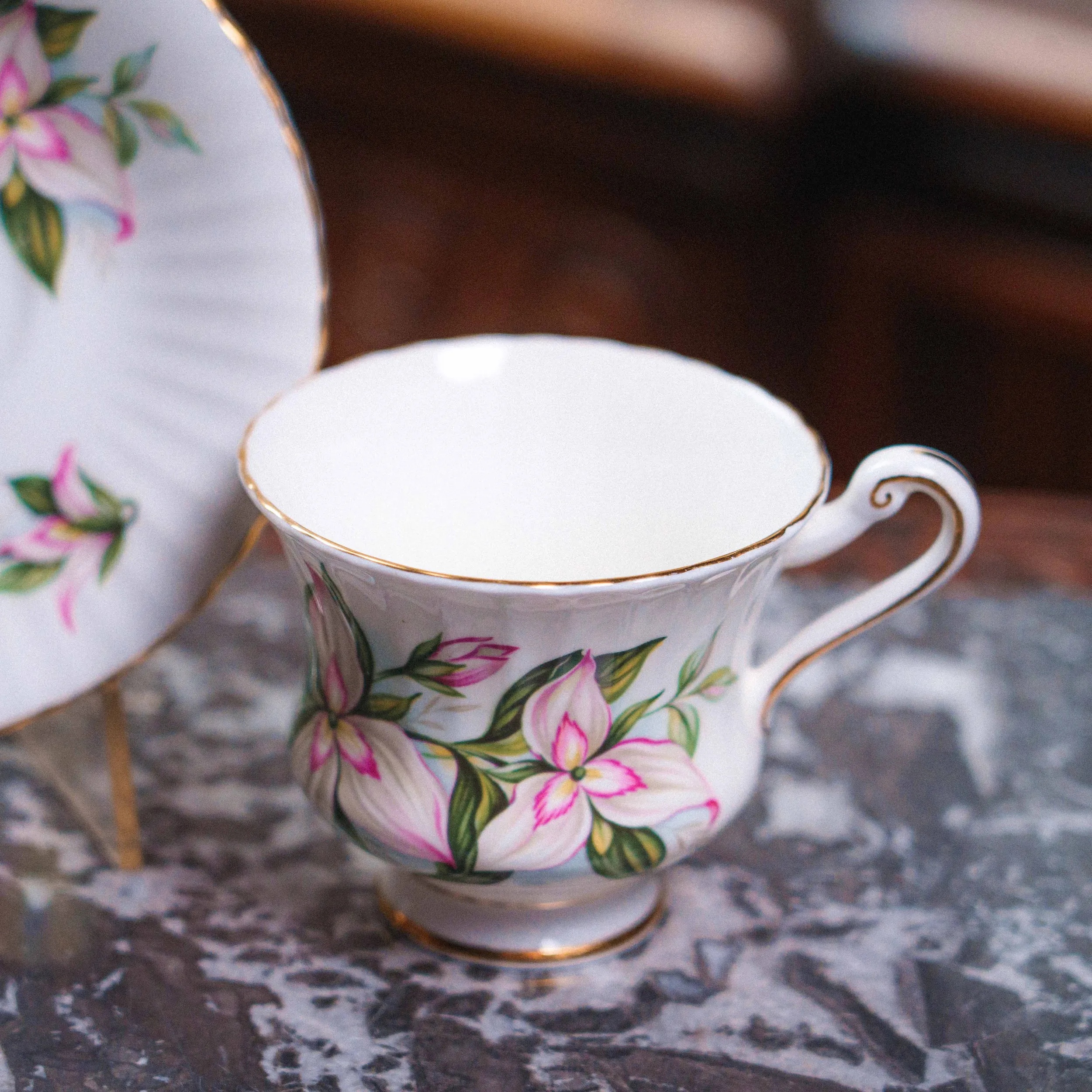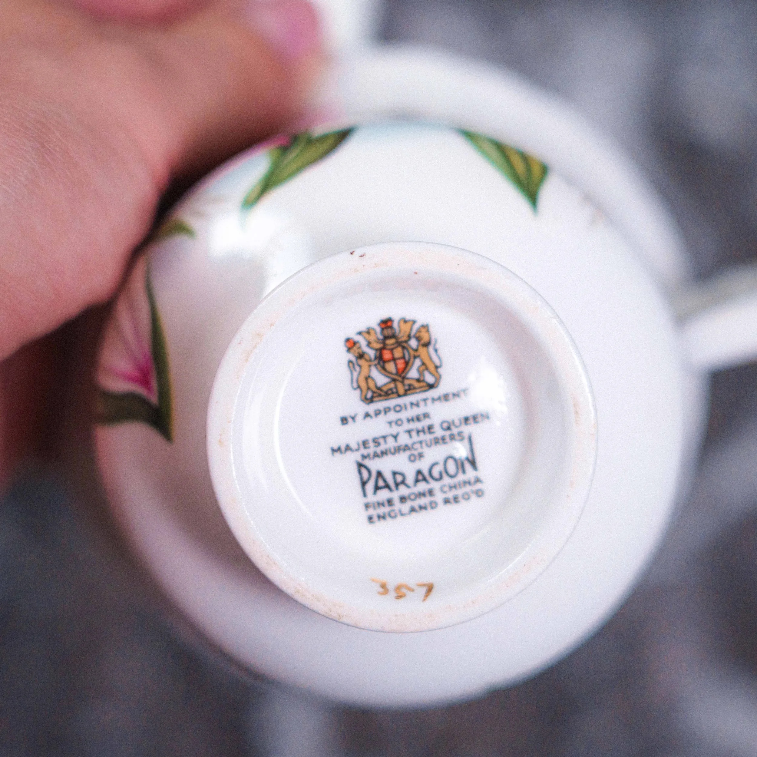 Чашка и блюдце выполнены из тонкого fine bone china — лёгкого, полупрозрачного фарфора высокого качества. Поверхность украшена нежным цветочным декором с розово-зелёными оттенками, выполненным в классической английской традиции середины XX века. Контуры подчеркнуты аккуратной золотой окантовкой, придающей сервизу утончённый и благородный вид.