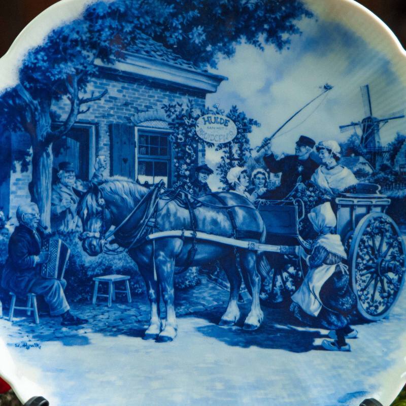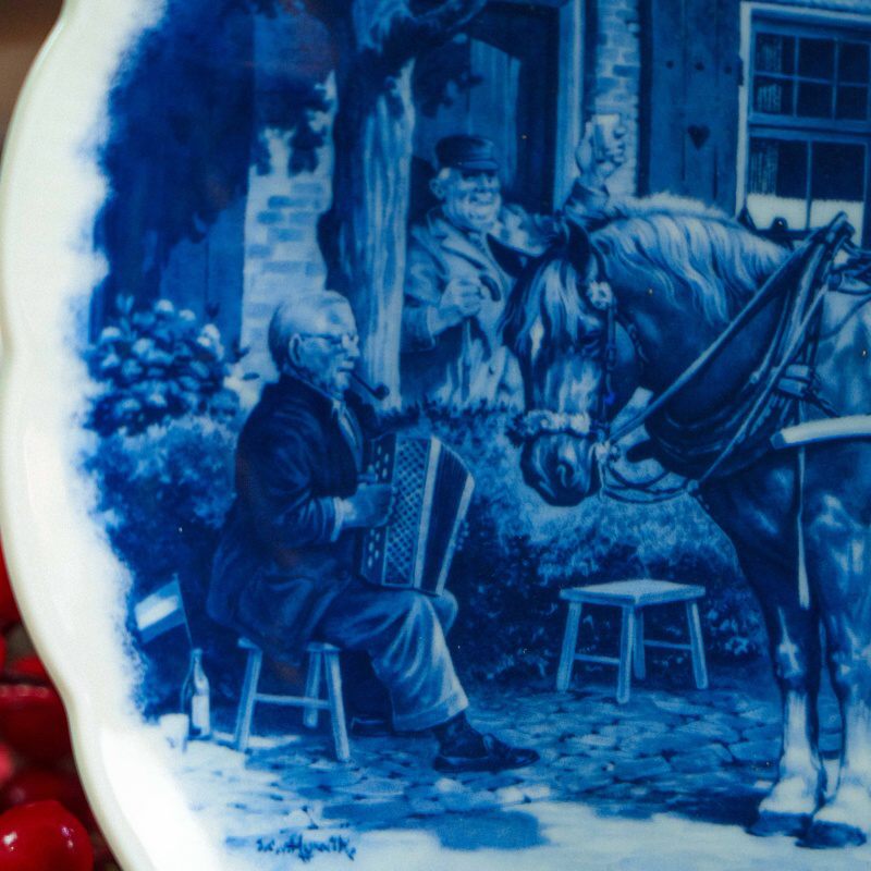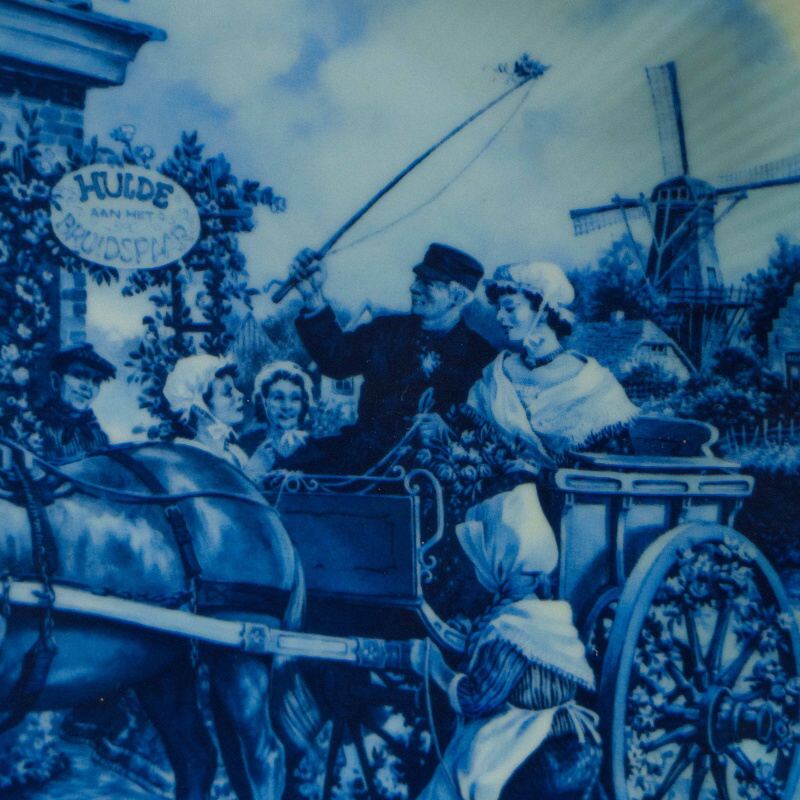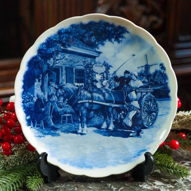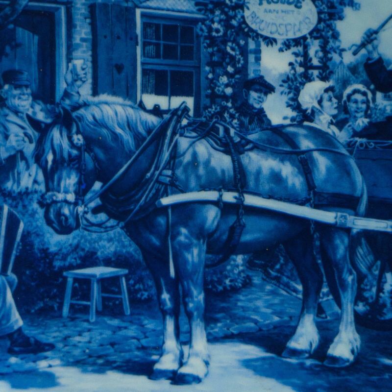 Центральная сцена изображает жанровый сюжет из повседневной жизни Нидерландов: конная упряжка у сельской таверны, фигуры людей в исторических костюмах, динамика и внимание к деталям создают живую, почти повествовательную композицию. Характерная сине-белая роспись подчёркивает глубину сюжета и отсылает к классическим образцам Delft XVII–XIX веков.