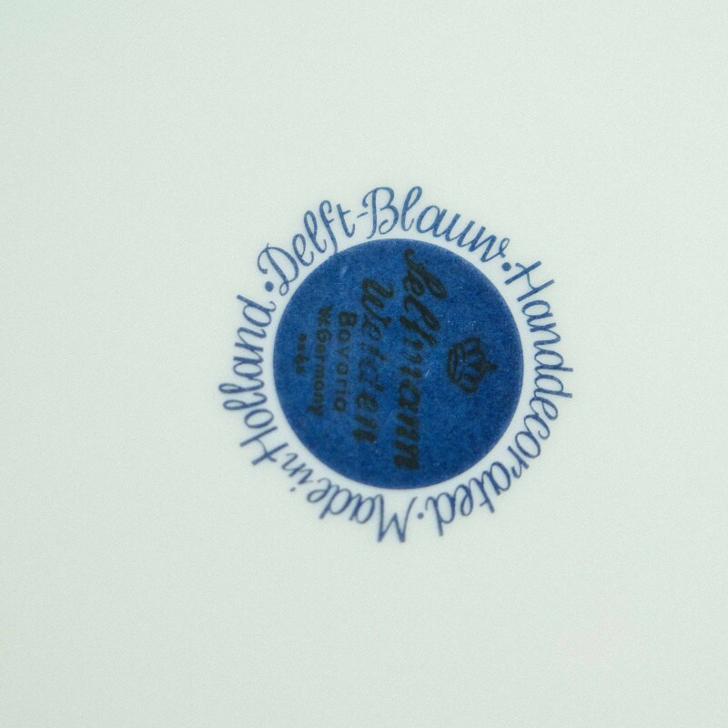Тарелка имеет фигурный волнистый край, что усиливает декоративный эффект и делает предмет особенно выразительным в интерьере. На оборотной стороне присутствует клеймо Holland Delft Blue – Handdecorated, подтверждающее ручную роспись и голландское происхождение. Такие тарелки традиционно выпускались как интерьерные и коллекционные изделия, предназначенные для украшения стен или витрин.