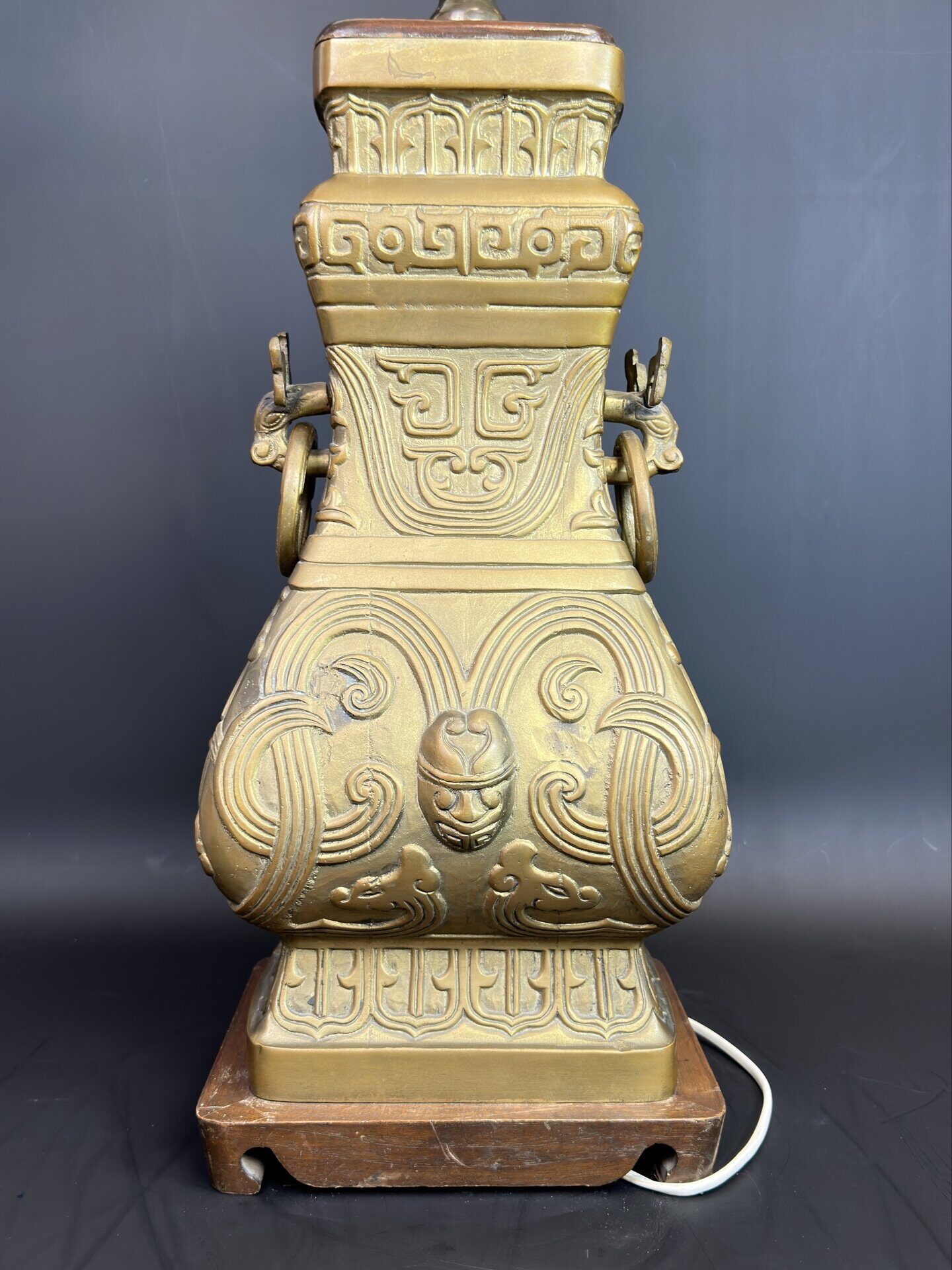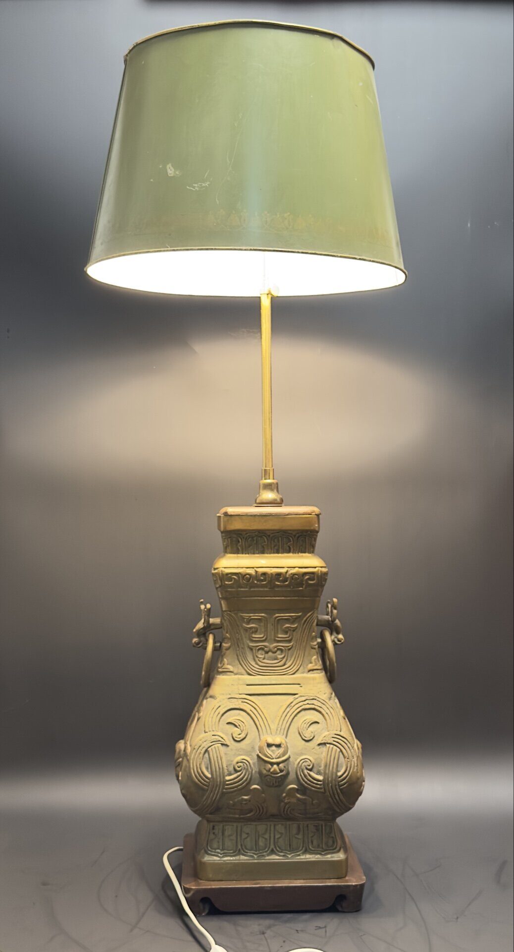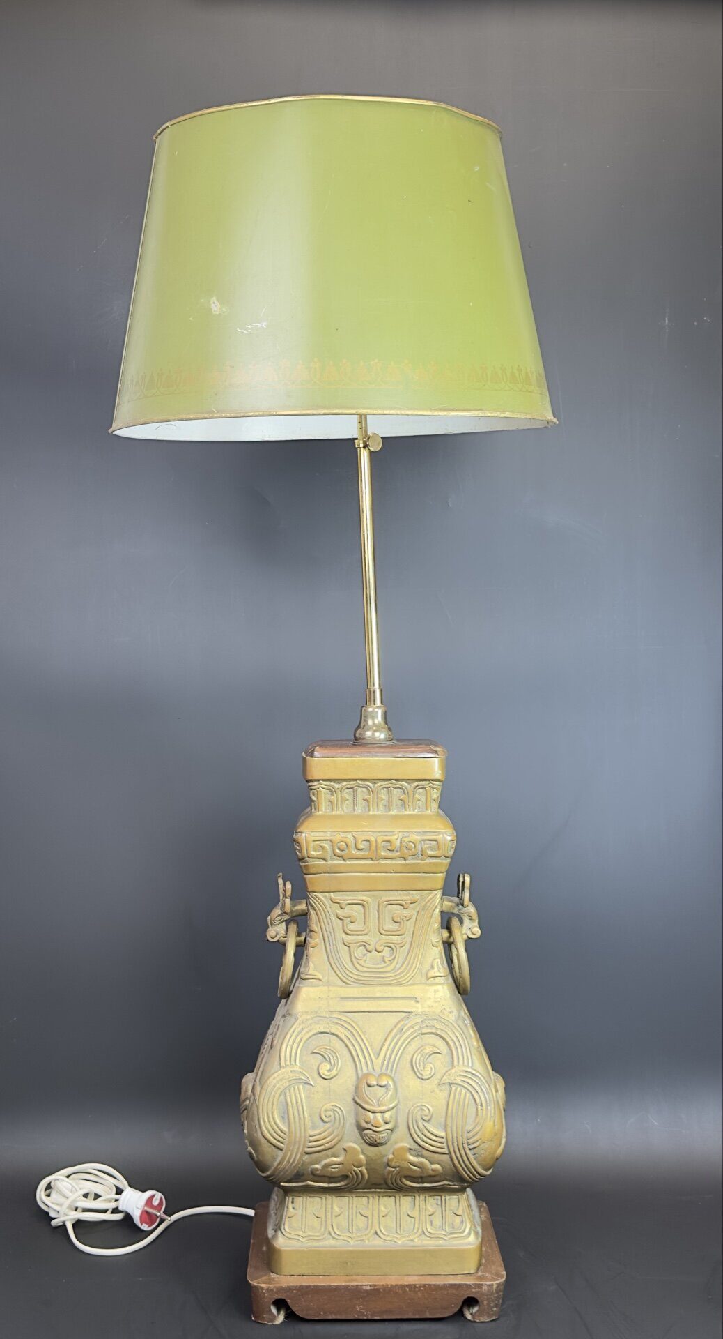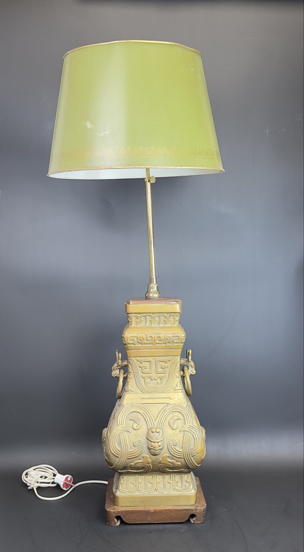Основание лампы изготовлено из бронзы с антикварной отделкой и украшено замысловатыми узорами, напоминающими азиатские мотивы.