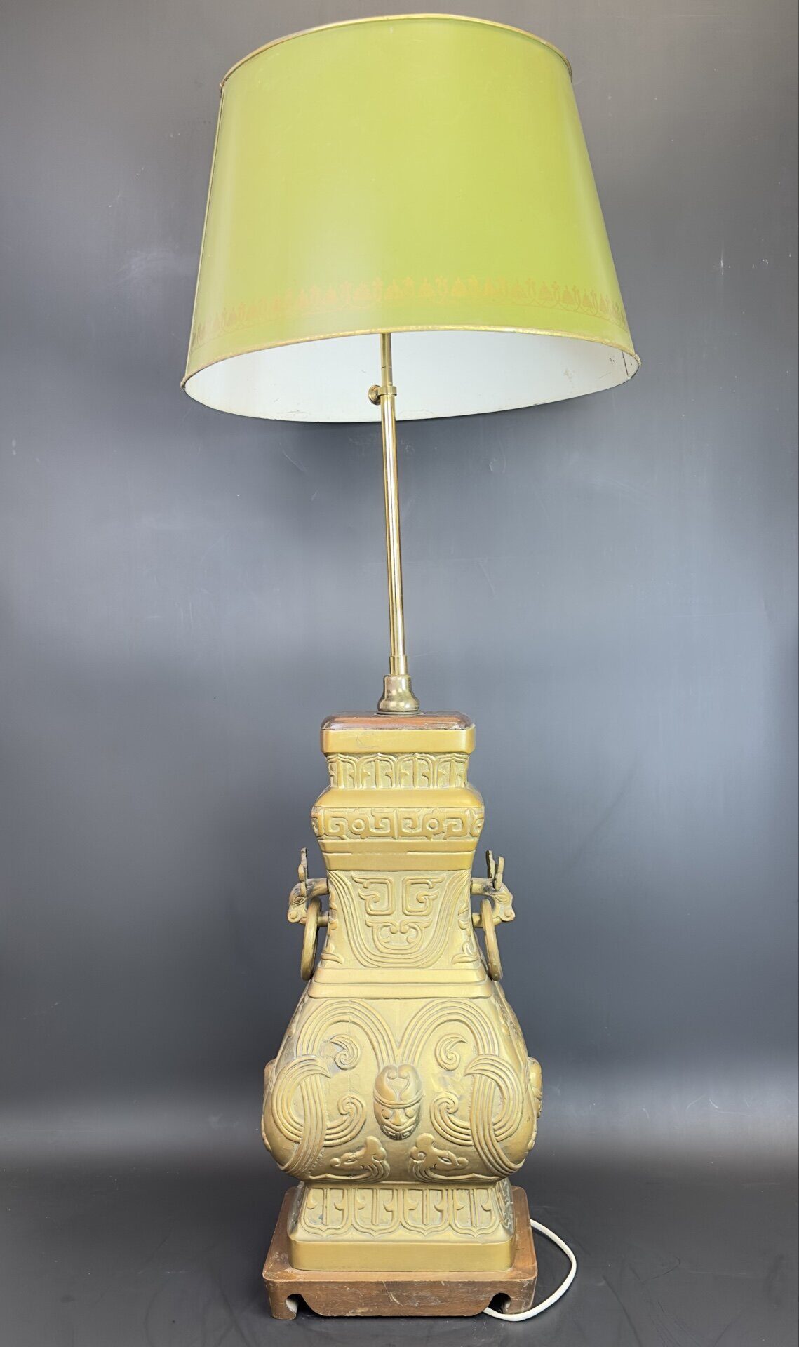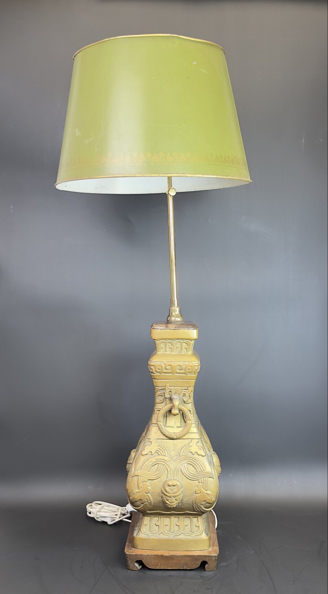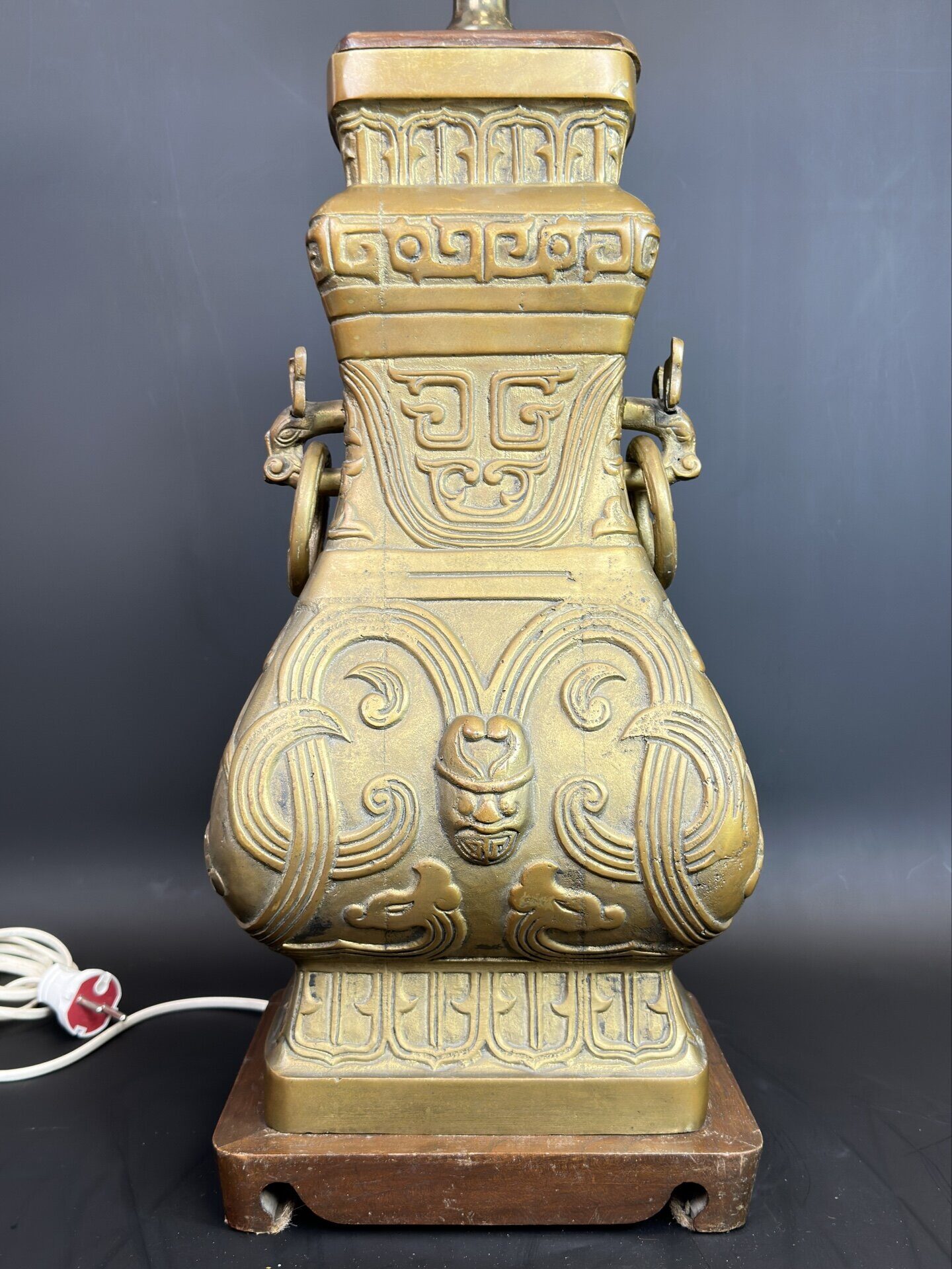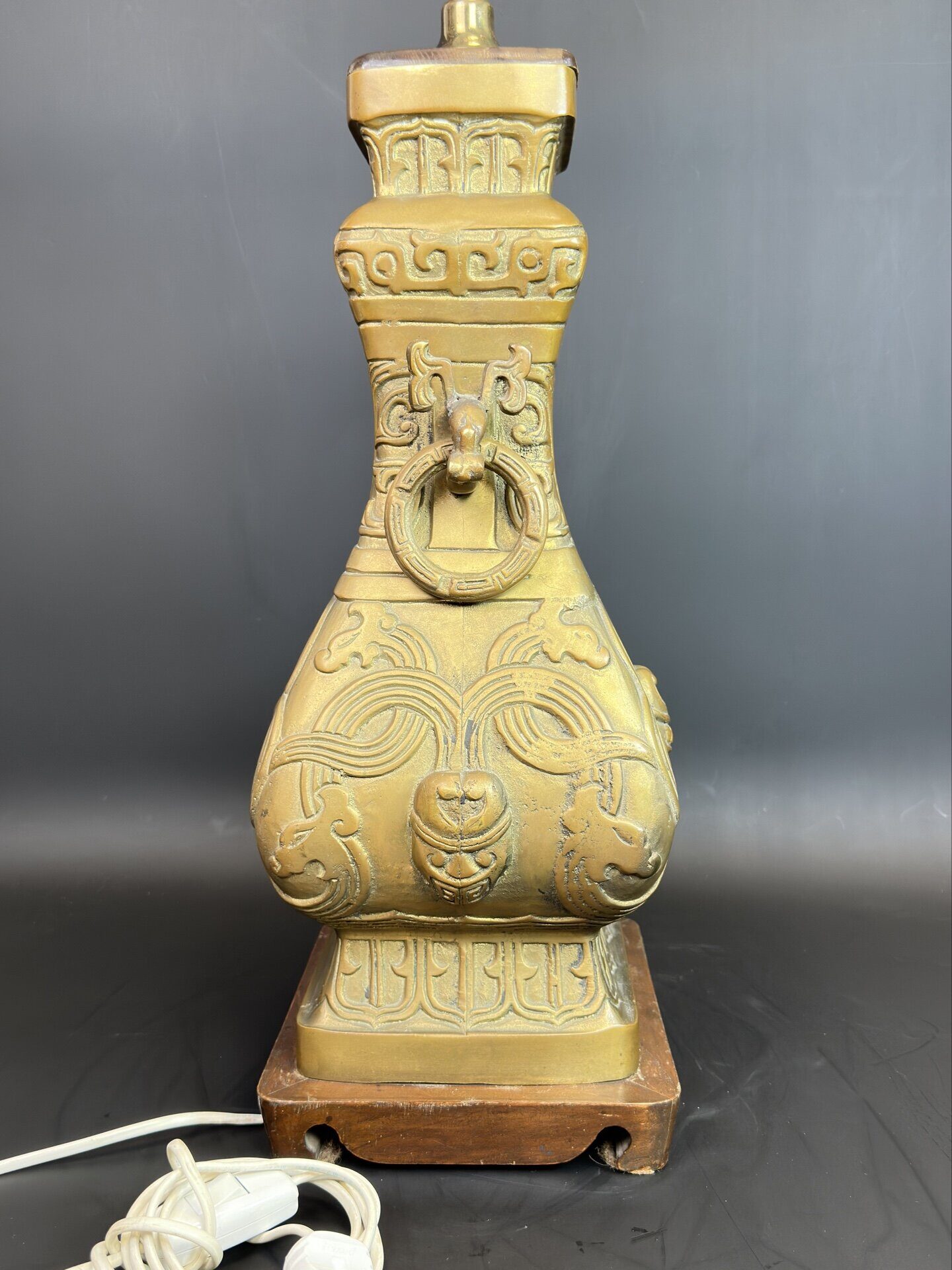 Основание лампы изготовлено из бронзы с антикварной отделкой и украшено замысловатыми узорами, напоминающими азиатские мотивы.