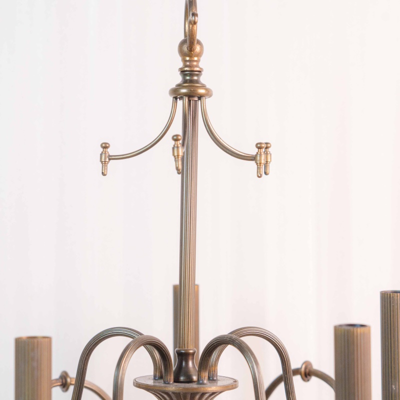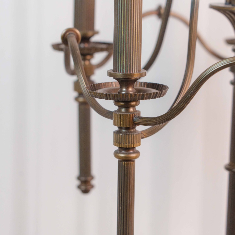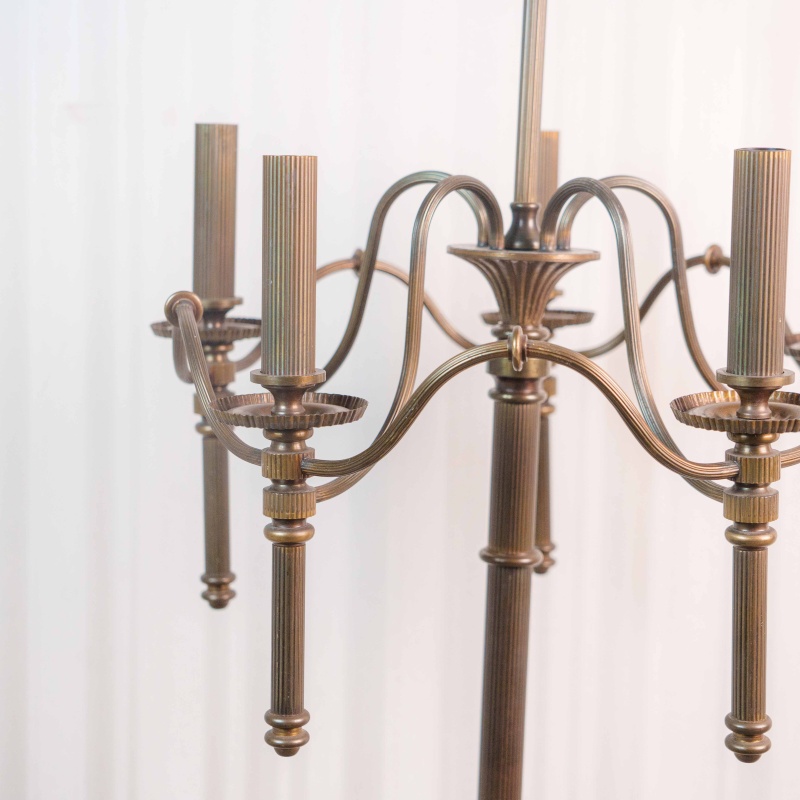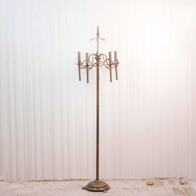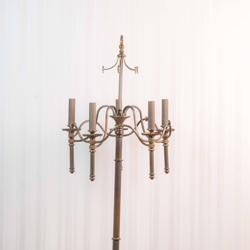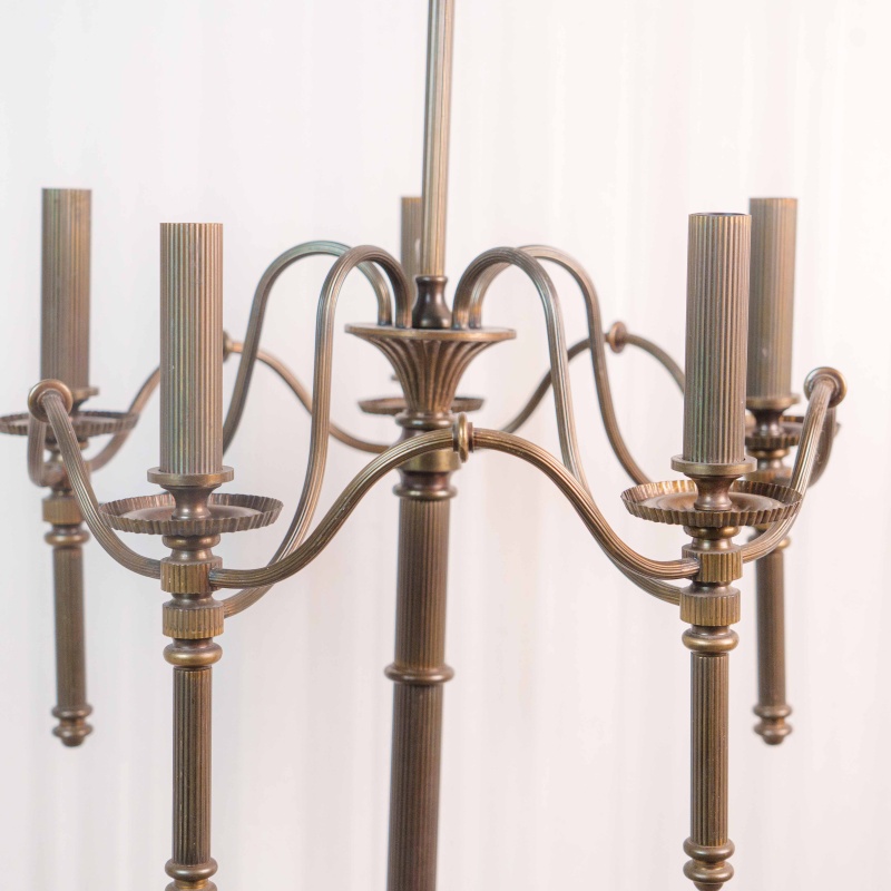 Элегантный торшер из благородной латуни с патиной станет стильным акцентом в классическом интерьере. Изящная конструкция с пятью светильниками в форме канделябра придаёт предмету особую утончённость и создаёт атмосферу уюта и тепла.