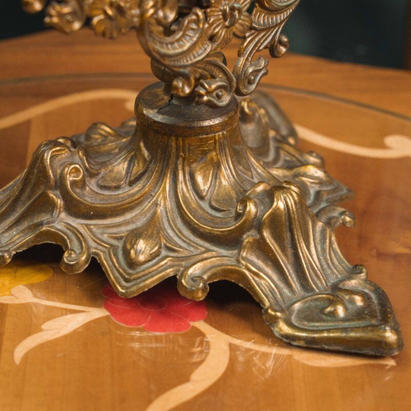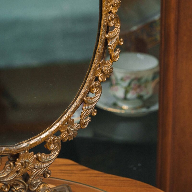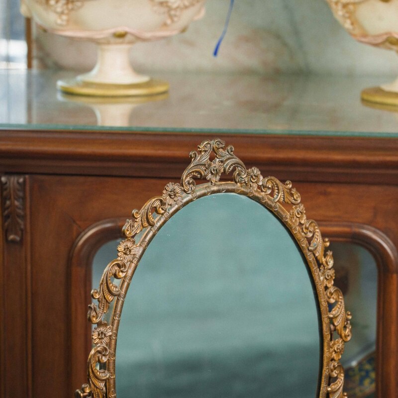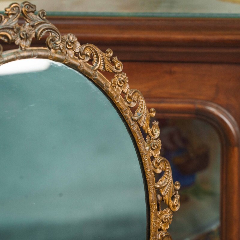 Настольное зеркало из бронзы предстает как эффектный декоративный предмет, созданный в пышной эстетике позднего историзма. Оно выполнено из массивного бронзового литья тёплого тёмно-золотистого оттенка, а его главное выразительное качество — богатая, практически скульптурная рама. Круглый зеркальный диск обрамлён плотным орнаментальным поясом, состоящим из чередующихся завитков, акантовых листьев и мелких декоративных выступов, создающих сложную волнообразную линию по окружности. Орнамент густой и рельефный, благодаря чему зеркало производит впечатление драгоценного интерьерного акцента.