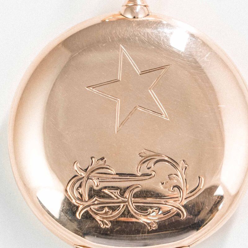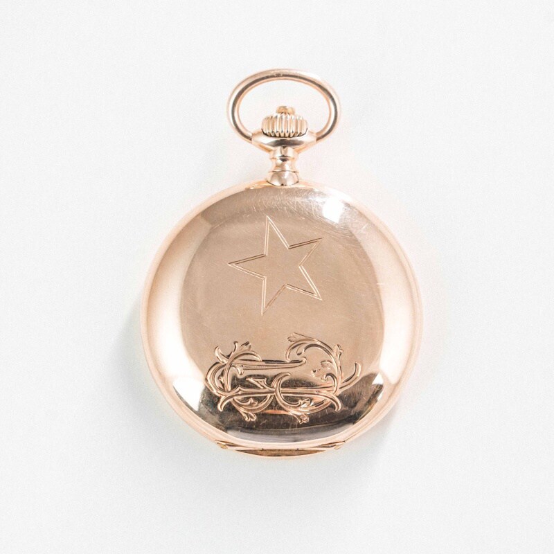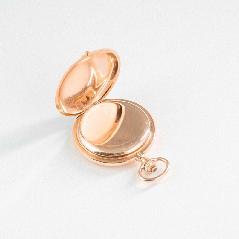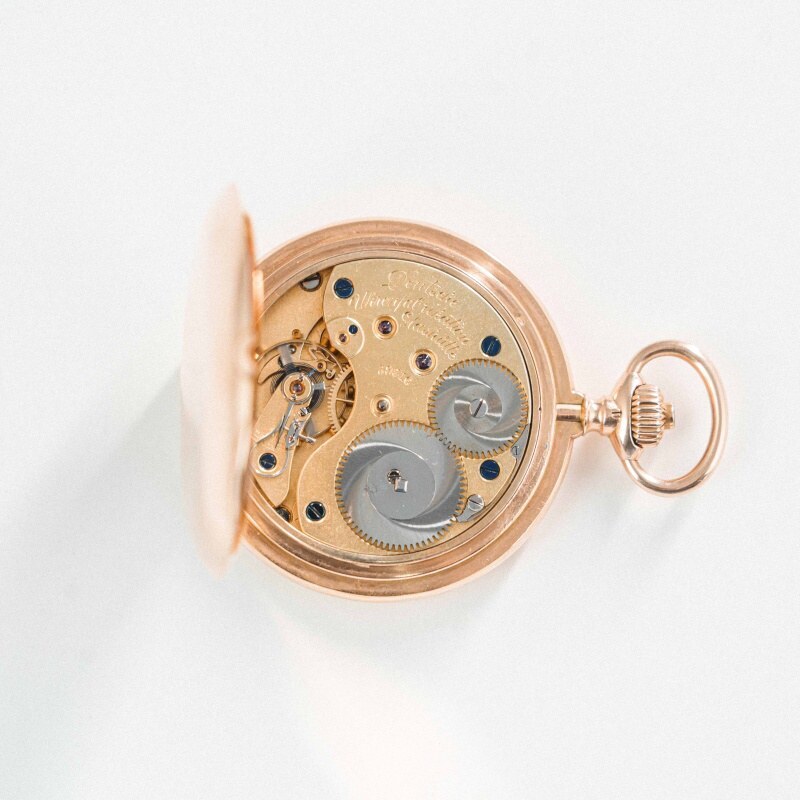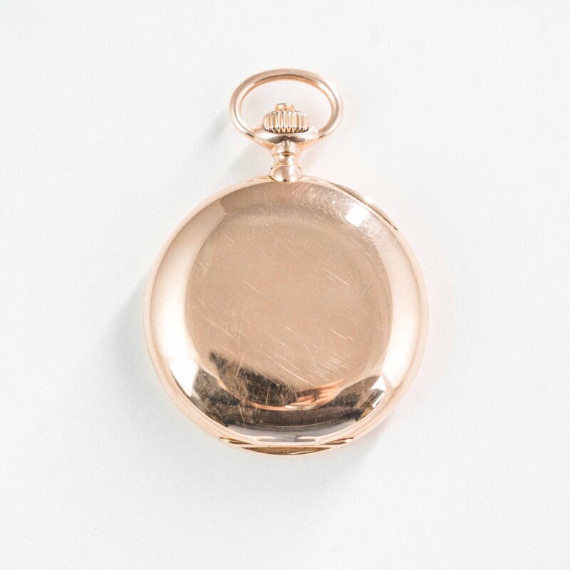 Материал: Золото - 585 пробы. Циферблат из белой эмали с арабскими черными цифрами, на нижней части циферблата указано имя известного немецкого часового дома «A.Lange & Sohne, Glashütte». Часы в оригинальной коробке и документами.
