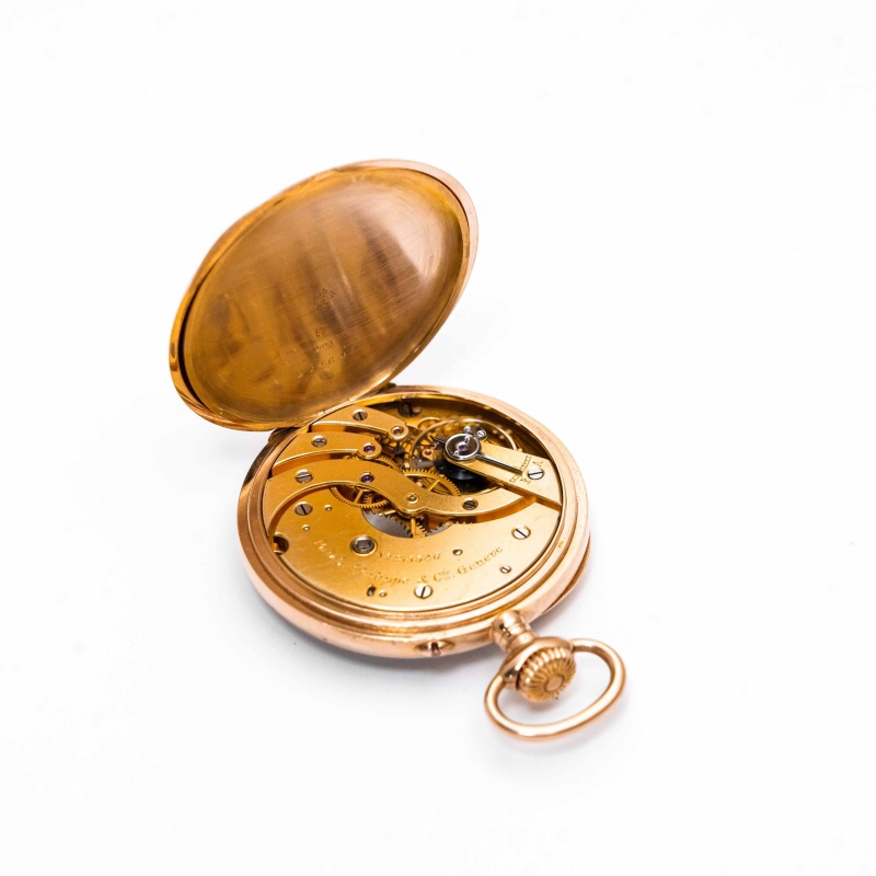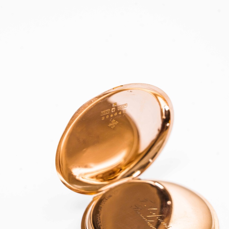 Классические карманные часы швейцарского часового бренда «Patek, Philippe & Cie». Исполненные на высочайшем уровне, карманные часы сочетают в себе типичные элементы стиля рубежа XIX—XX веков. Корпус золотой, клейма пробы 18K, подтверждающее что корпус изготовлен из массивного золота 750 пробы.