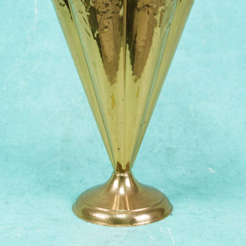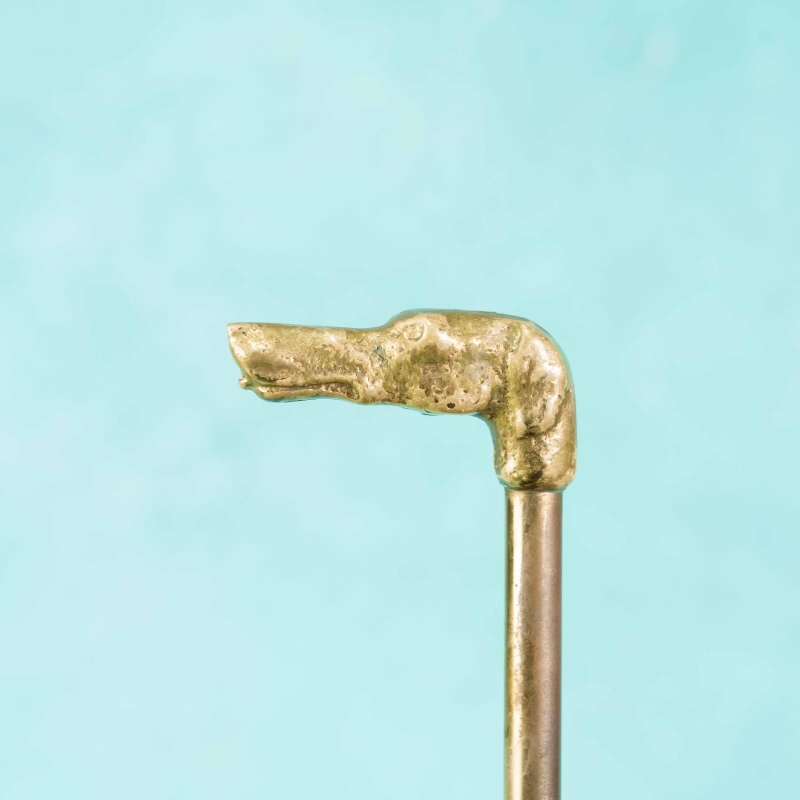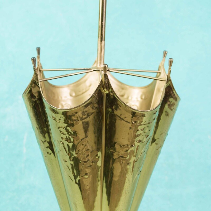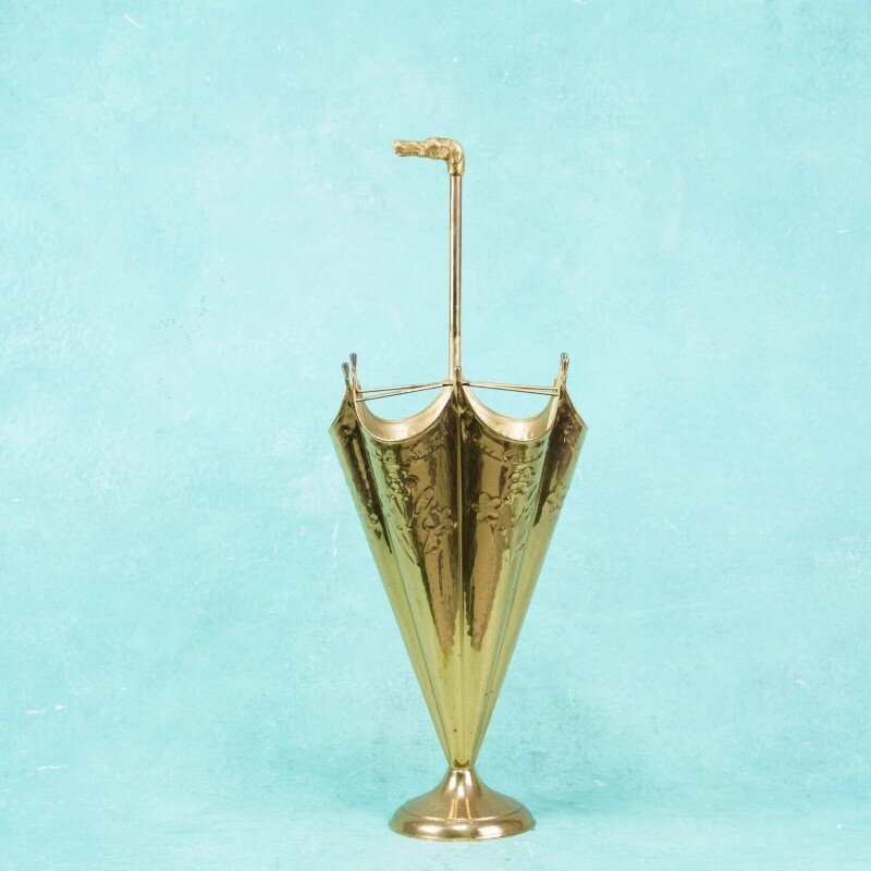 Зонтница из латуни, выполненная в форме раскрытого зонта, является стильным примером декоративно-прикладного искусства середины XX века. Корпус изделия имеет продольные грани, напоминающие складки ткани, украшенные тонким растительным орнаментом. Особое внимание привлекает верхняя часть — в центре установлен стержень с фигурным завершением в виде собачьей головы, что придаёт зонтнице оригинальность и утончённый характер.